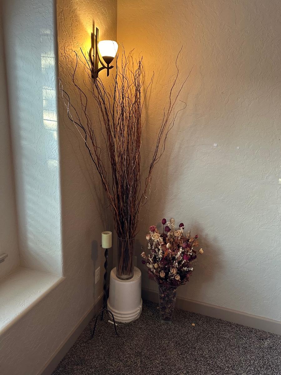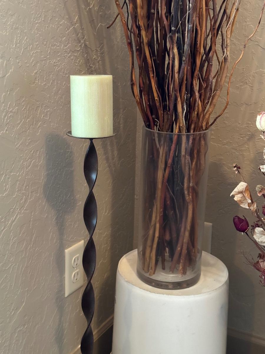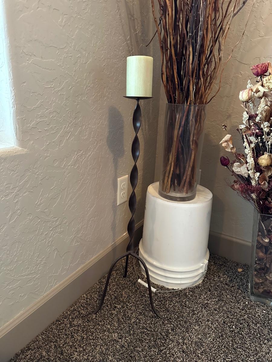 IRON FLOOR CANDLE HOLDER WITH DRIED FLOWERS AND FOLIAGE