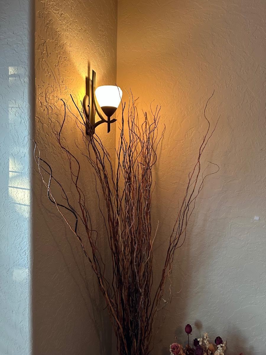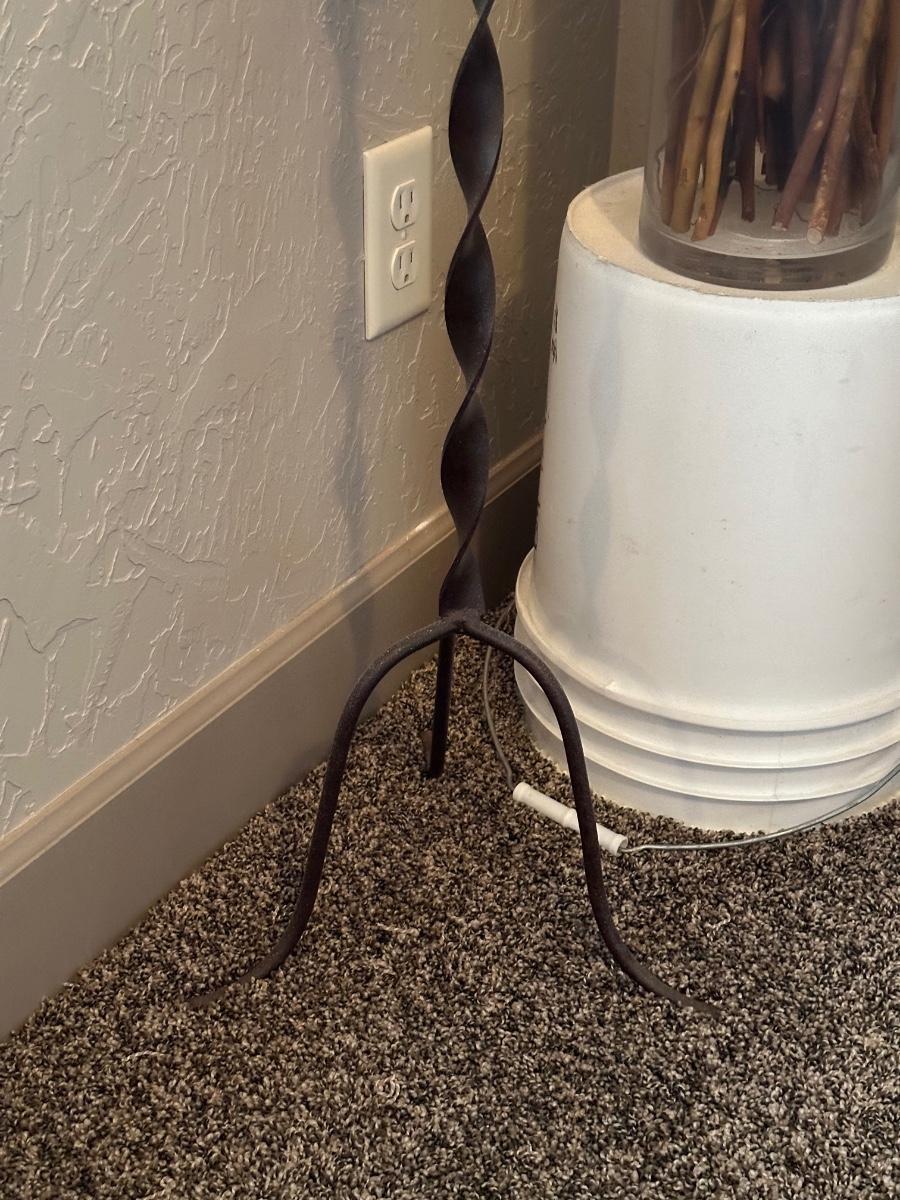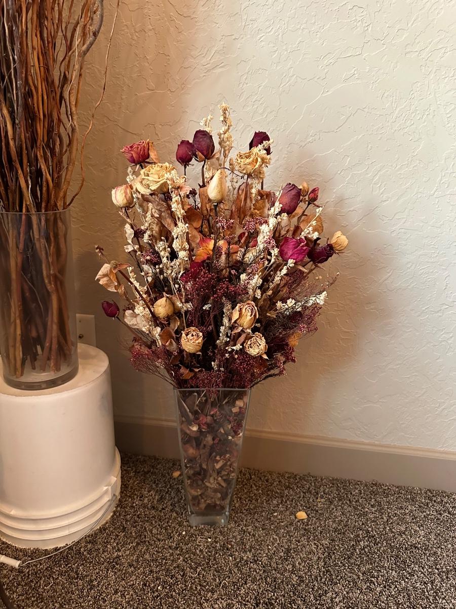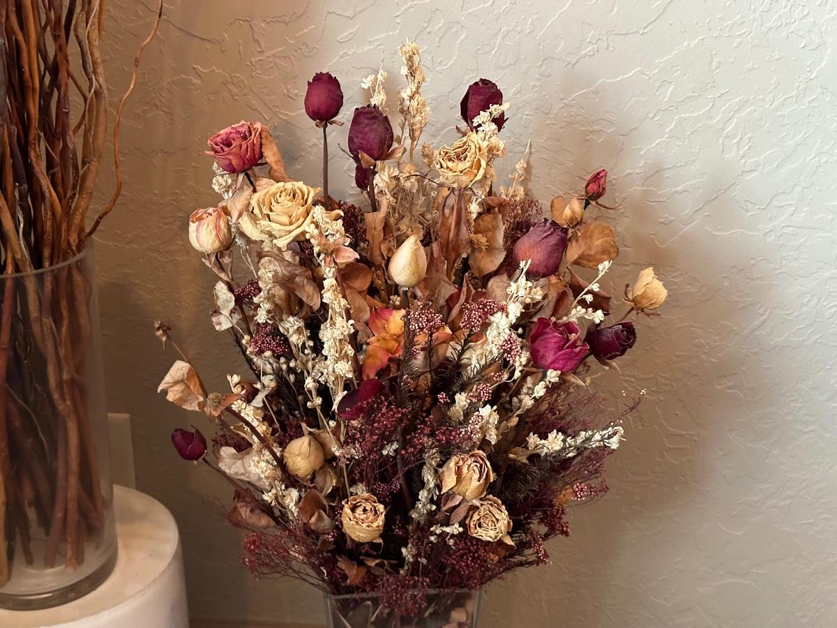 IRON FLOOR CANDLE HOLDER WITH DRIED FLOWERS AND FOLIAGE