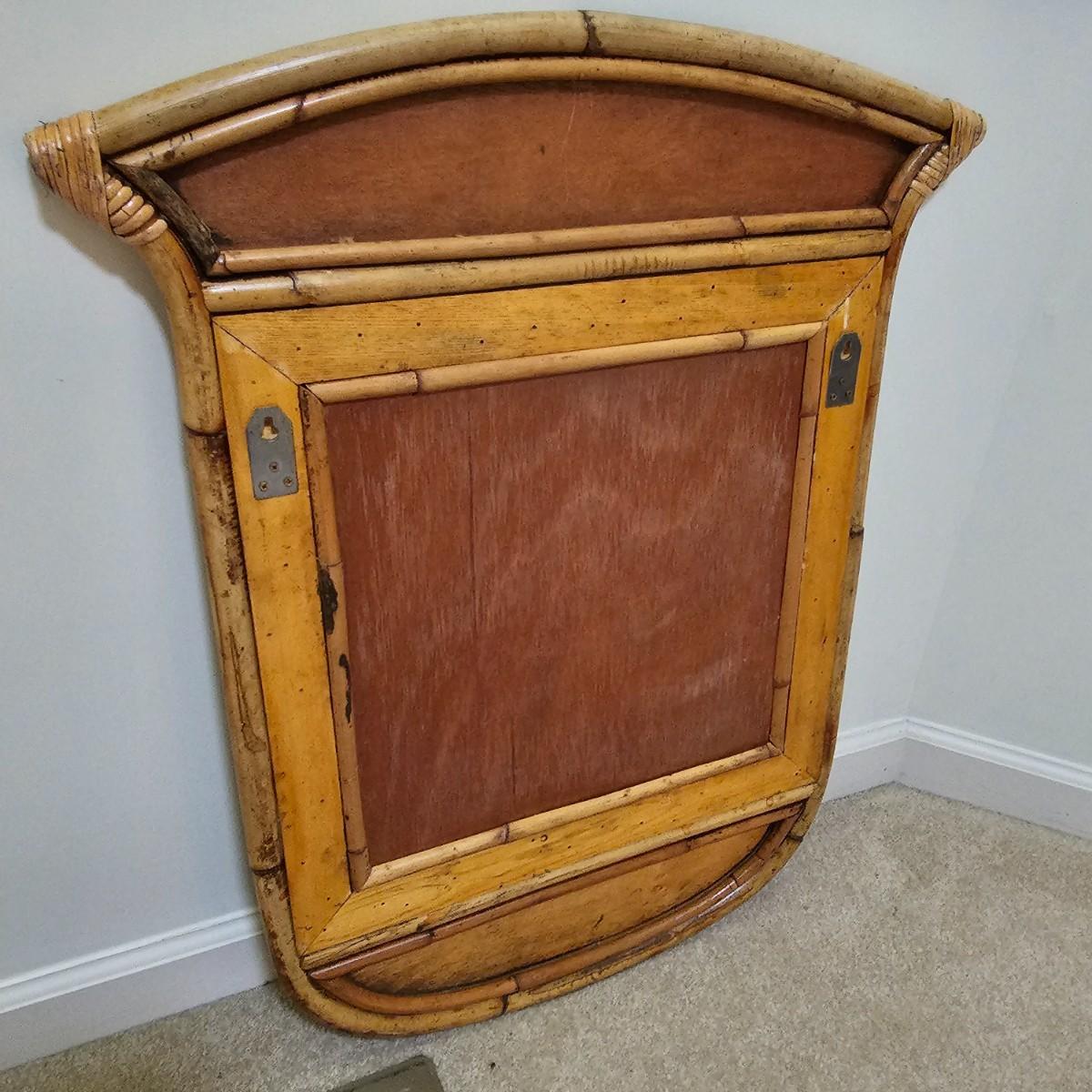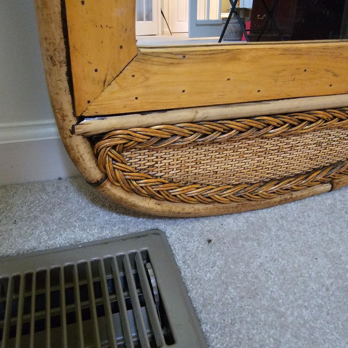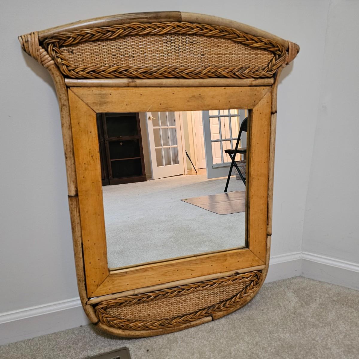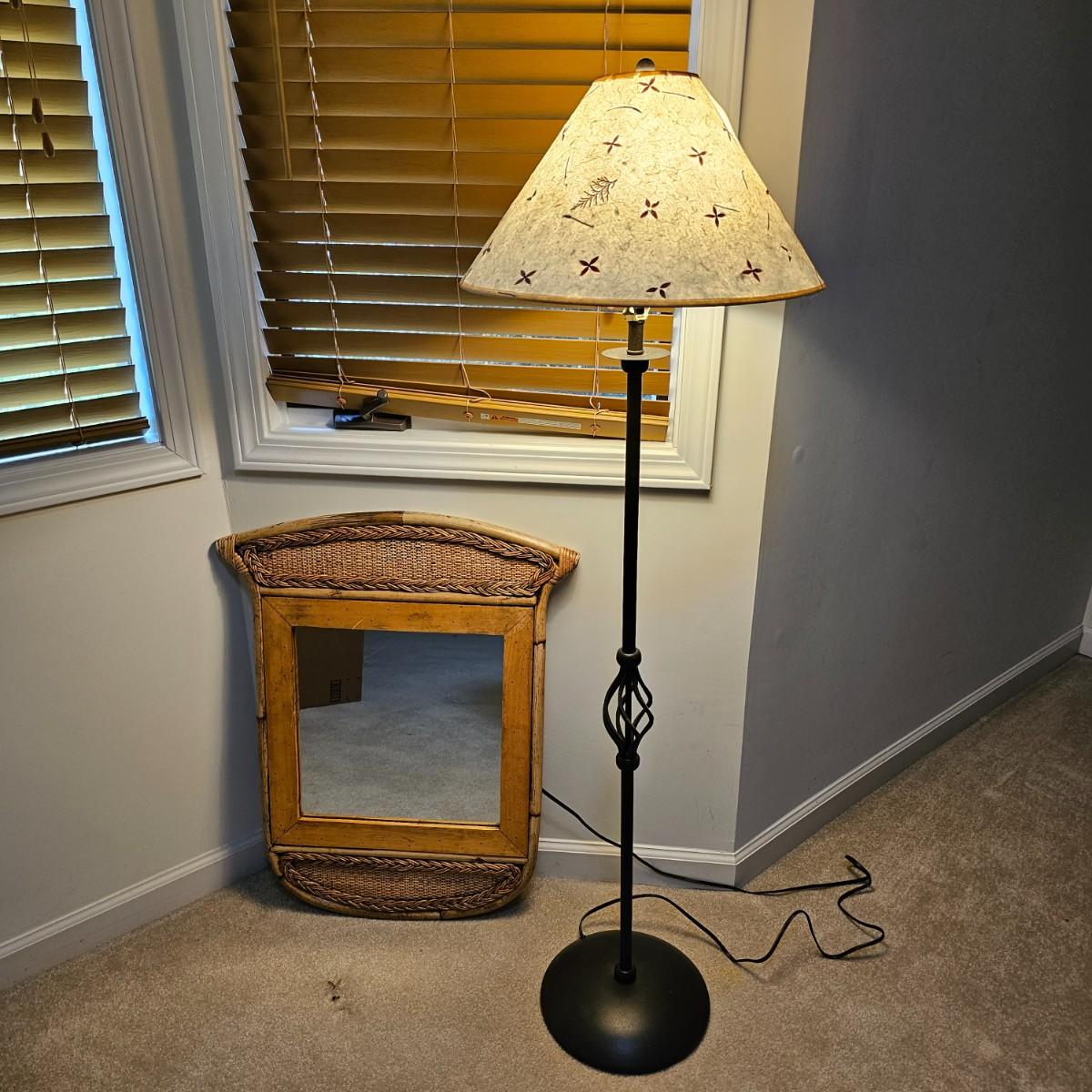 An iron base/stand floor lamp and a wicker/bamboo frame mirror. Lamp has 17"D shade, stands 56"H and will take a 3-way bulb. Powered on when plugged in. Mirror has wicker and bamboo framing, is 24" x 30"H, has hangers on back. See photos for details. Local pickup only.