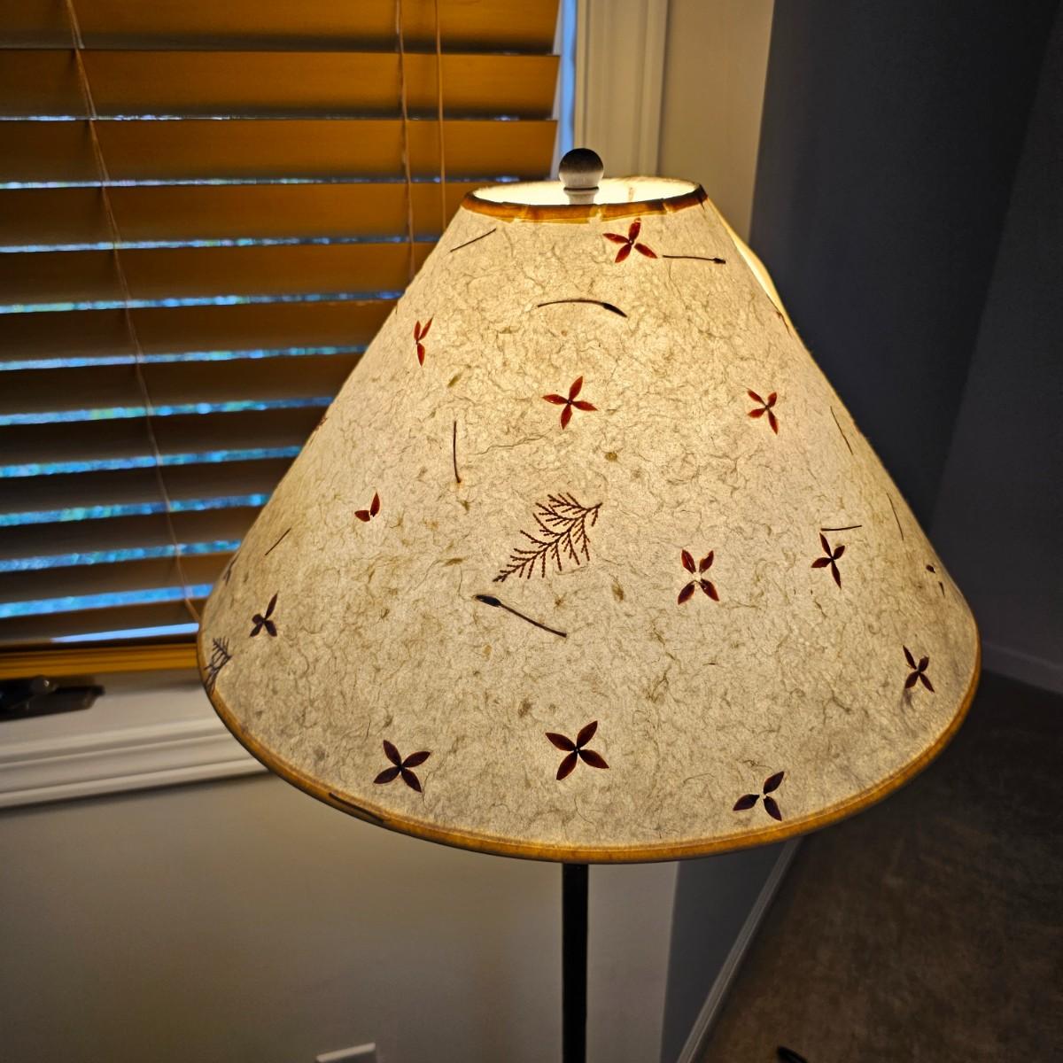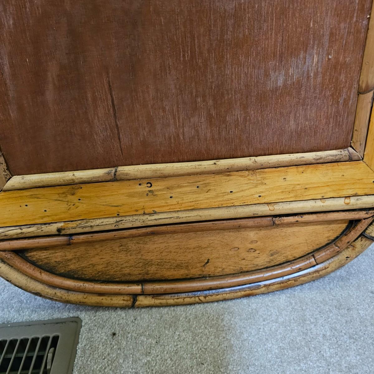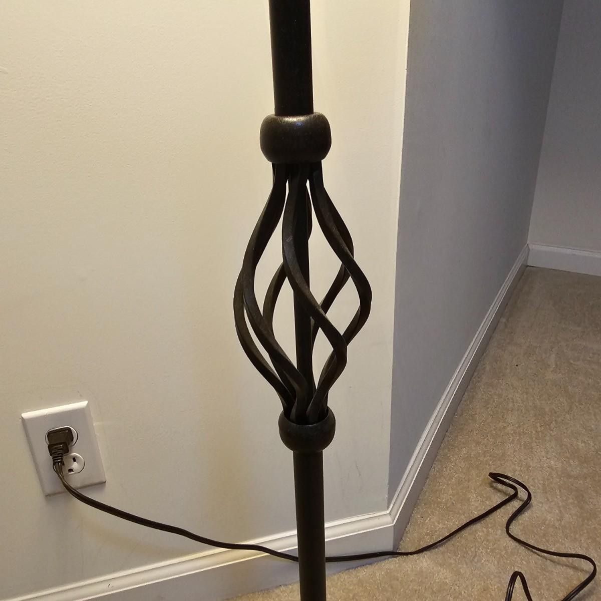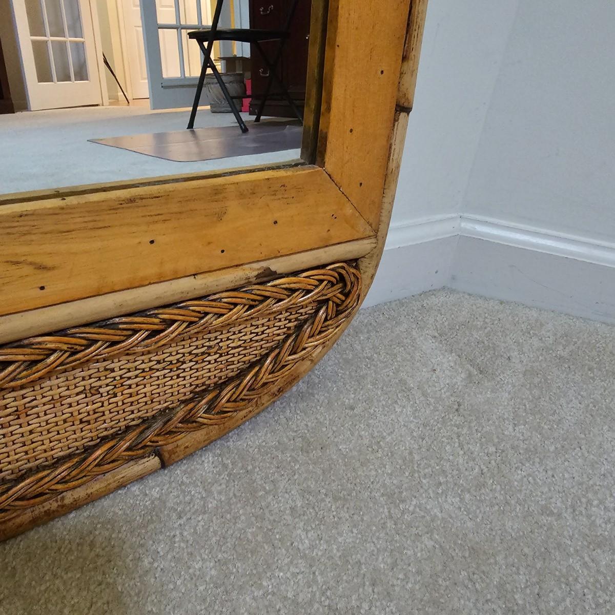 An iron base/stand floor lamp and a wicker/bamboo frame mirror. Lamp has 17"D shade, stands 56"H and will take a 3-way bulb. Powered on when plugged in. Mirror has wicker and bamboo framing, is 24" x 30"H, has hangers on back. See photos for details. Local pickup only.