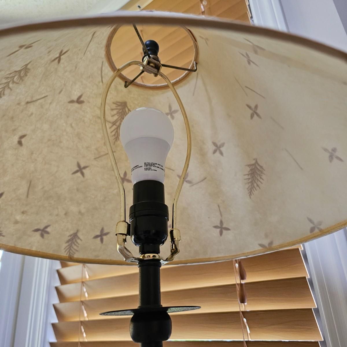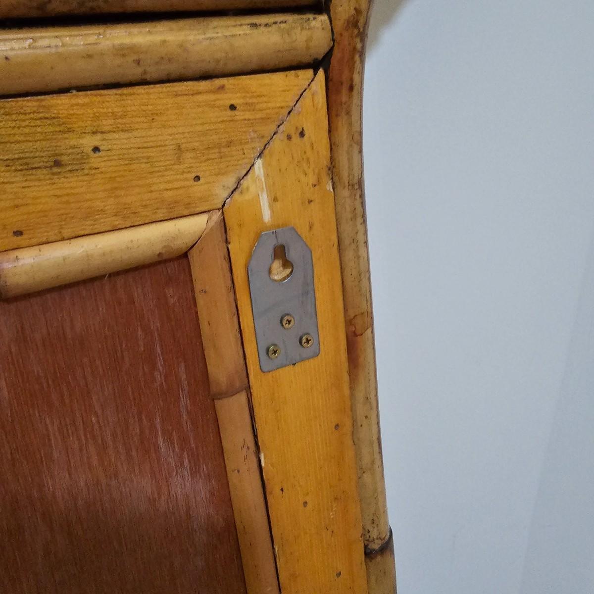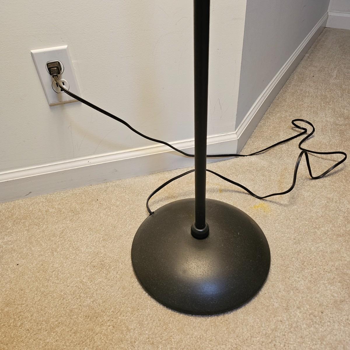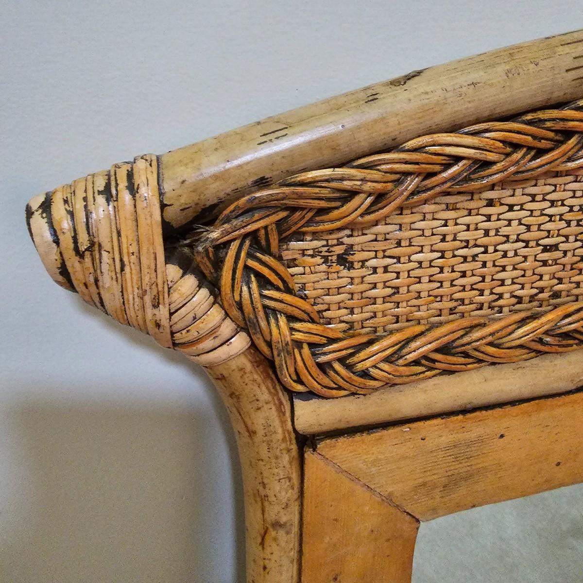 An iron base/stand floor lamp and a wicker/bamboo frame mirror. Lamp has 17"D shade, stands 56"H and will take a 3-way bulb. Powered on when plugged in. Mirror has wicker and bamboo framing, is 24" x 30"H, has hangers on back. See photos for details. Local pickup only.