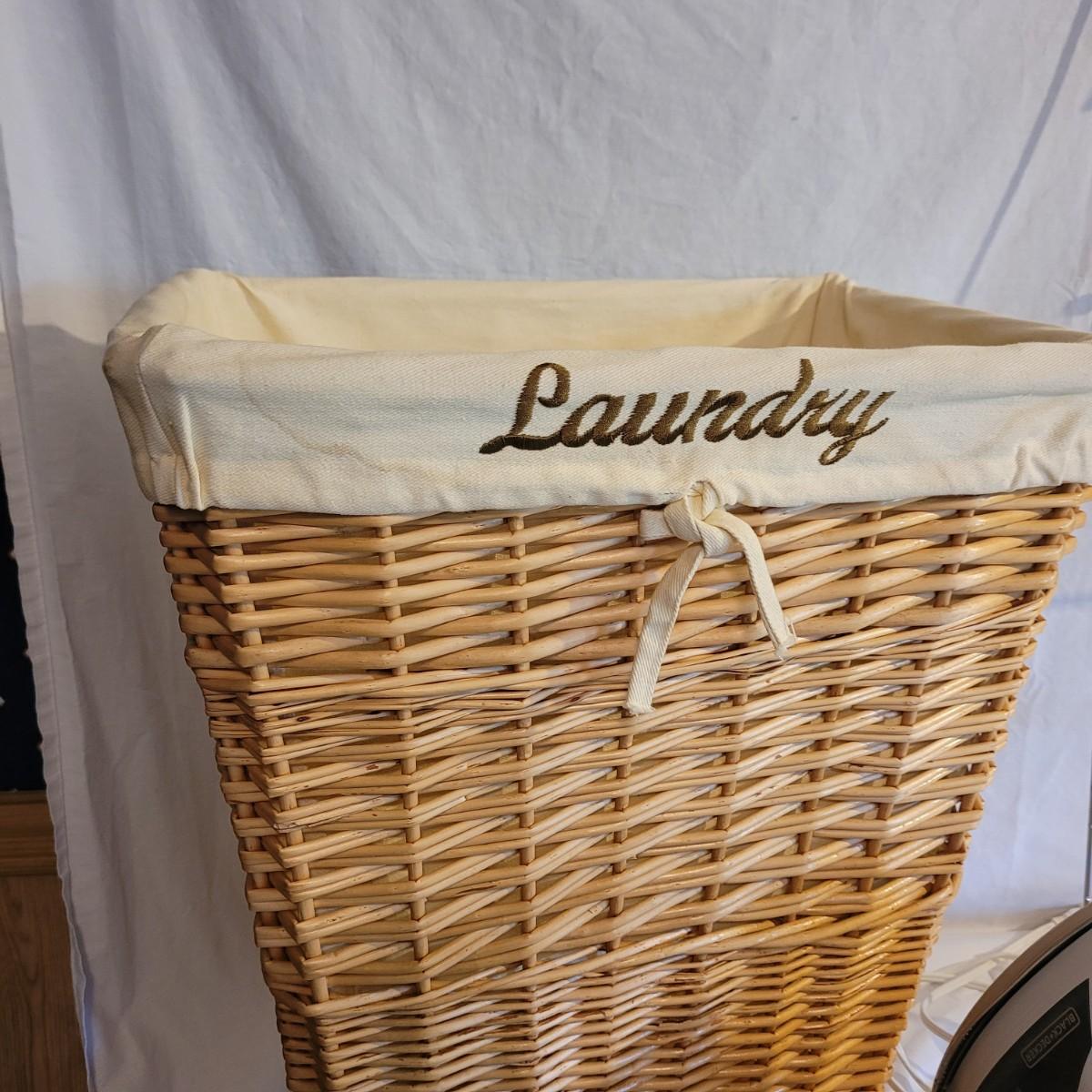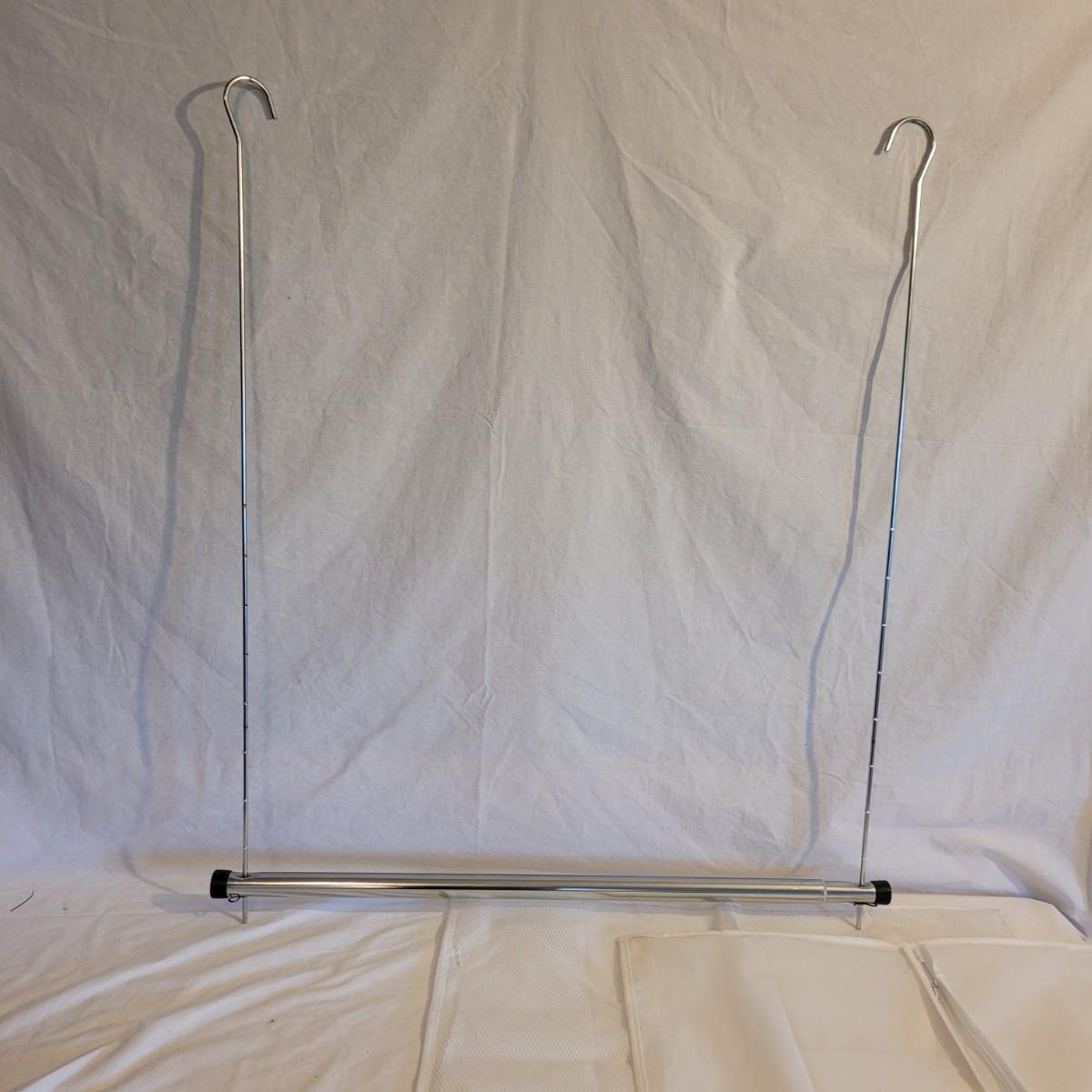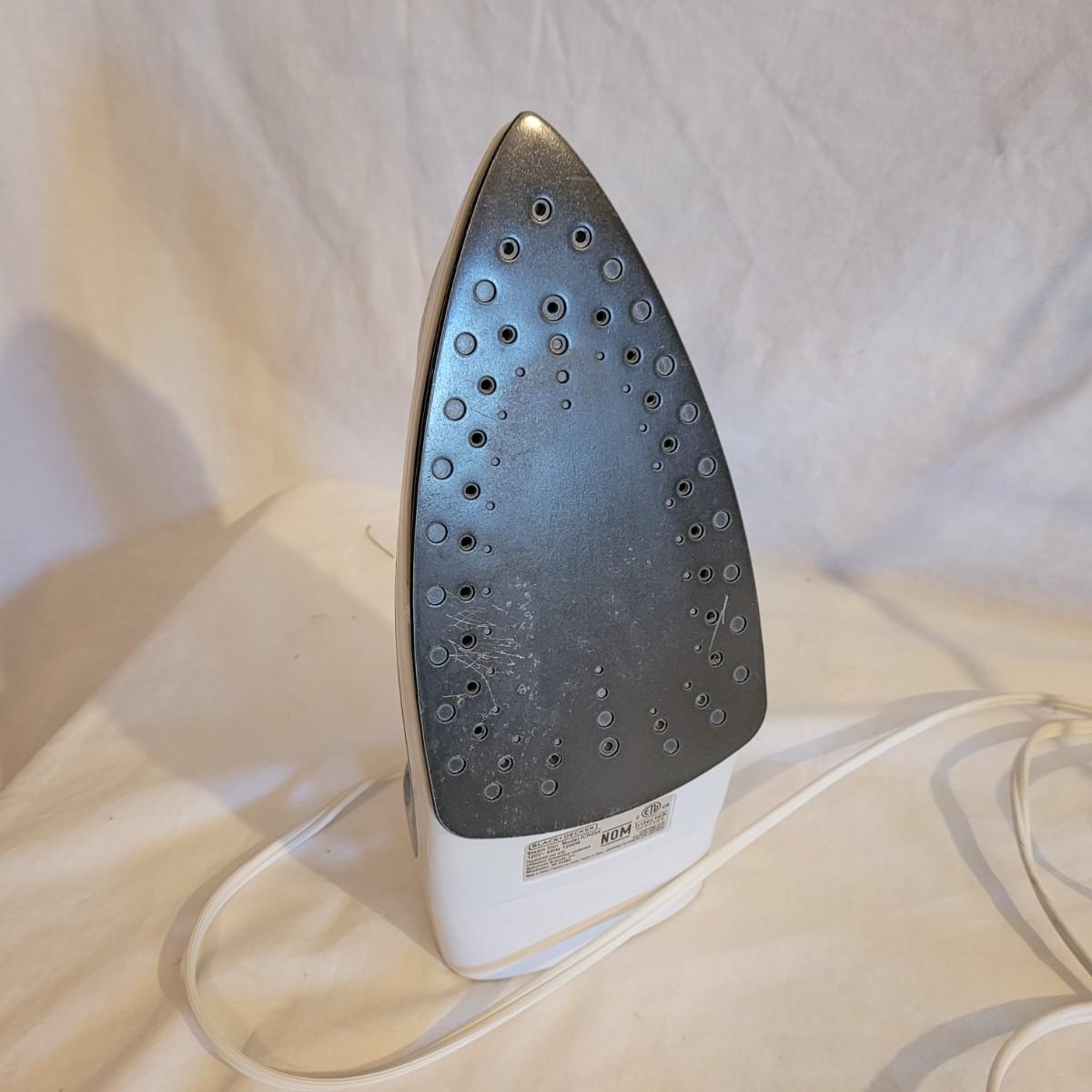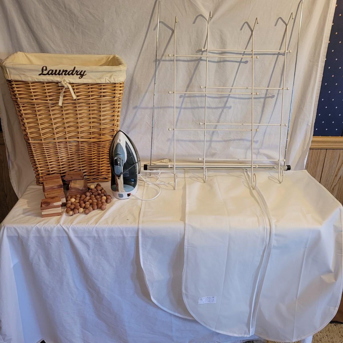This lot contains an iron and an assortment of laundry and garment storage items, including cedar blocks and balls, a hamper, eight garment bags, a hanging garment container and metal garment storage accessories. Hamper measures approximately 16” x 12” x 21”H. Iron powered on when plugged in. Local pick up only.