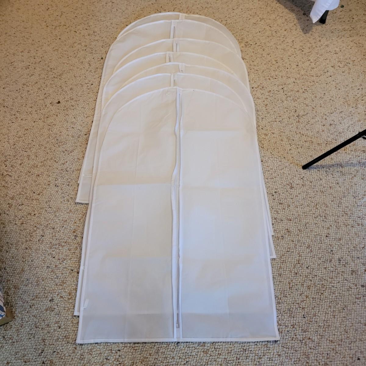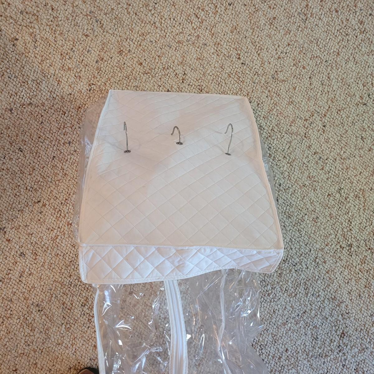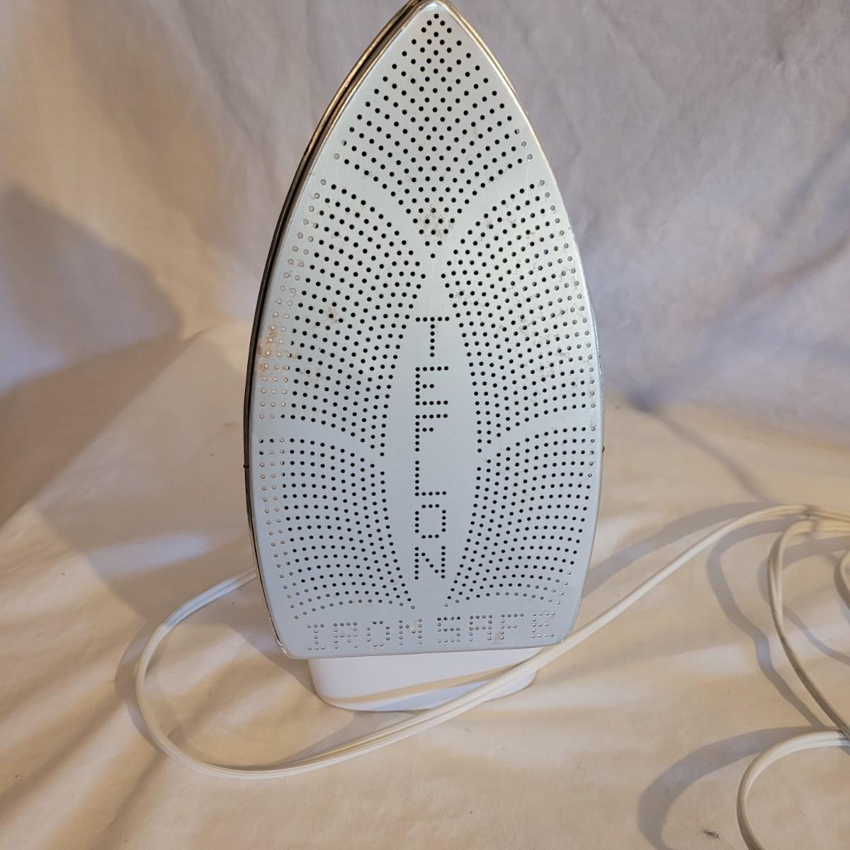 This lot contains an iron and an assortment of laundry and garment storage items, including cedar blocks and balls, a hamper, eight garment bags, a hanging garment container and metal garment storage accessories. Hamper measures approximately 16” x 12” x 21”H. Iron powered on when plugged in. Local pick up only.
