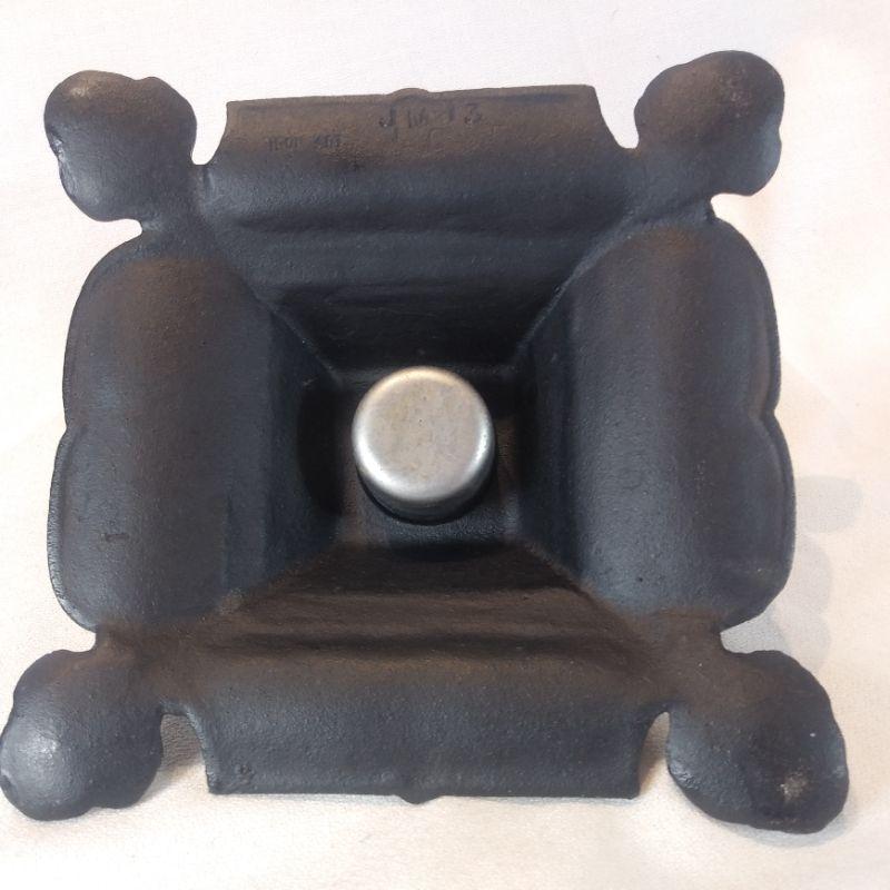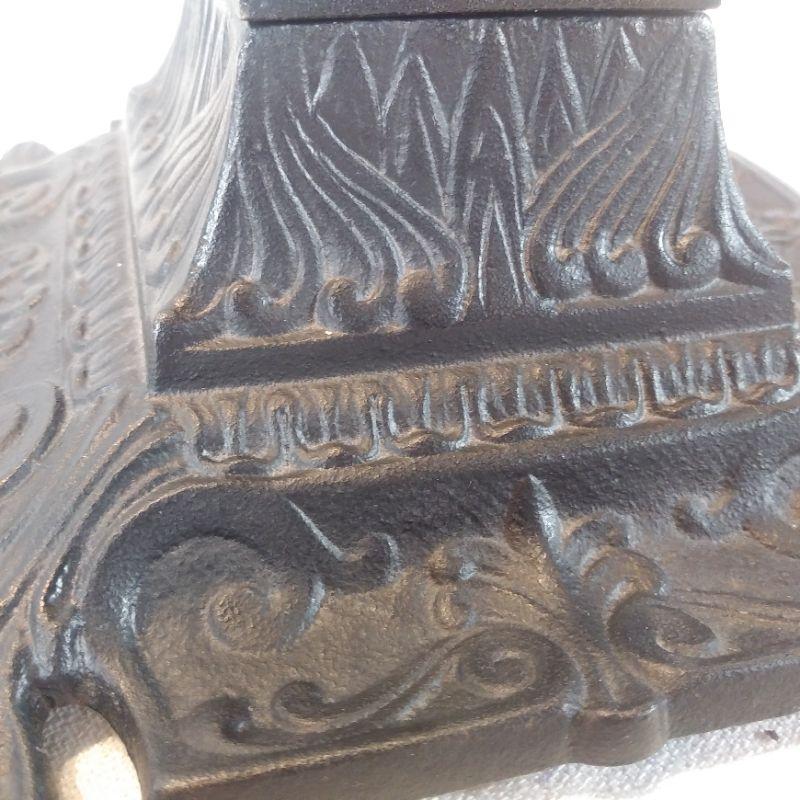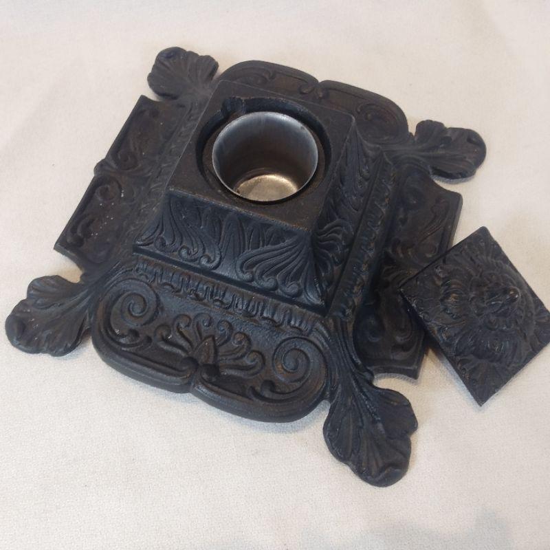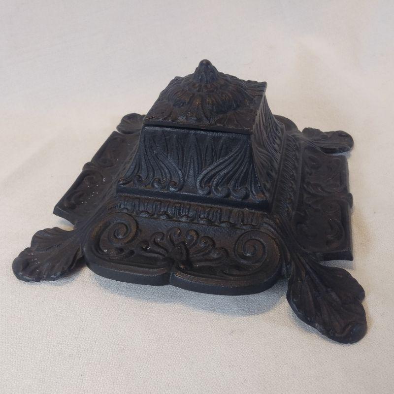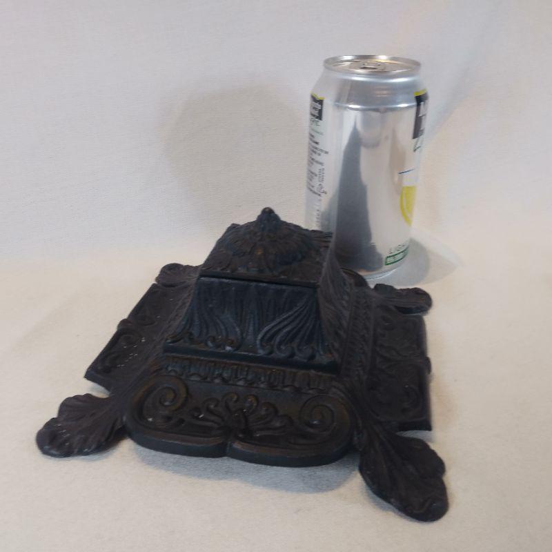 This vintage piece is an ornate Iron Inkwell designed with two concave sides to hold two dip writing pens. Bottom pressing states "Iron Art JM 13" The inkwell measures 6 1/2-inches square X 2 1/2-inches tall. Very good and quite unique.