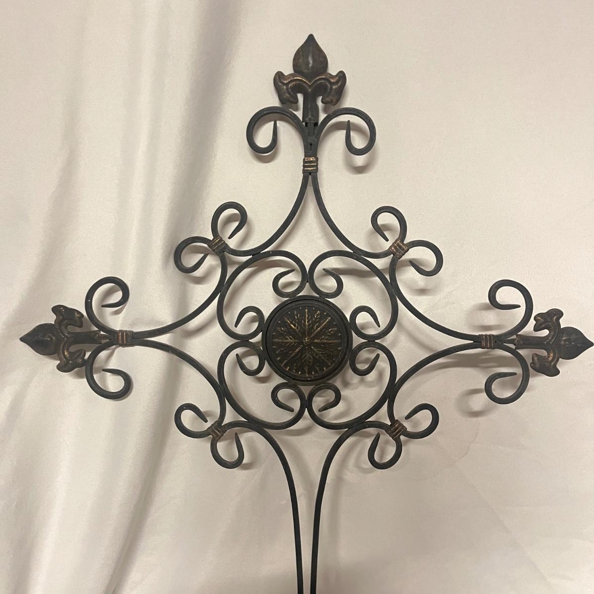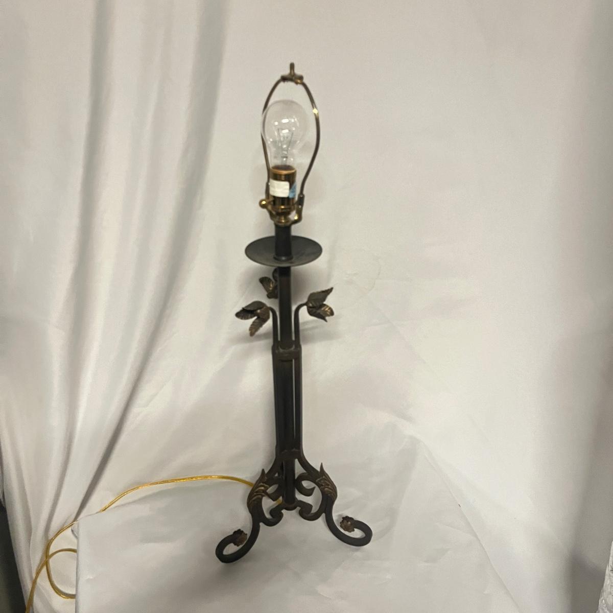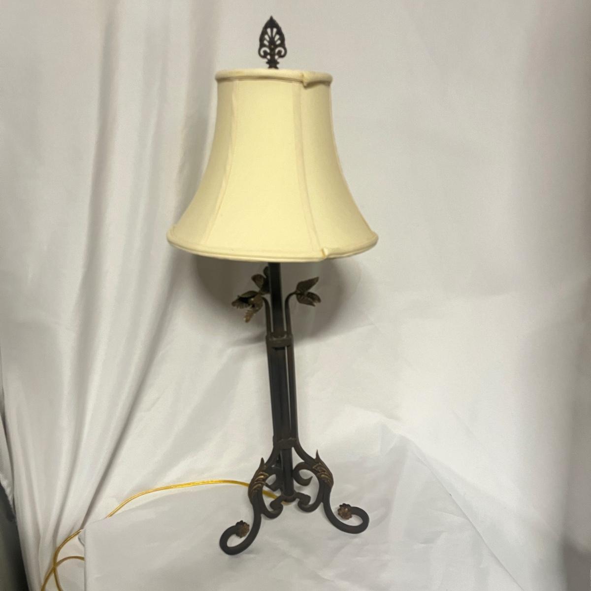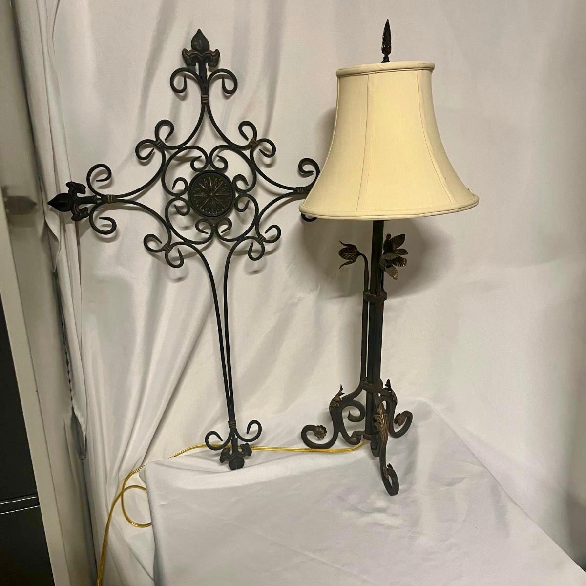 This iron table lamp with floral design powered on when plugged in and has an on/off switch. Also included is an iron Fleur-De-Lis wall hanging art. Lamp measures 10”D x 30”H without shade and Wall art measures 22” x 32”H.