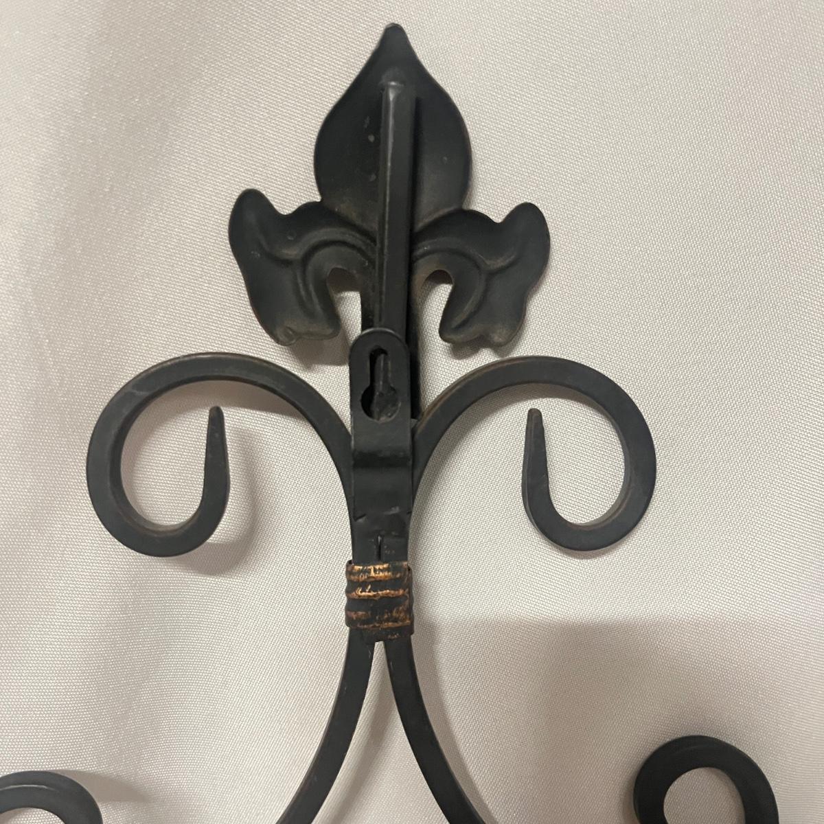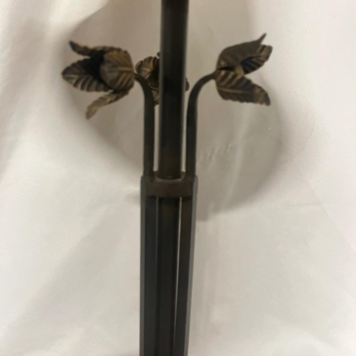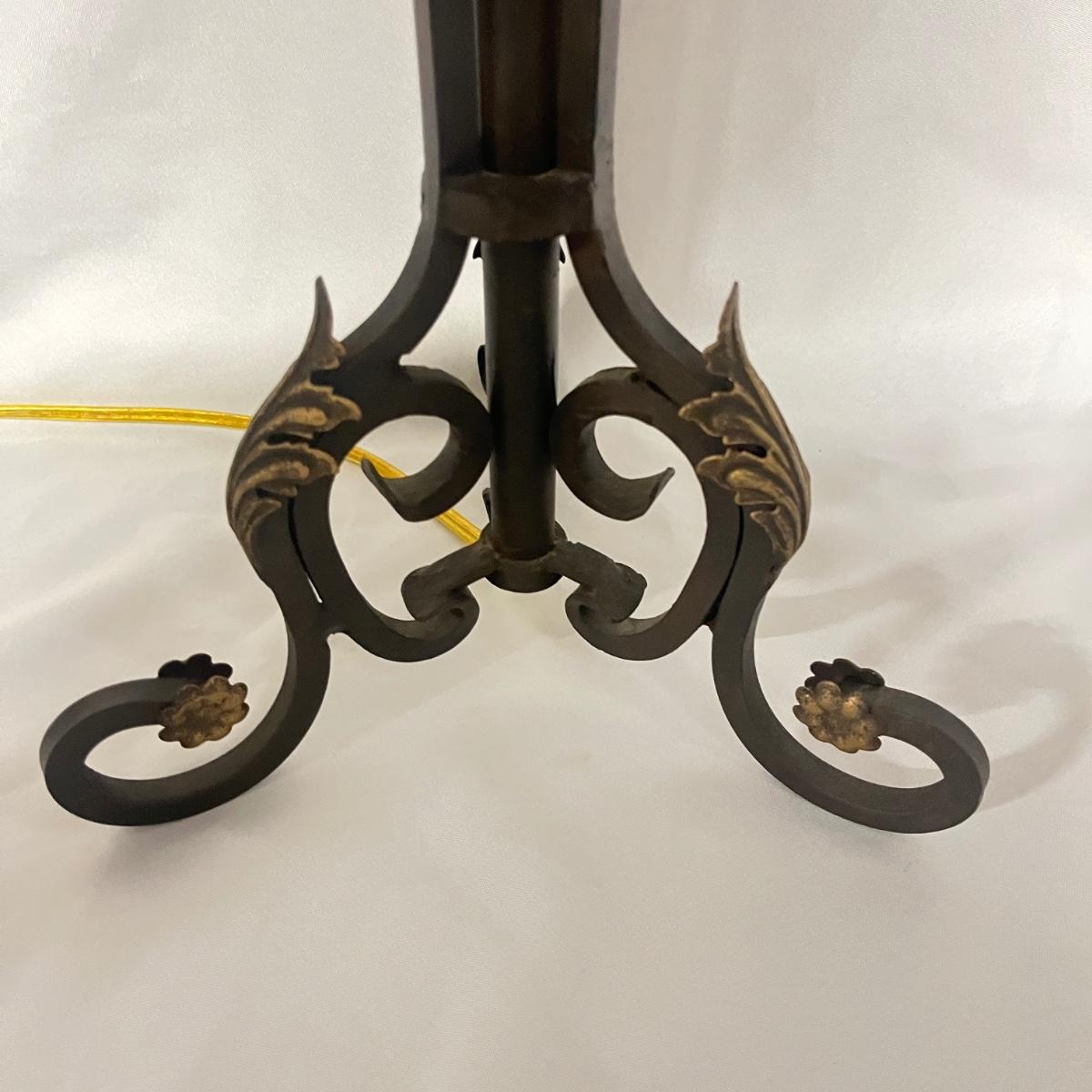 This iron table lamp with floral design powered on when plugged in and has an on/off switch. Also included is an iron Fleur-De-Lis wall hanging art. Lamp measures 10”D x 30”H without shade and Wall art measures 22” x 32”H.