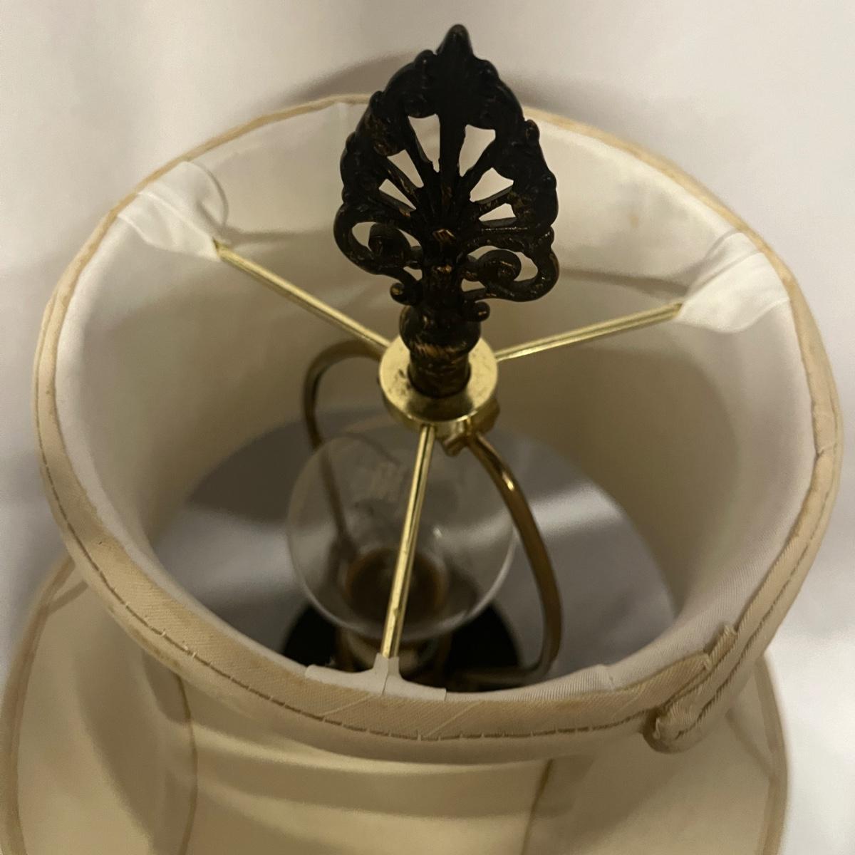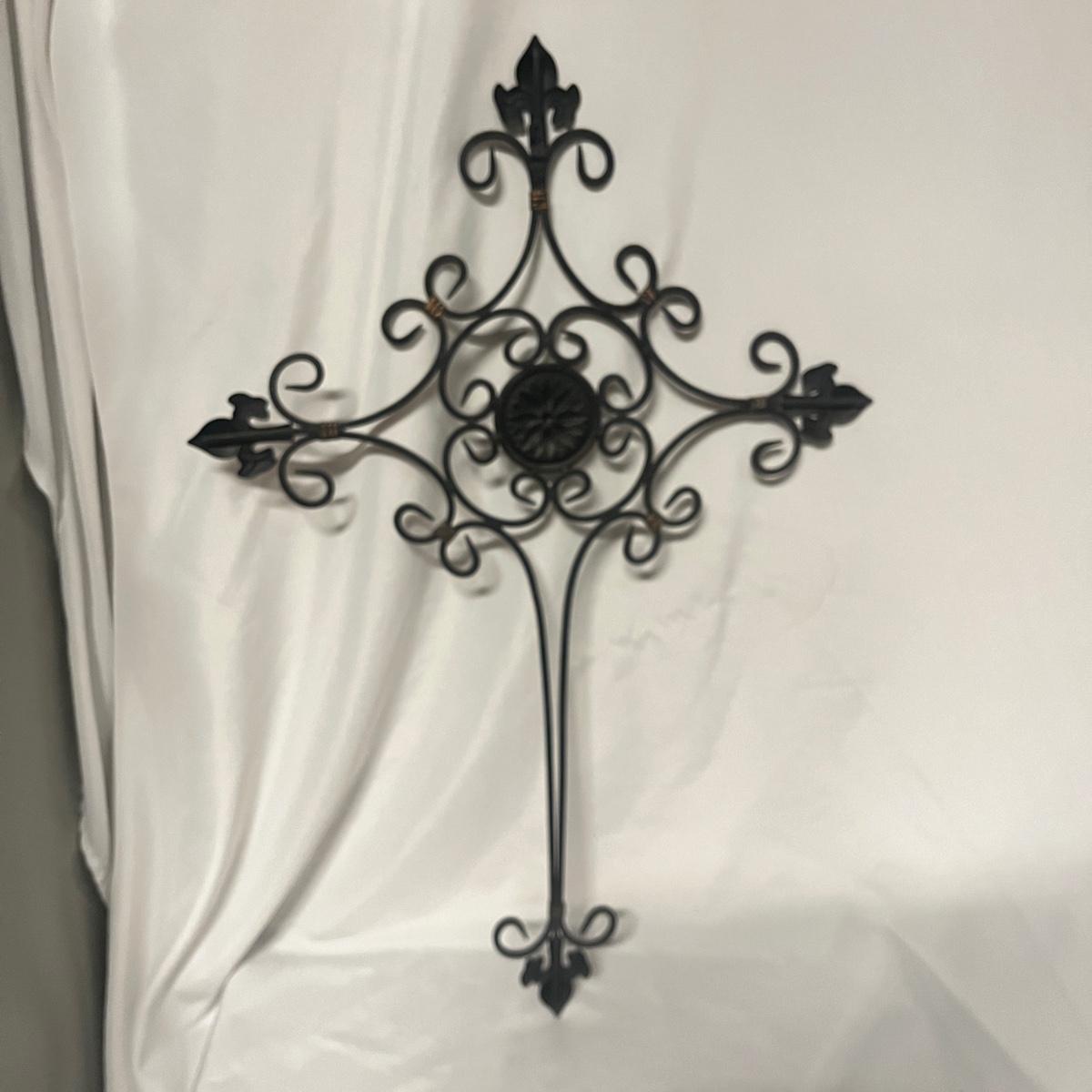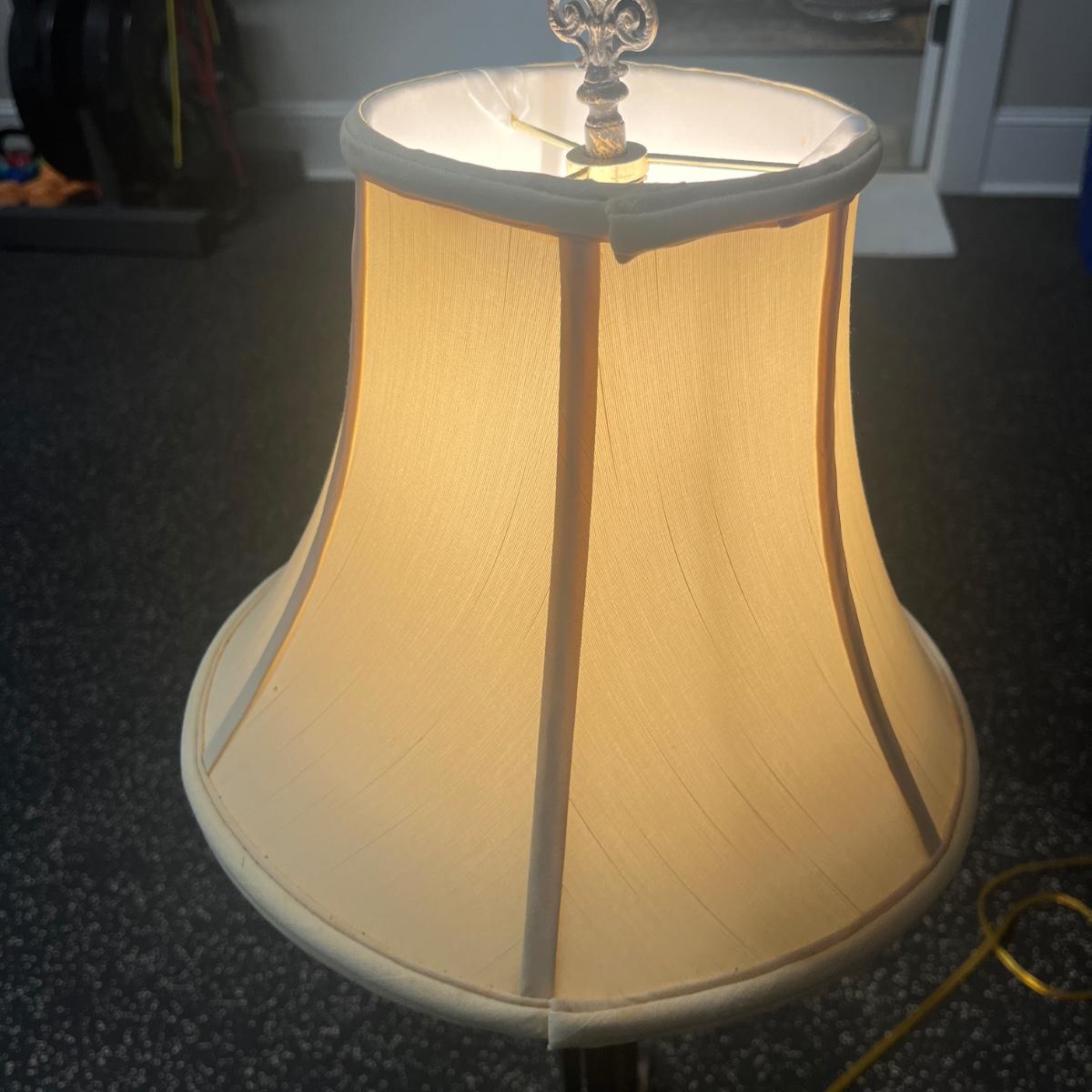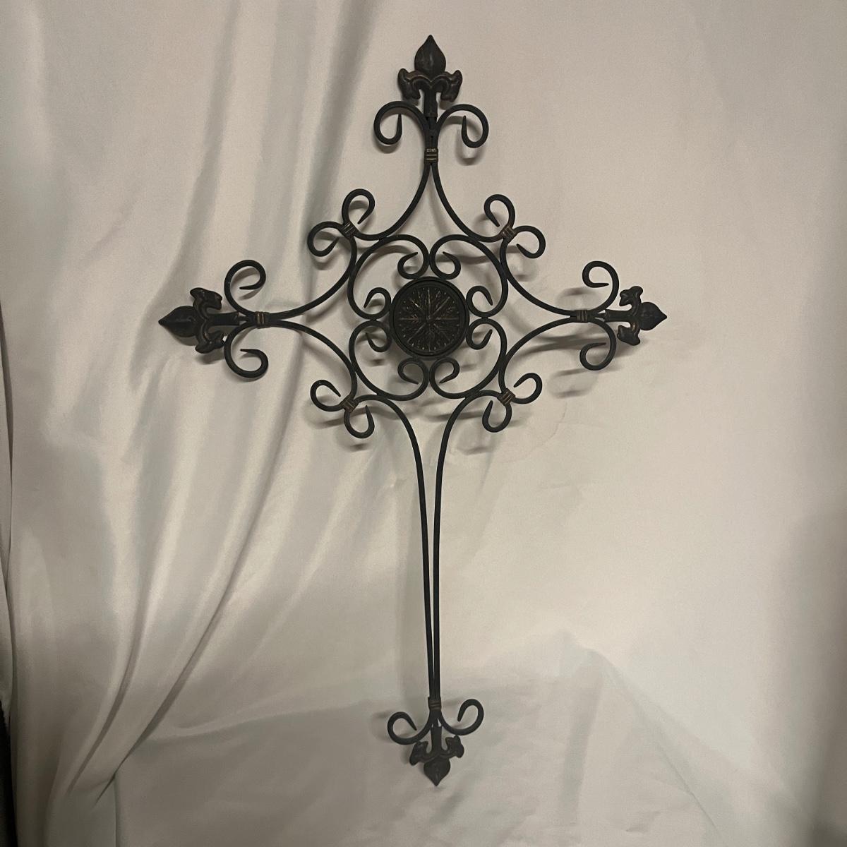 This iron table lamp with floral design powered on when plugged in and has an on/off switch. Also included is an iron Fleur-De-Lis wall hanging art. Lamp measures 10”D x 30”H without shade and Wall art measures 22” x 32”H.
