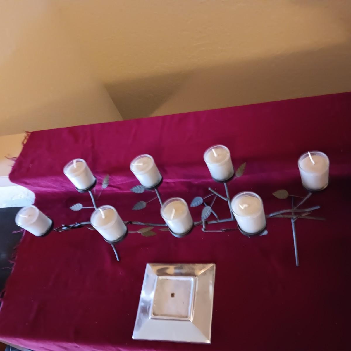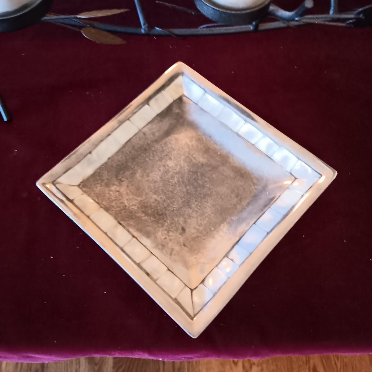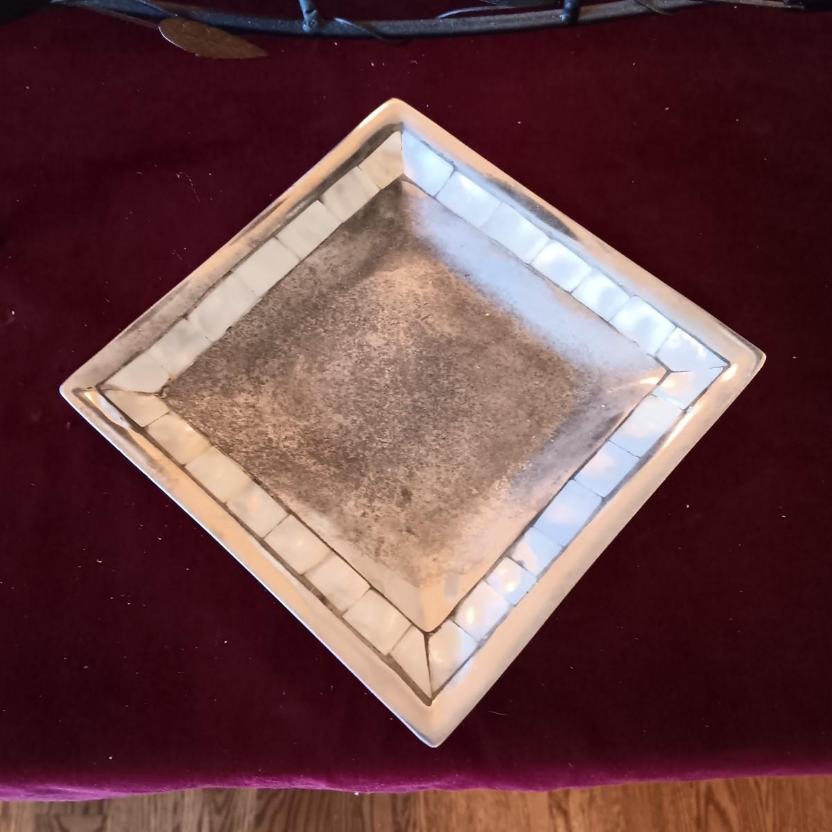 IRON LEAF VOTIVE CANDLE HOLDER AND PEWTER TRAY WITH ABALONE BORDER