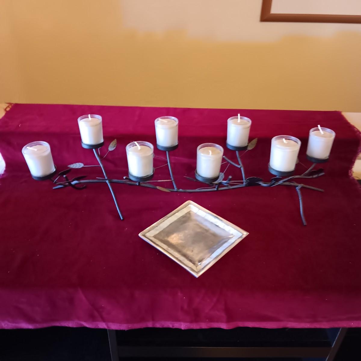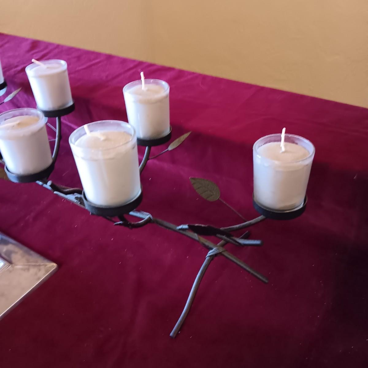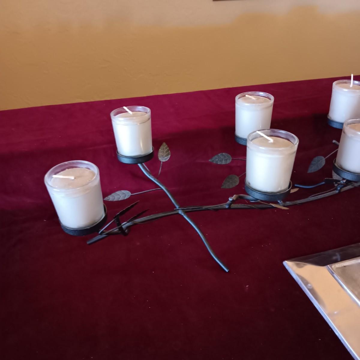 IRON LEAF VOTIVE CANDLE HOLDER AND PEWTER TRAY WITH ABALONE BORDER