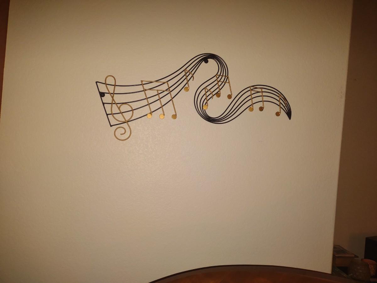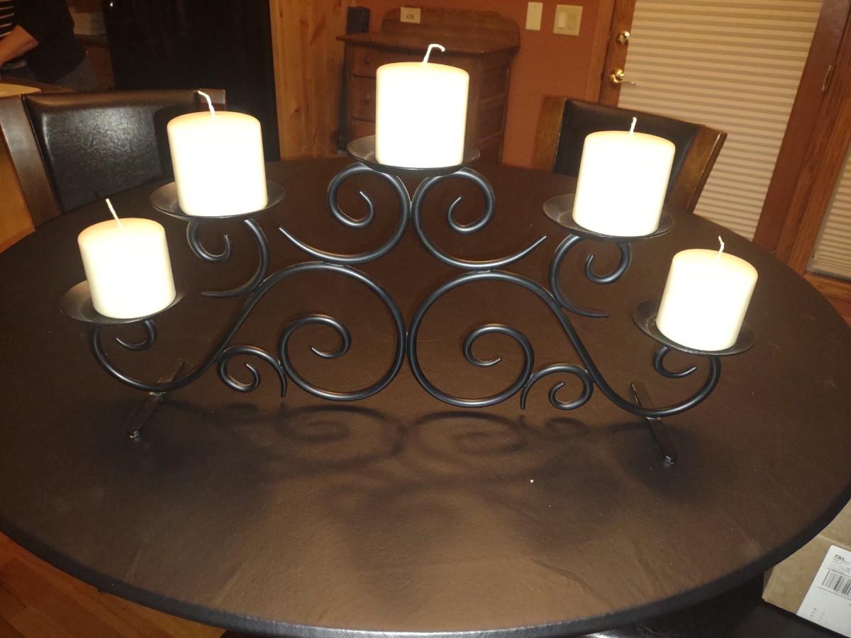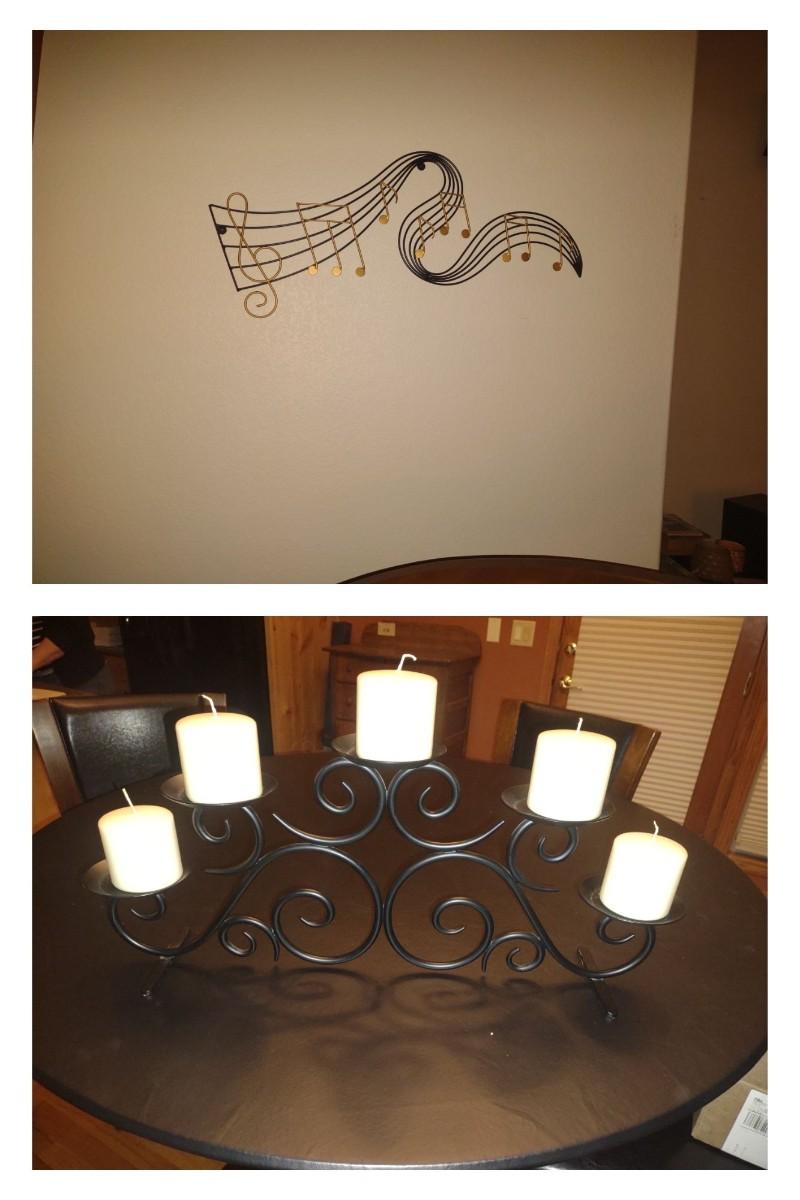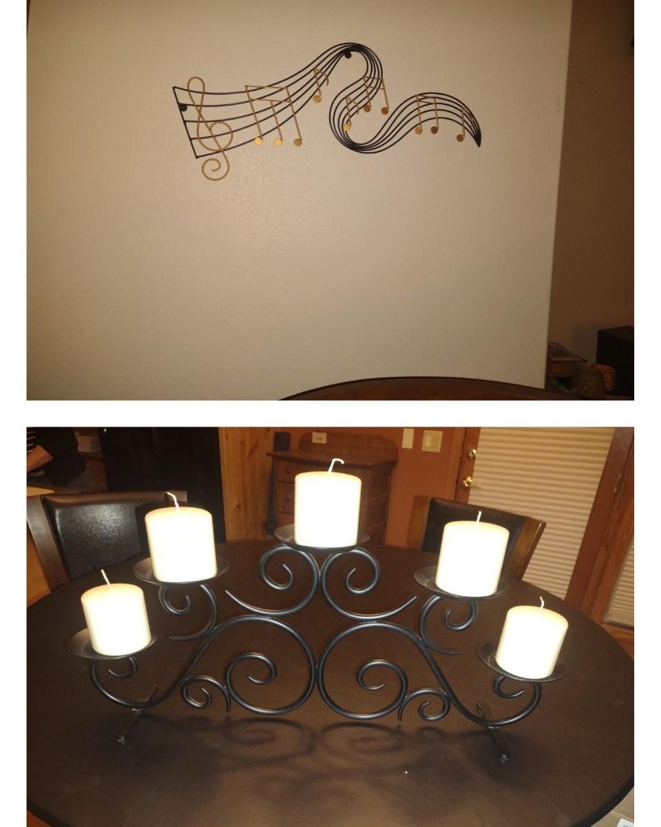 IRON MULTI CANDLE CENTERPIECE AND METAL TREBLE CLEF WALL ACCENT