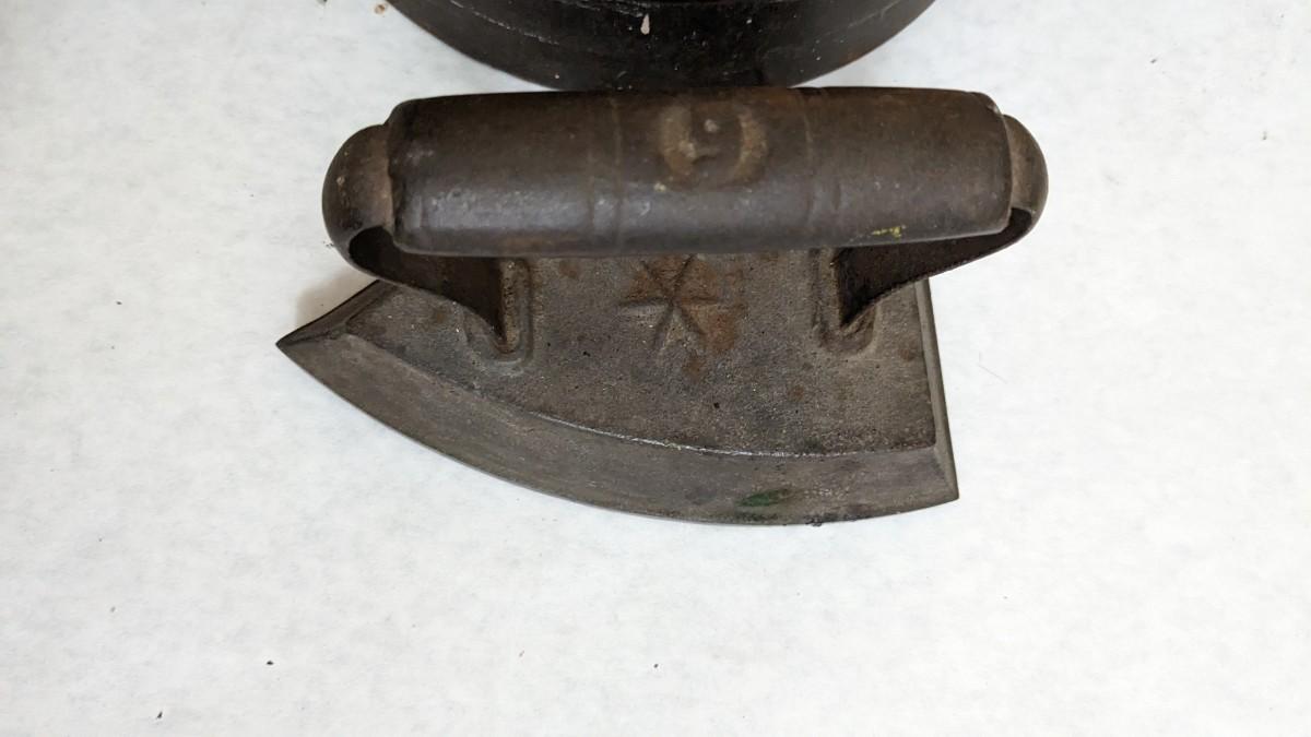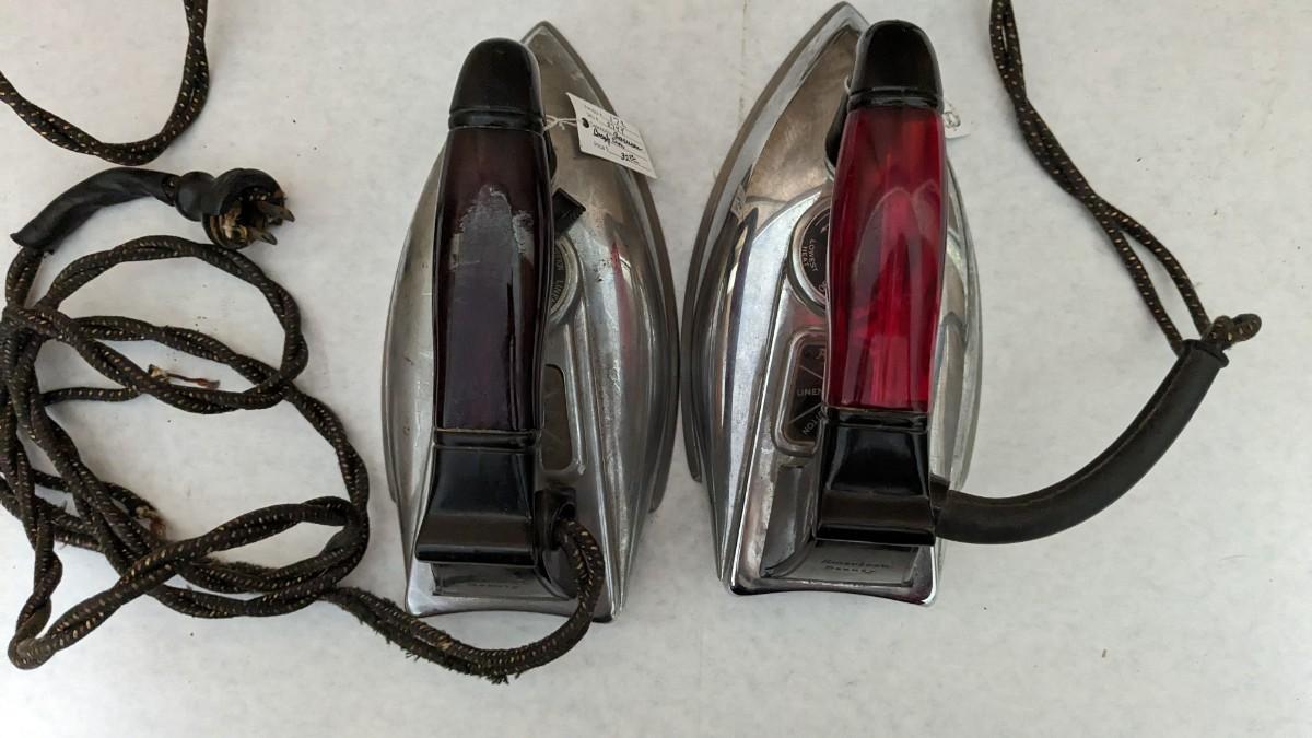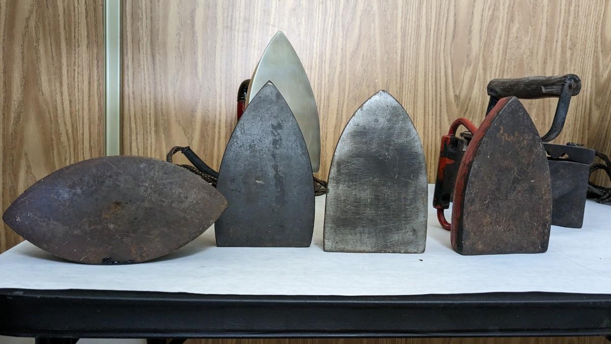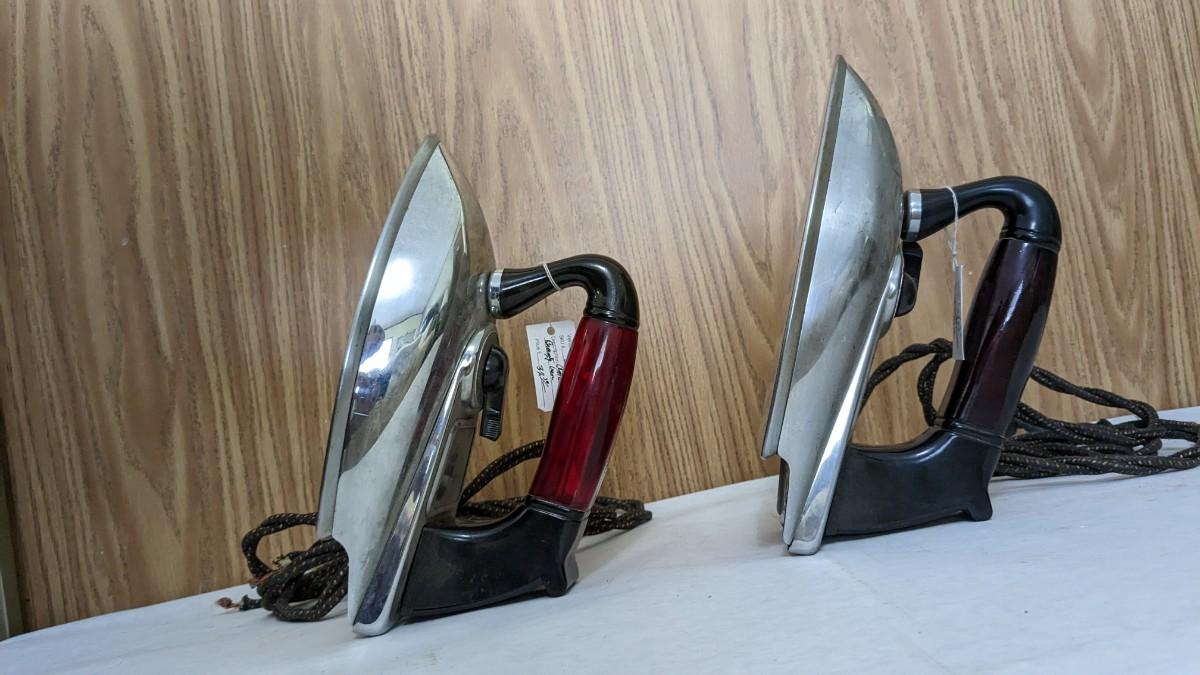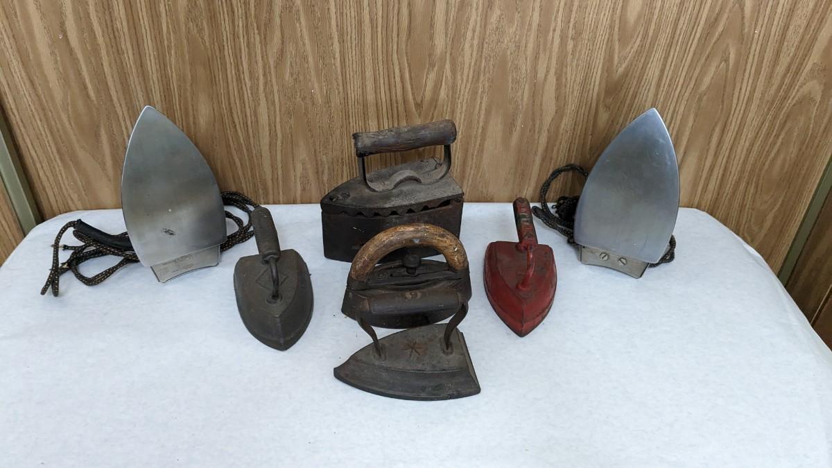 a wonderful collection of multi decade irons. Includes coal base piece, solid irons, a wood handle piece, and vintage electric irons! This is a HEAVY lot, please take into consideration if needing shipping. bdrm1