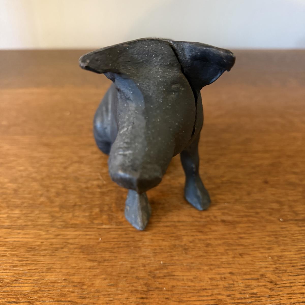 This lot contains a cute iron pig-piggy bank that also seconds as a door stop. This piece may be little but he’s heavy! It appears this guy is made of two piece and held together by a flat head screw. It measures 3” x 11” x 5.5”H. Shipping available.