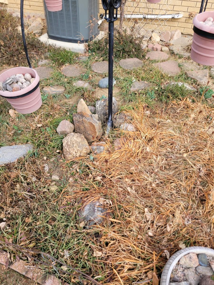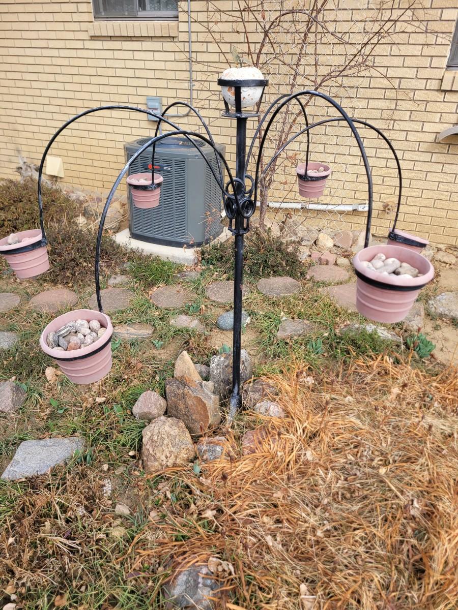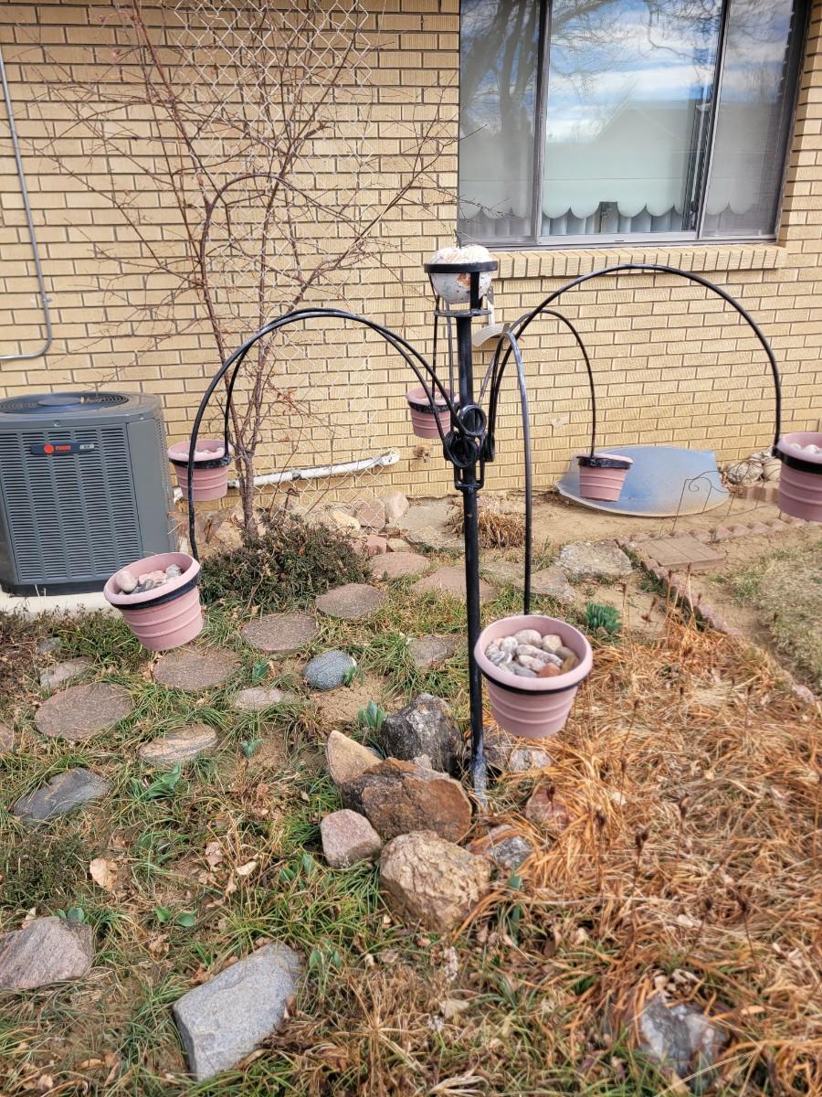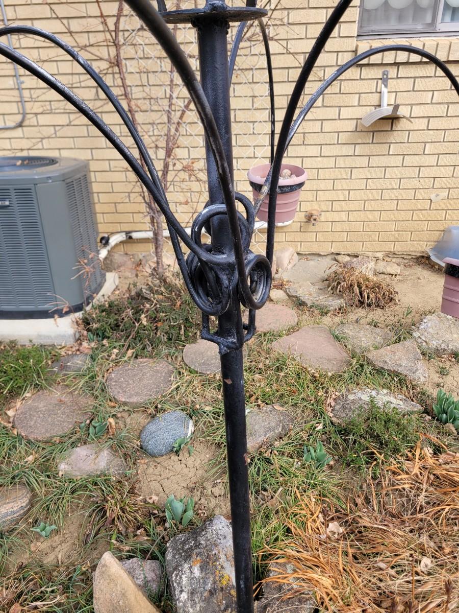 This is not into the ground, it has rocks holding the base down. Made from rake tines.