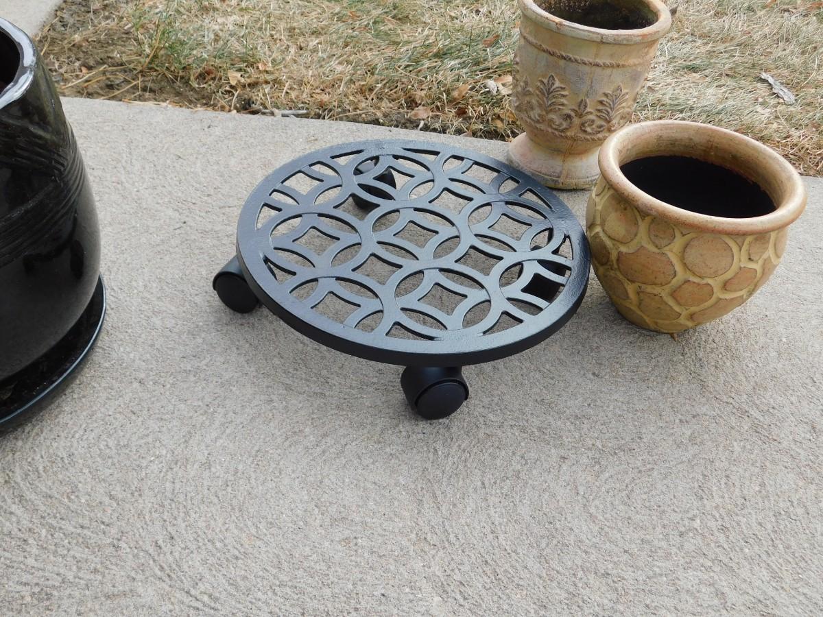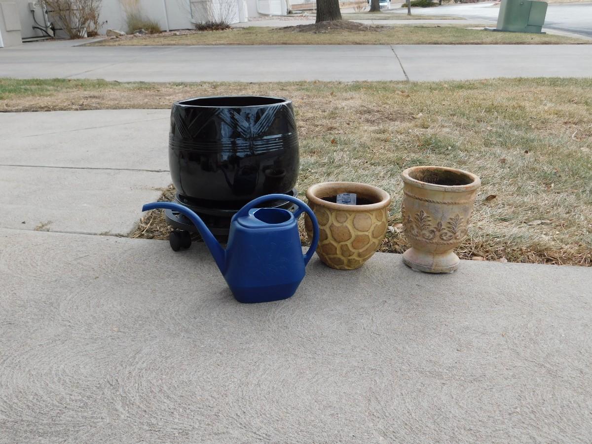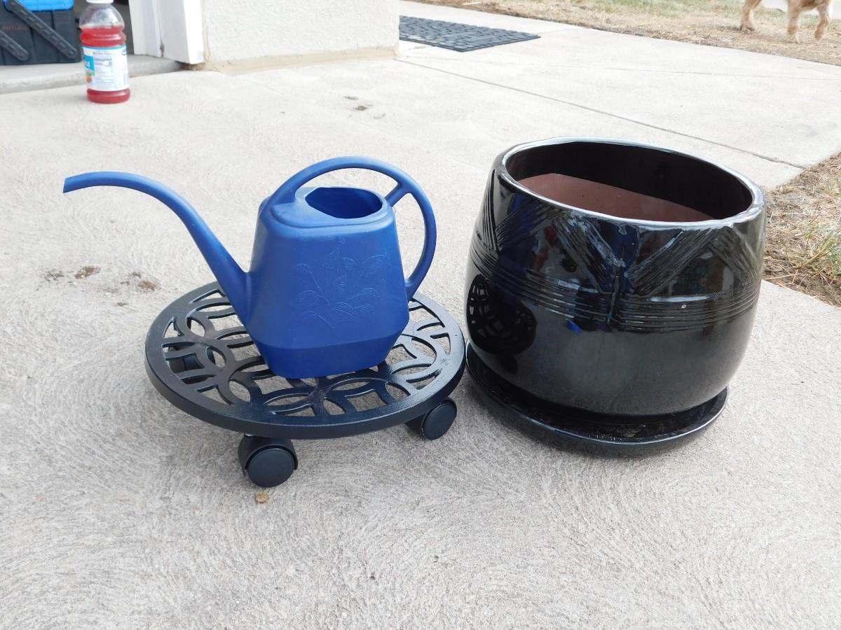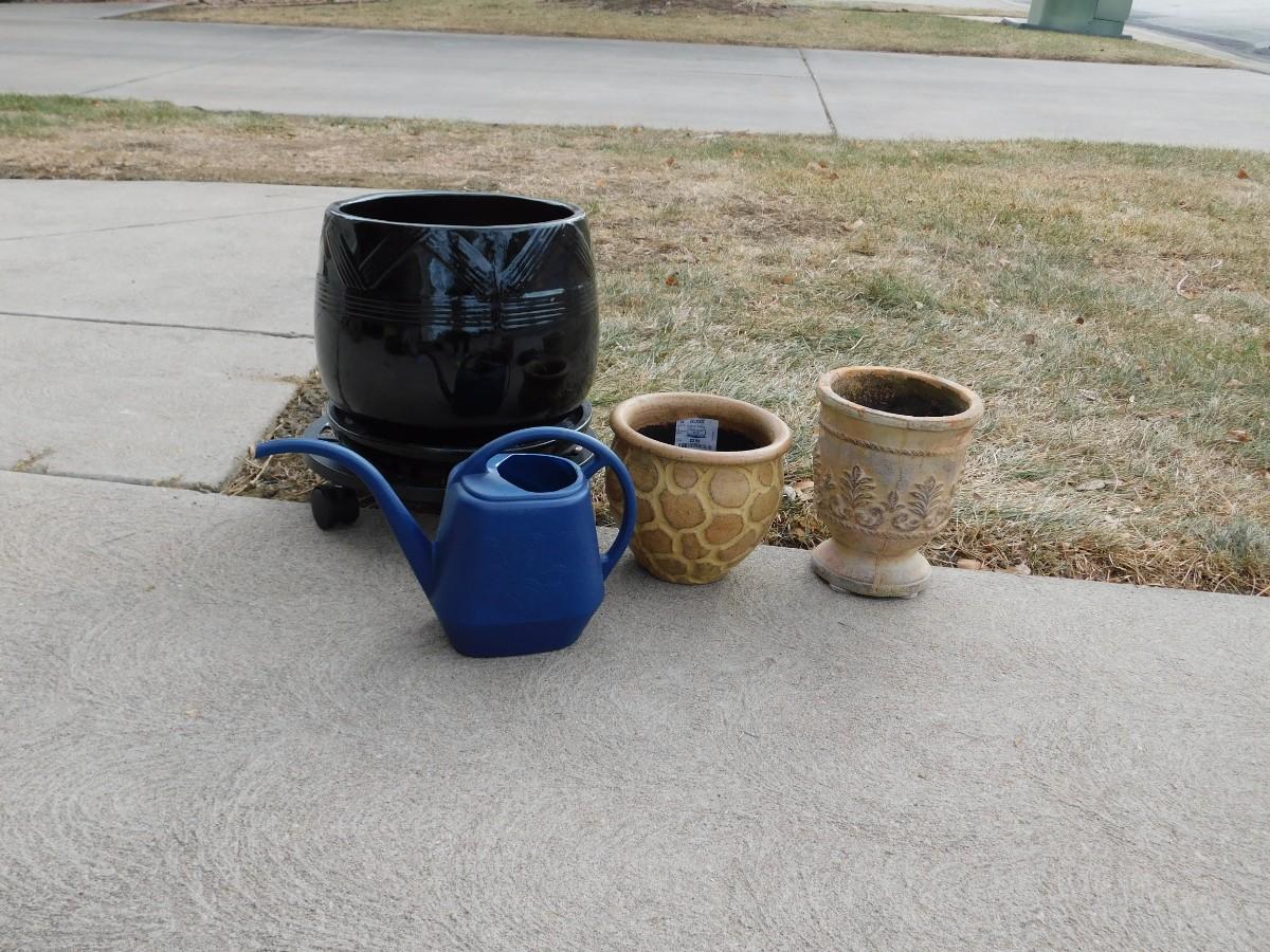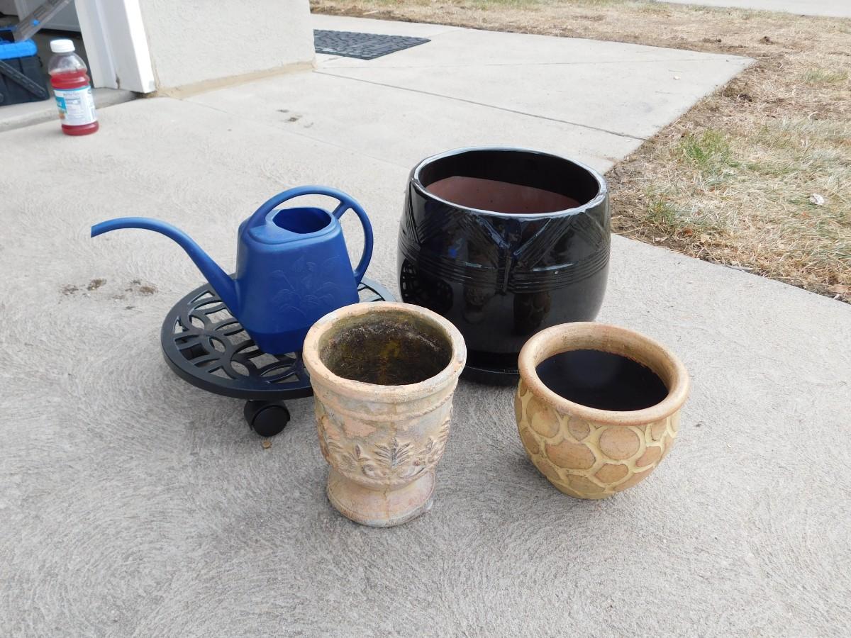 IRON PLANT CADDY, CLAY POTS AND A WATERING CAN