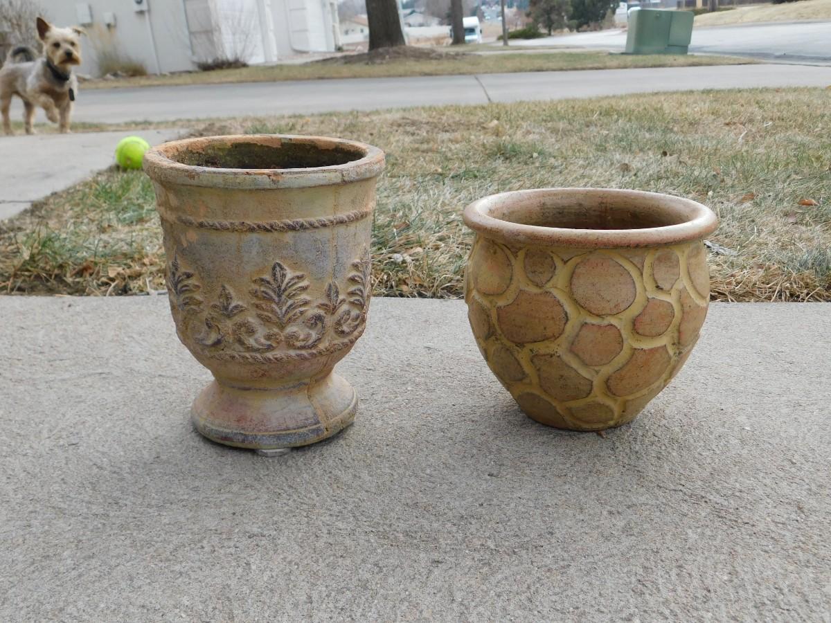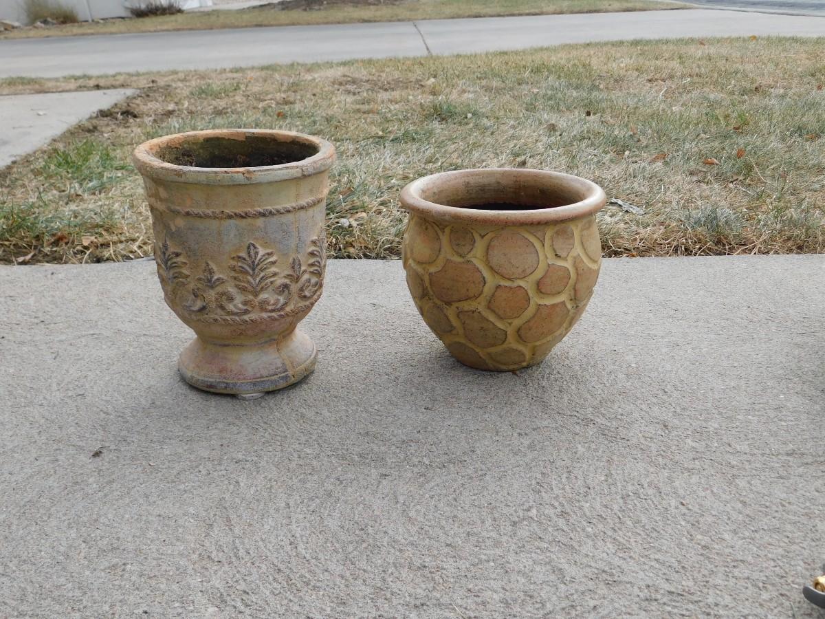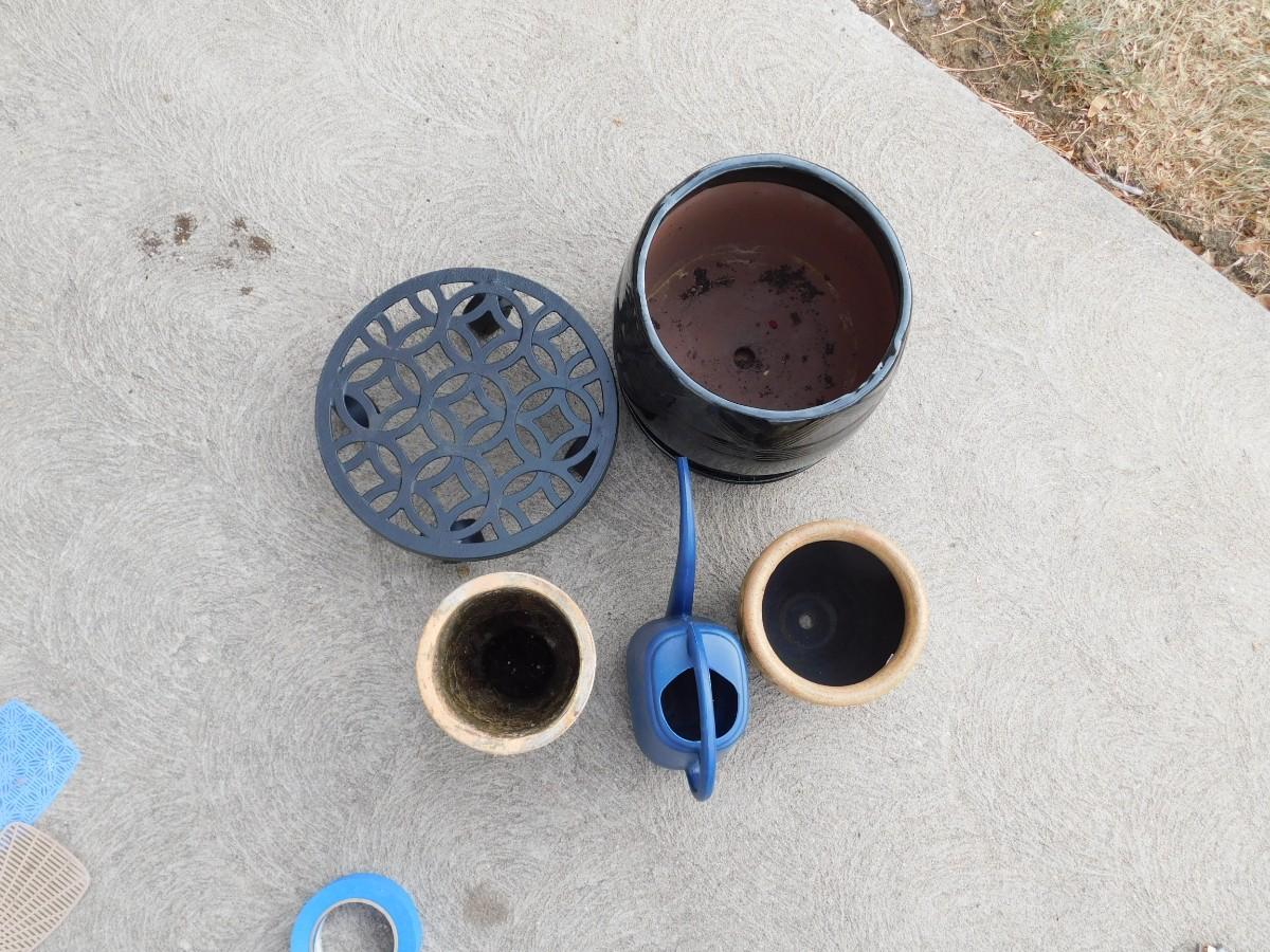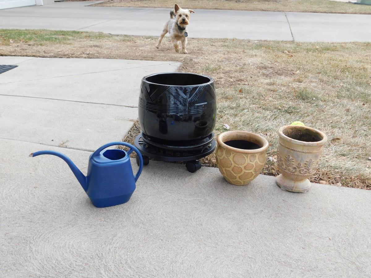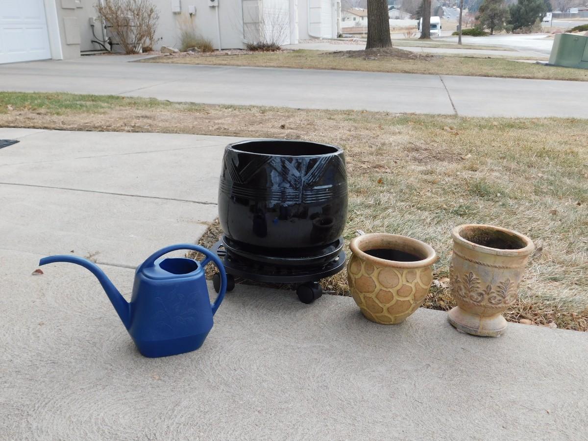 IRON PLANT CADDY, CLAY POTS AND A WATERING CAN