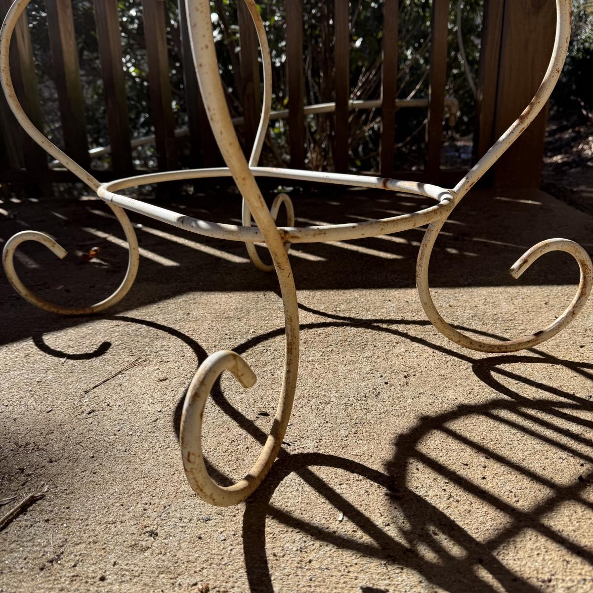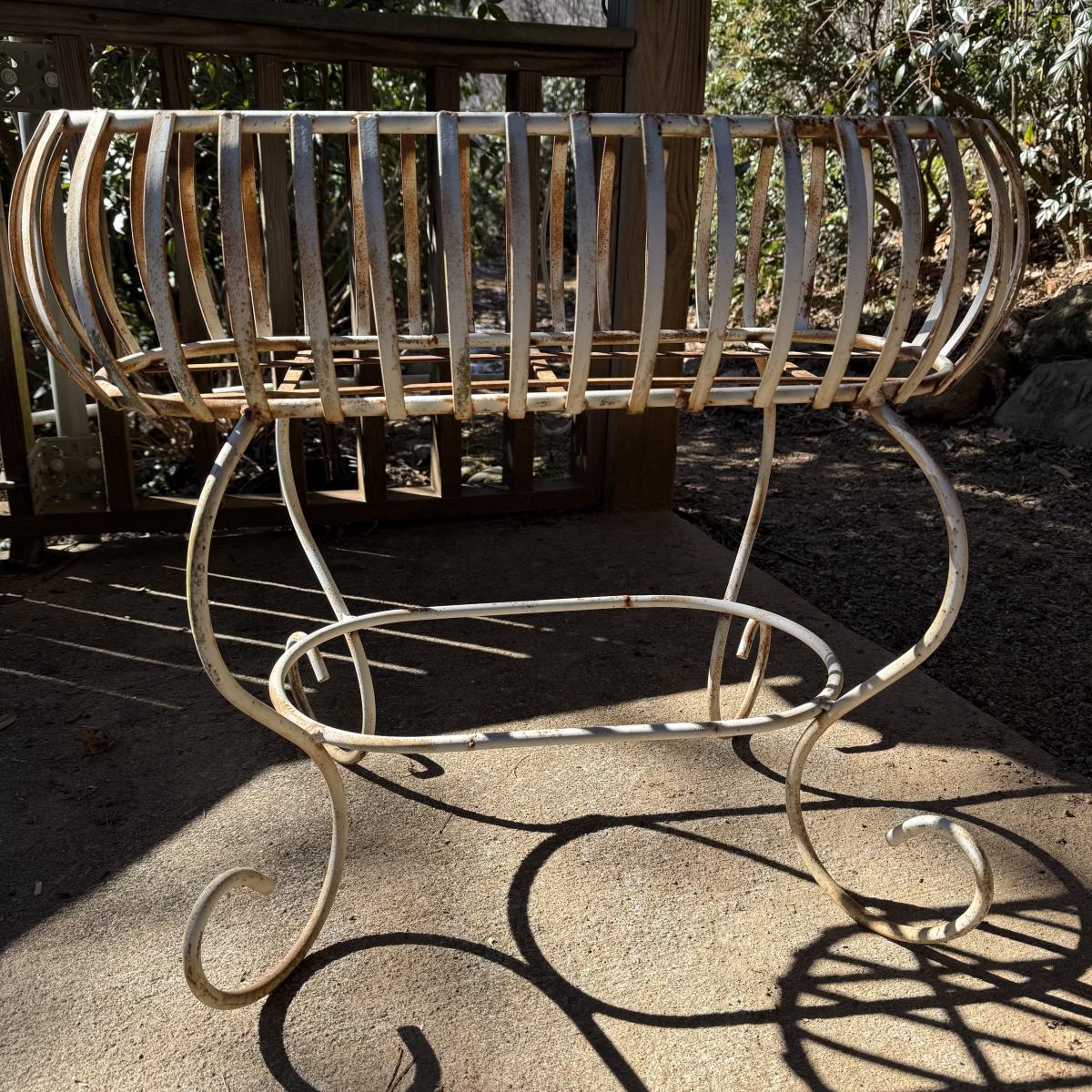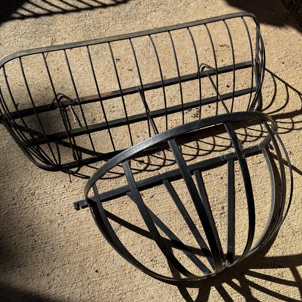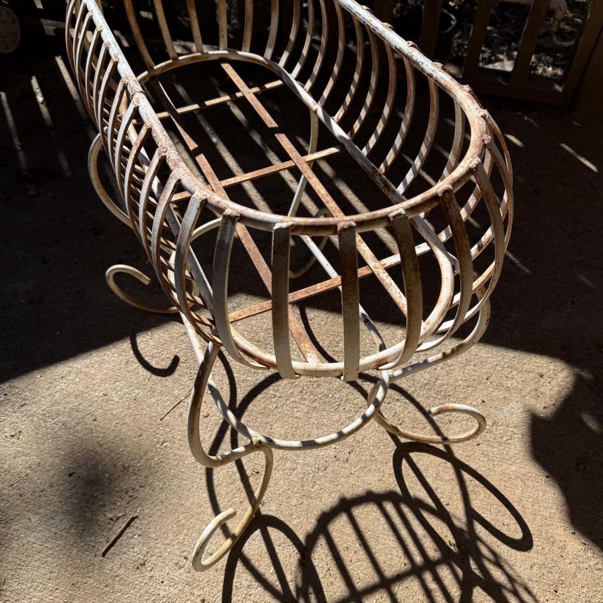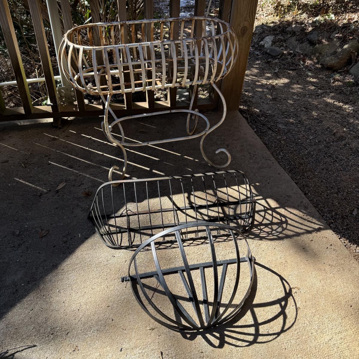 Three metal planters. One is a sturdy iron stand painted white. It is a bit rusty. The stand measures 30” x 14” x 25.5”H. Two black metal planters are included as well. The bigger one has some rust and the smaller one has a small area that is peeling.