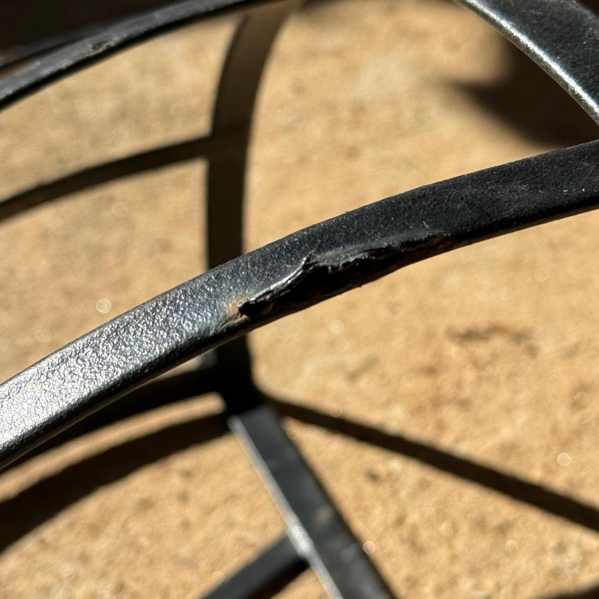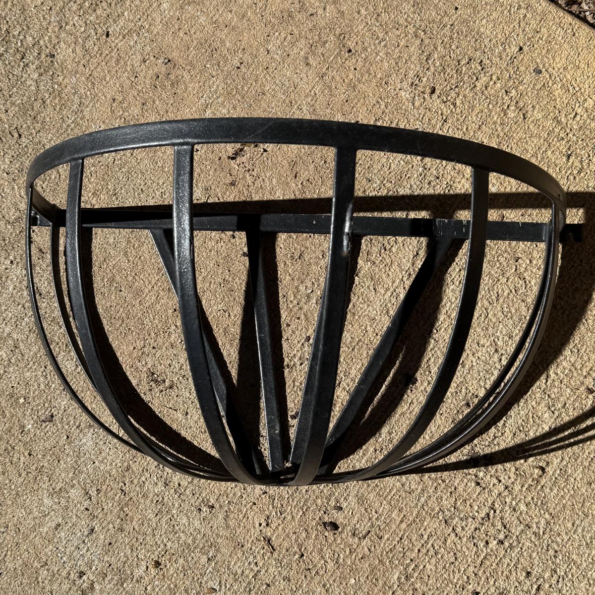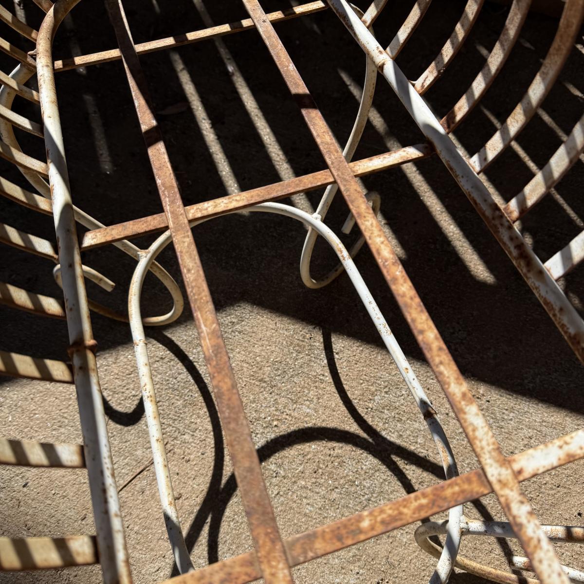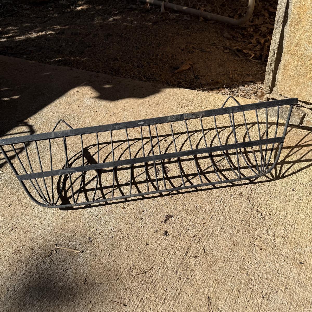Three metal planters. One is a sturdy iron stand painted white. It is a bit rusty. The stand measures 30” x 14” x 25.5”H. Two black metal planters are included as well. The bigger one has some rust and the smaller one has a small area that is peeling.