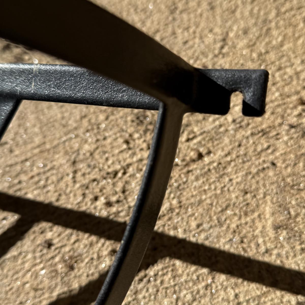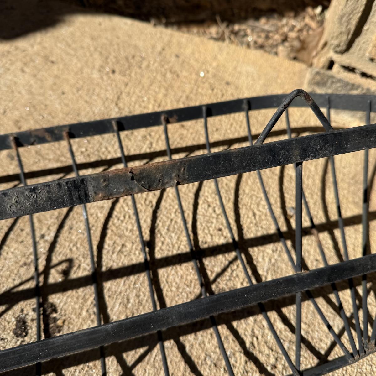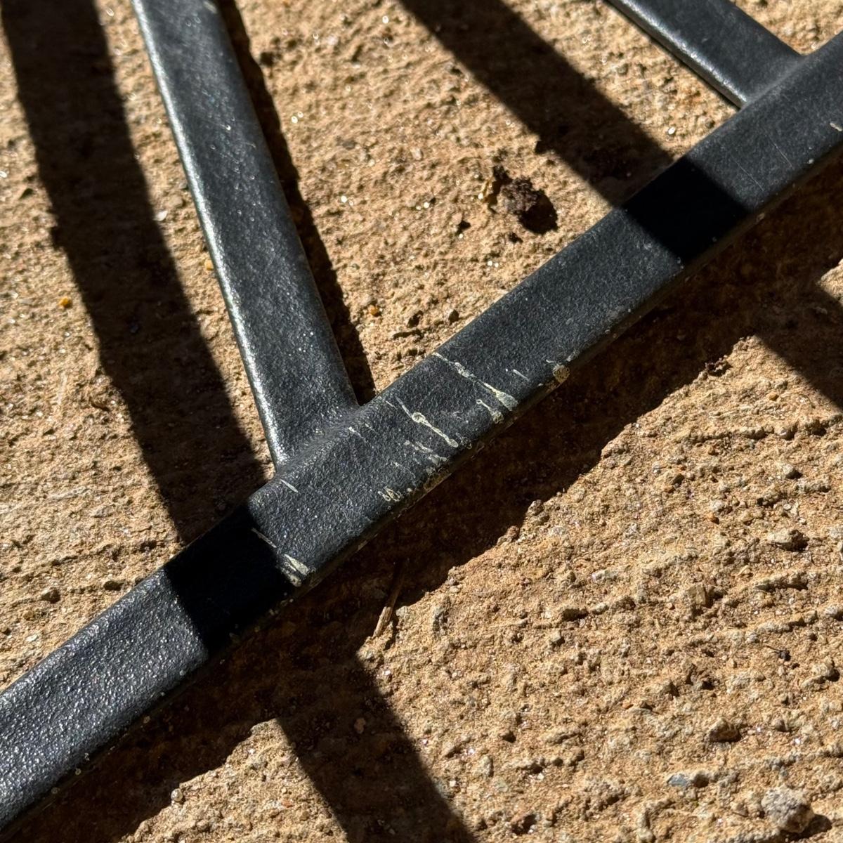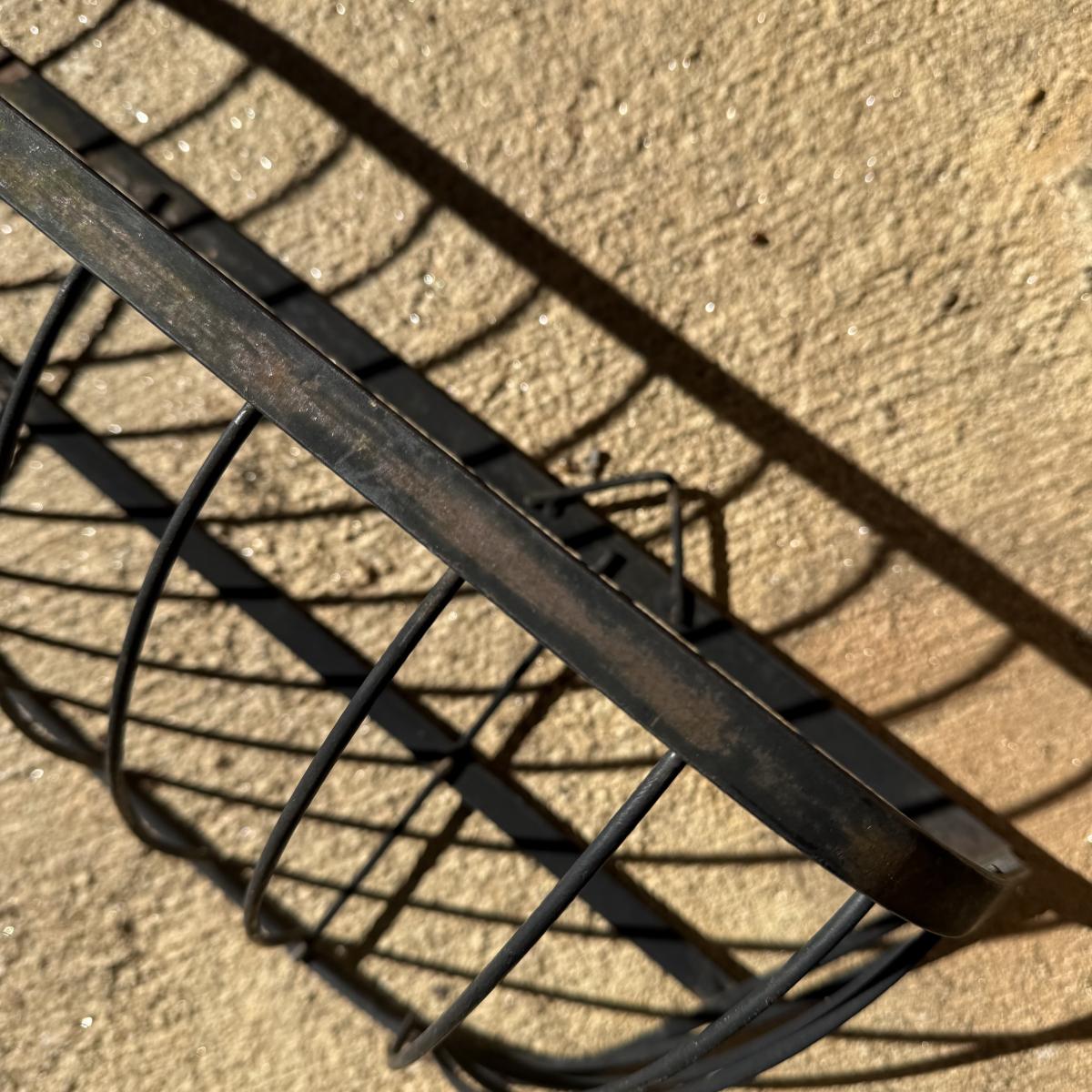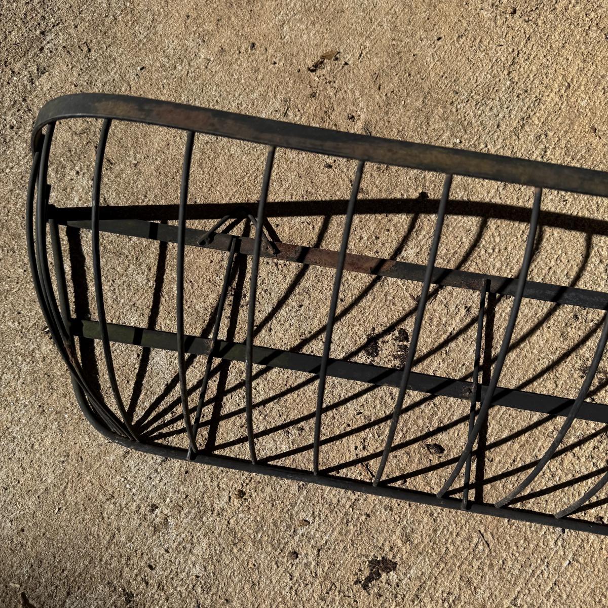 Three metal planters. One is a sturdy iron stand painted white. It is a bit rusty. The stand measures 30” x 14” x 25.5”H. Two black metal planters are included as well. The bigger one has some rust and the smaller one has a small area that is peeling.