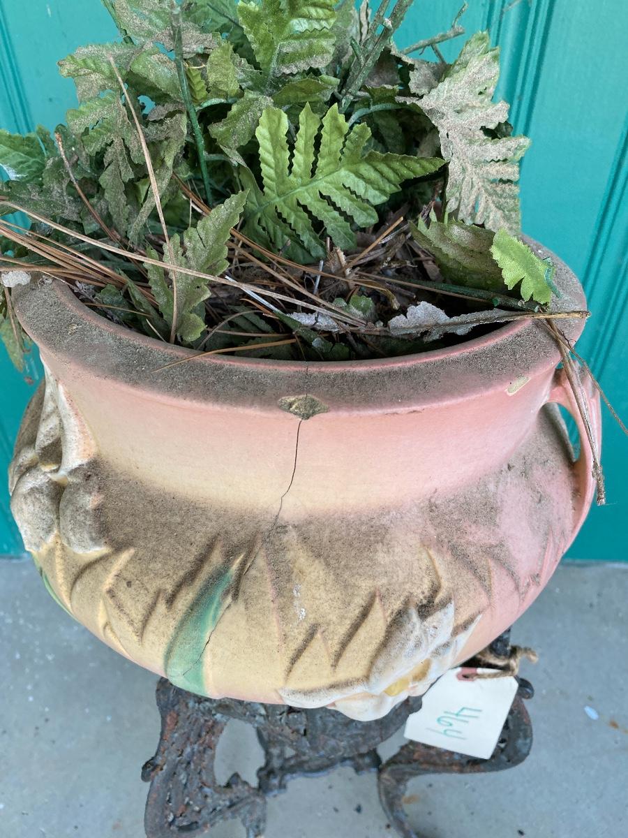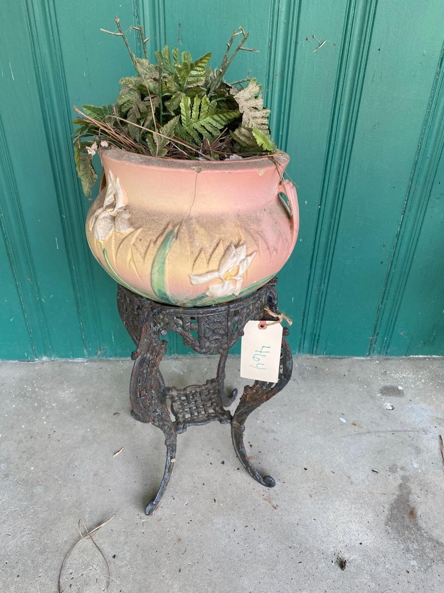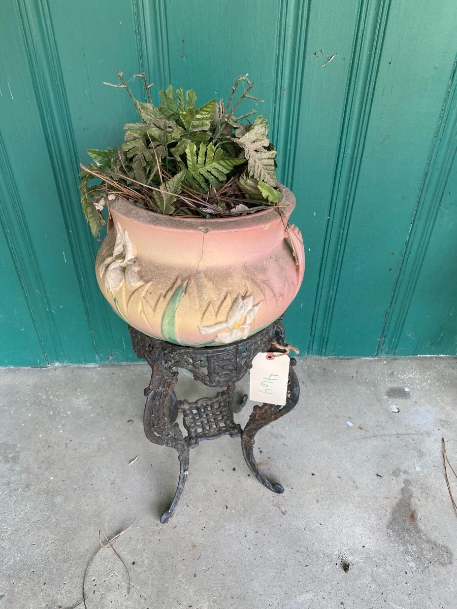 LOT 464 Iron Plant Stand w/ Roseville Planter, Planter is Cracked
