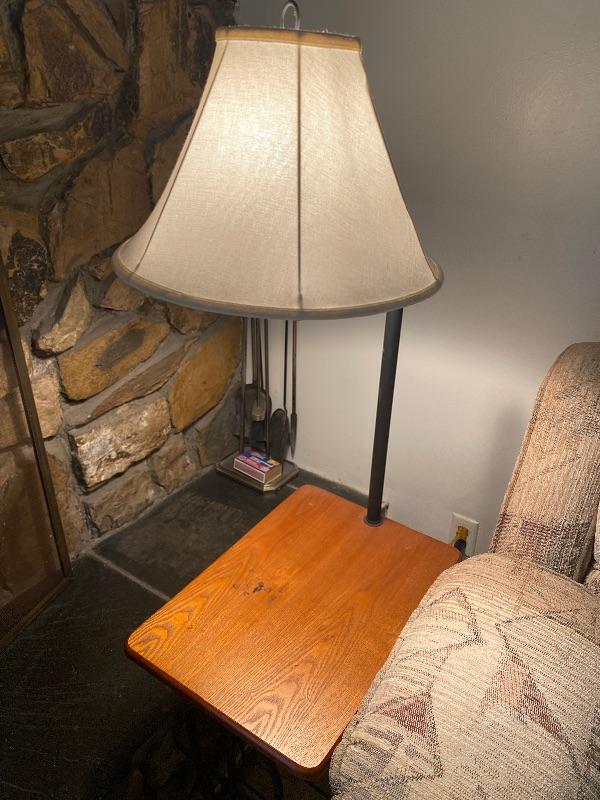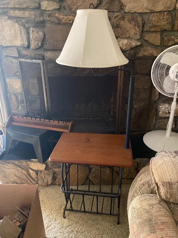 Iron side table with wood top and lamp all in one. Has a magazine rack base under table top. Table is 20”x14”. Total height is about 53”. Something sticky on table surface, unsure how clean it might get.