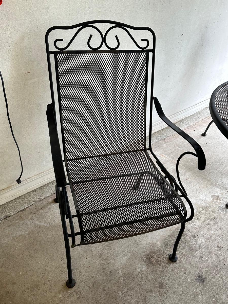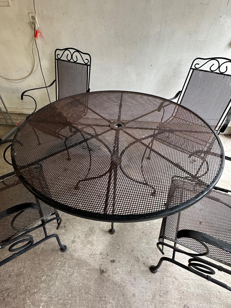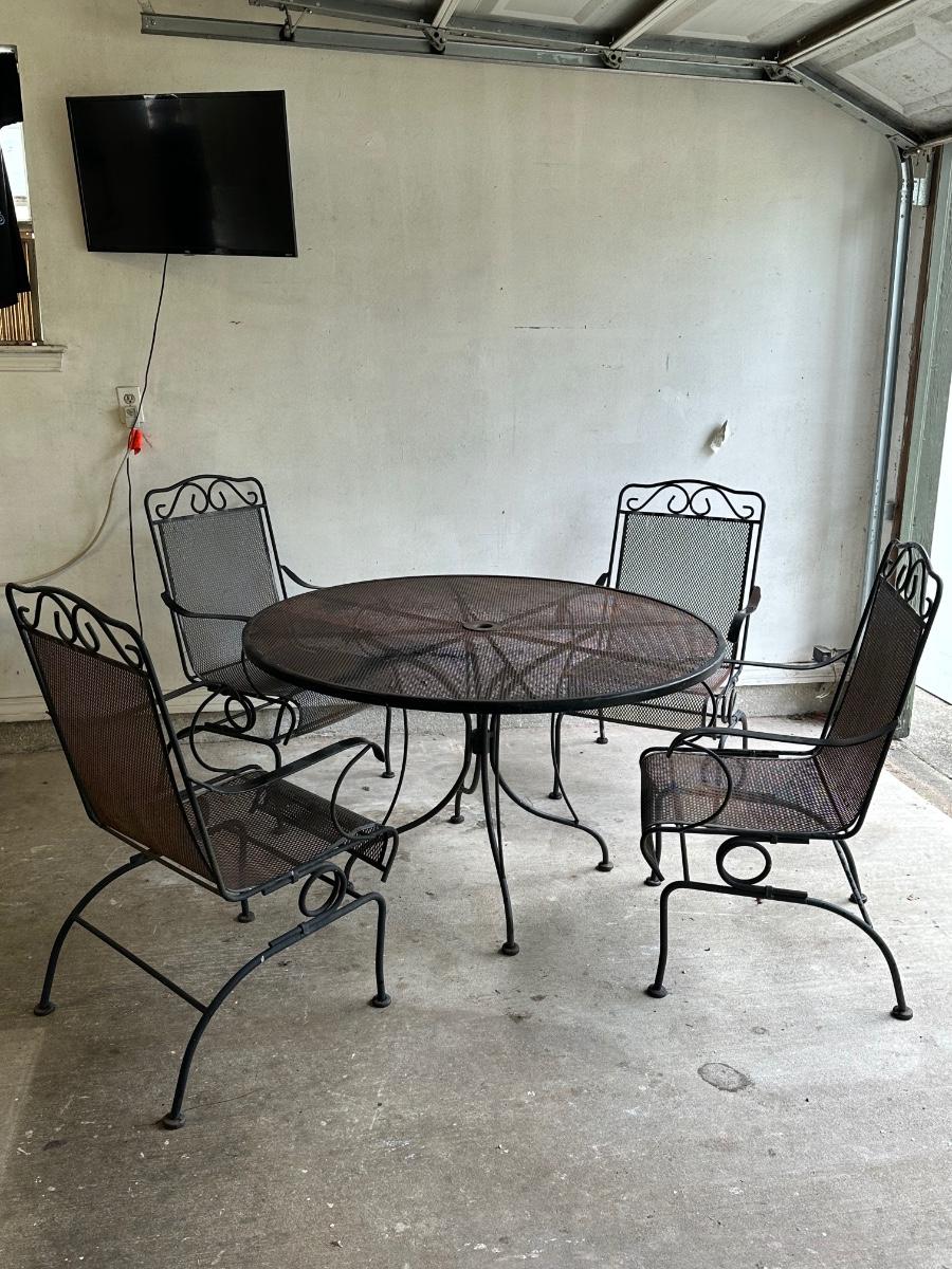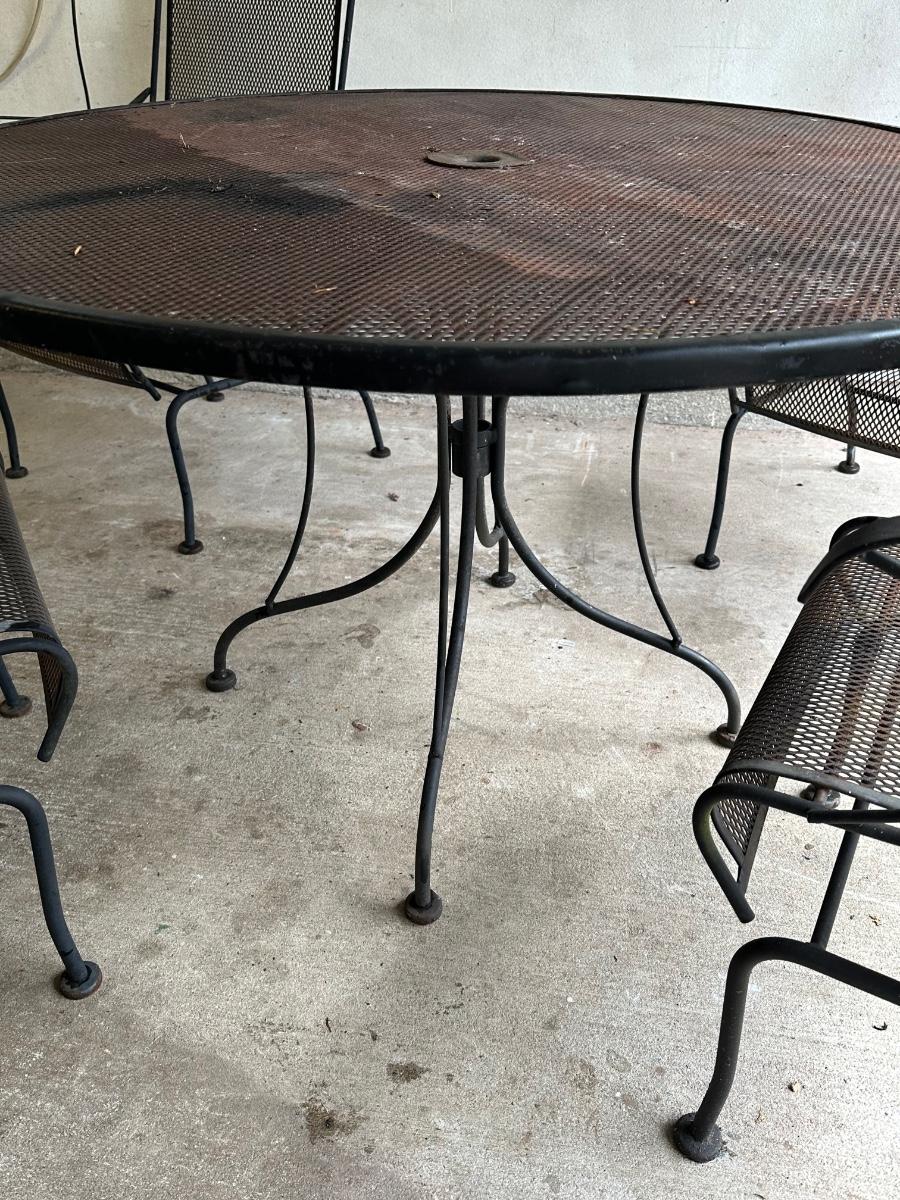 In need of some TLC ~ new paint job needed ~ minor surface rust on table & Chairs ~ table is 29” H x 48” Round ~ all chairs rock ~ No major damage ~