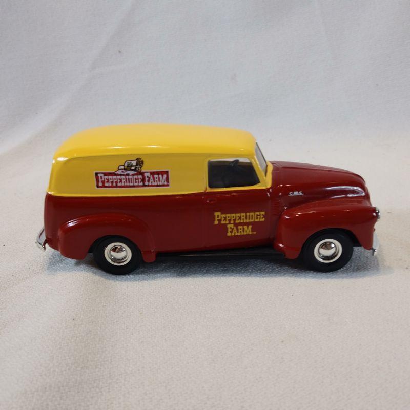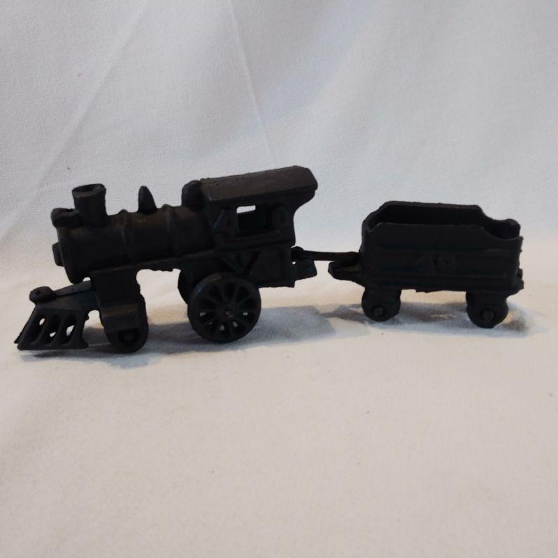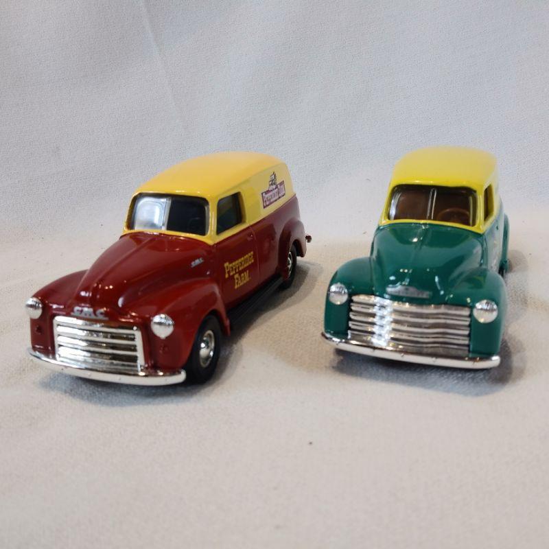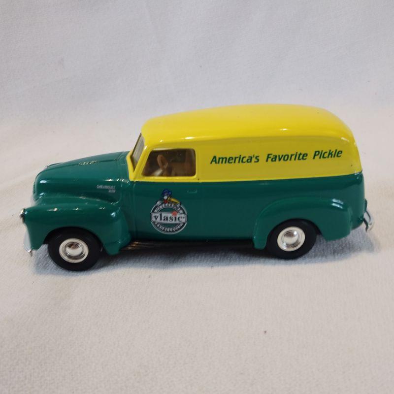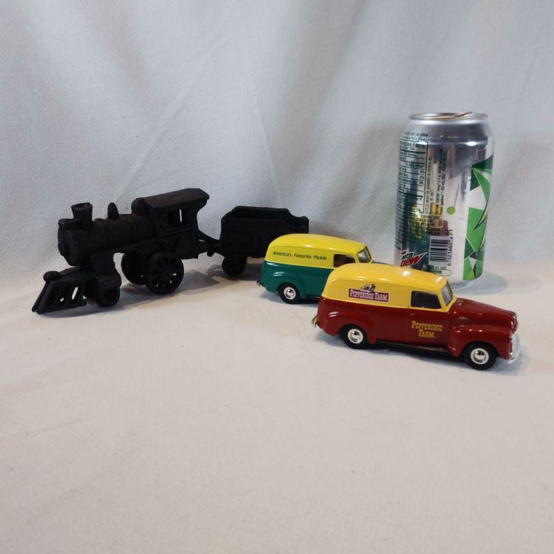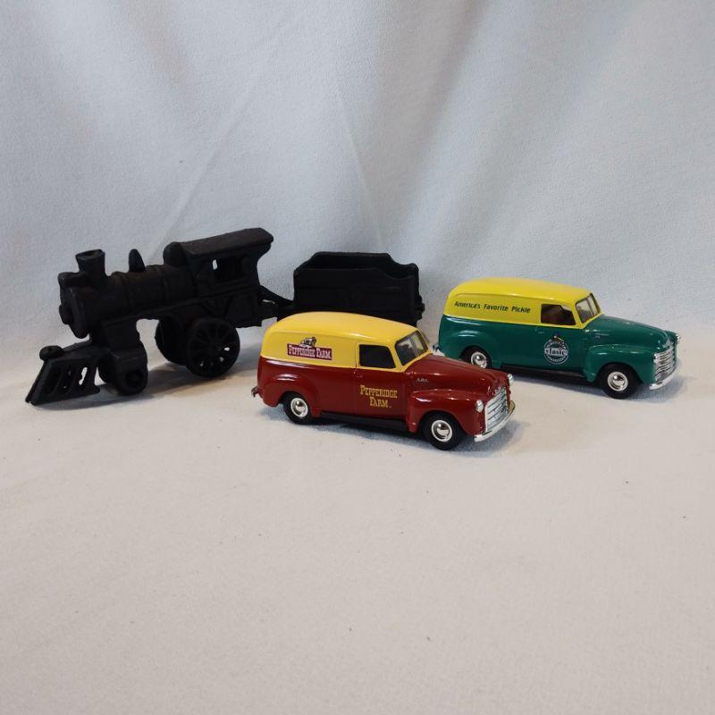 This is a grouping of collectibles. An all iron train with coal car - overall size is 9-inches long X 3-inches tall. The two GM Panel trucks are advertising Pepperidge Farm and Vlasic Pickles. The trucks are 4-1/2-inches long X 1-3/4-inches tall X 1-3/4-inches wide. All three items are newer and in very good condition.