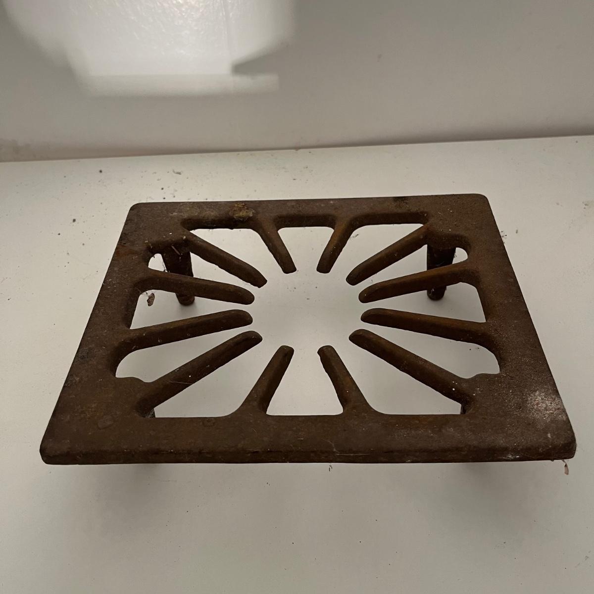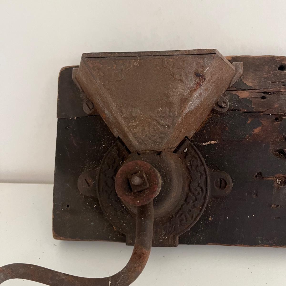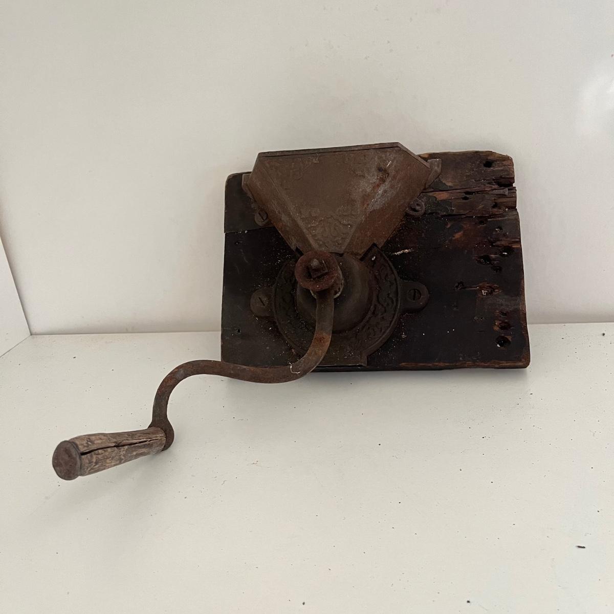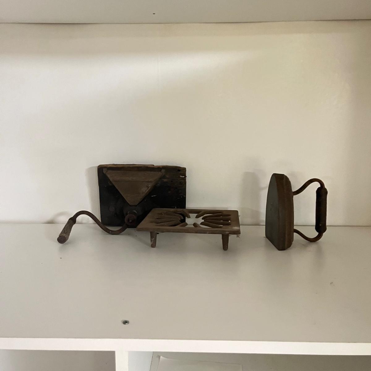 Lot includes an iron trivet, coffee grinder and an iron with #7 on it. Trivet measures 6.5” x 8” x 2”.