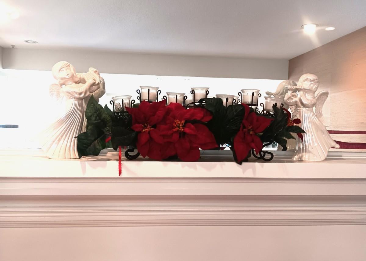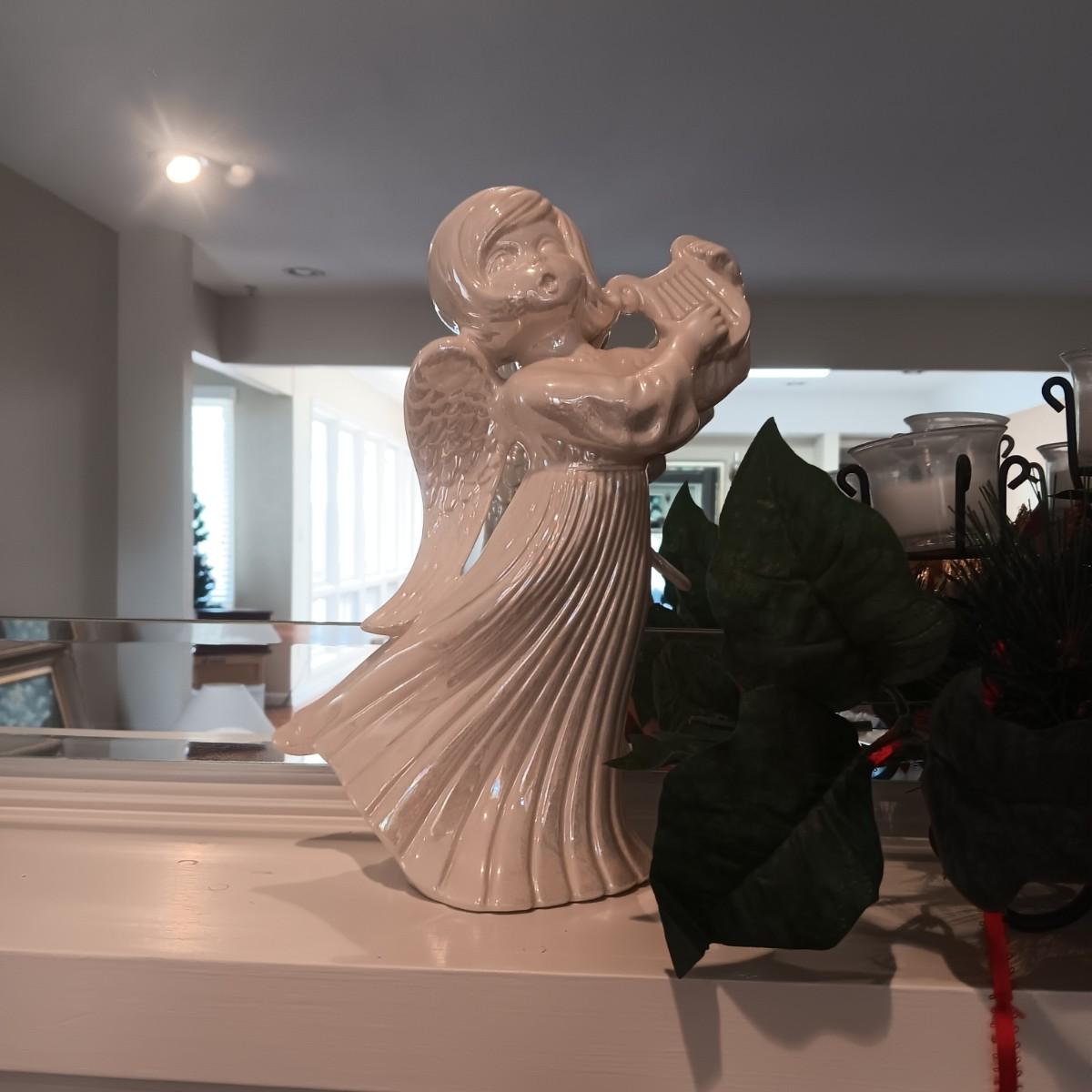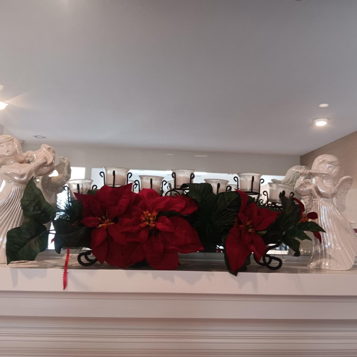 IRON VOTIVE CANDLE HOLDER CENTERPIECE AND 2 CERAMIC ANGELS