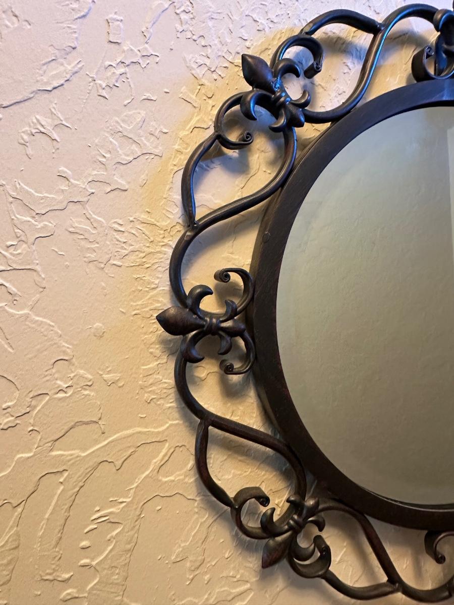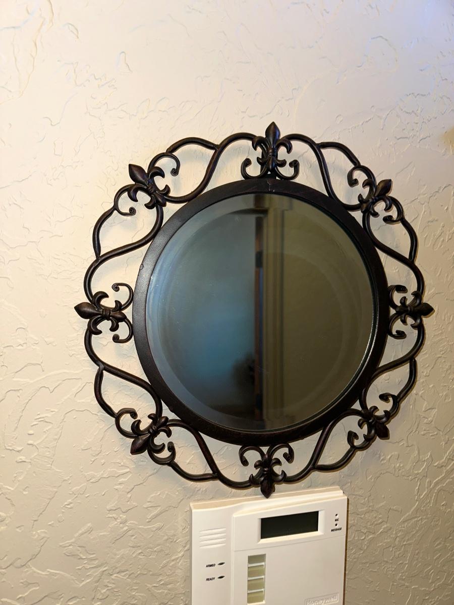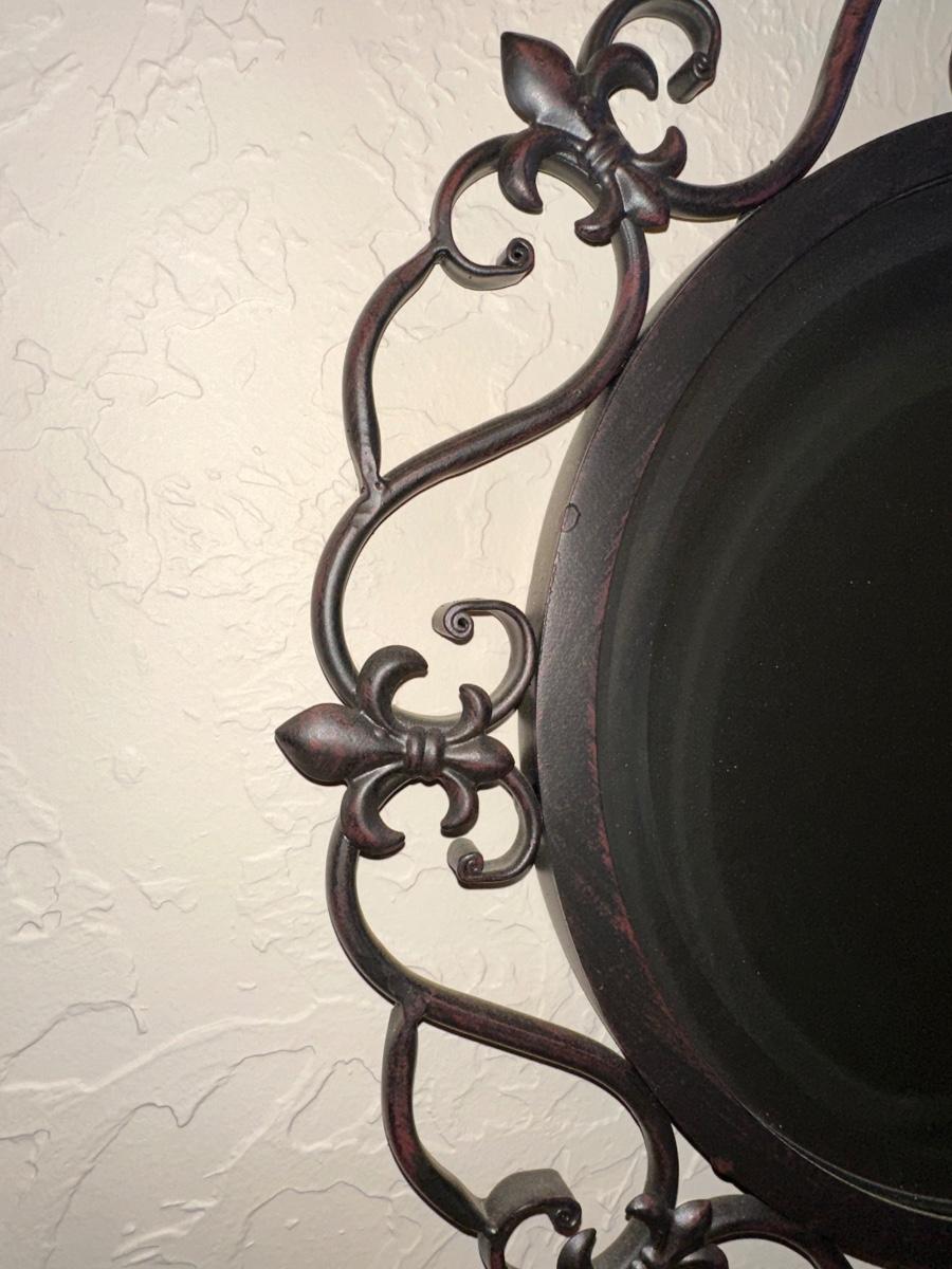 IRON WALL HUNG COAT RACK AND MIRROR PLUS A SIGN