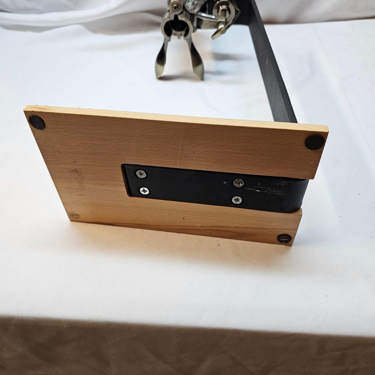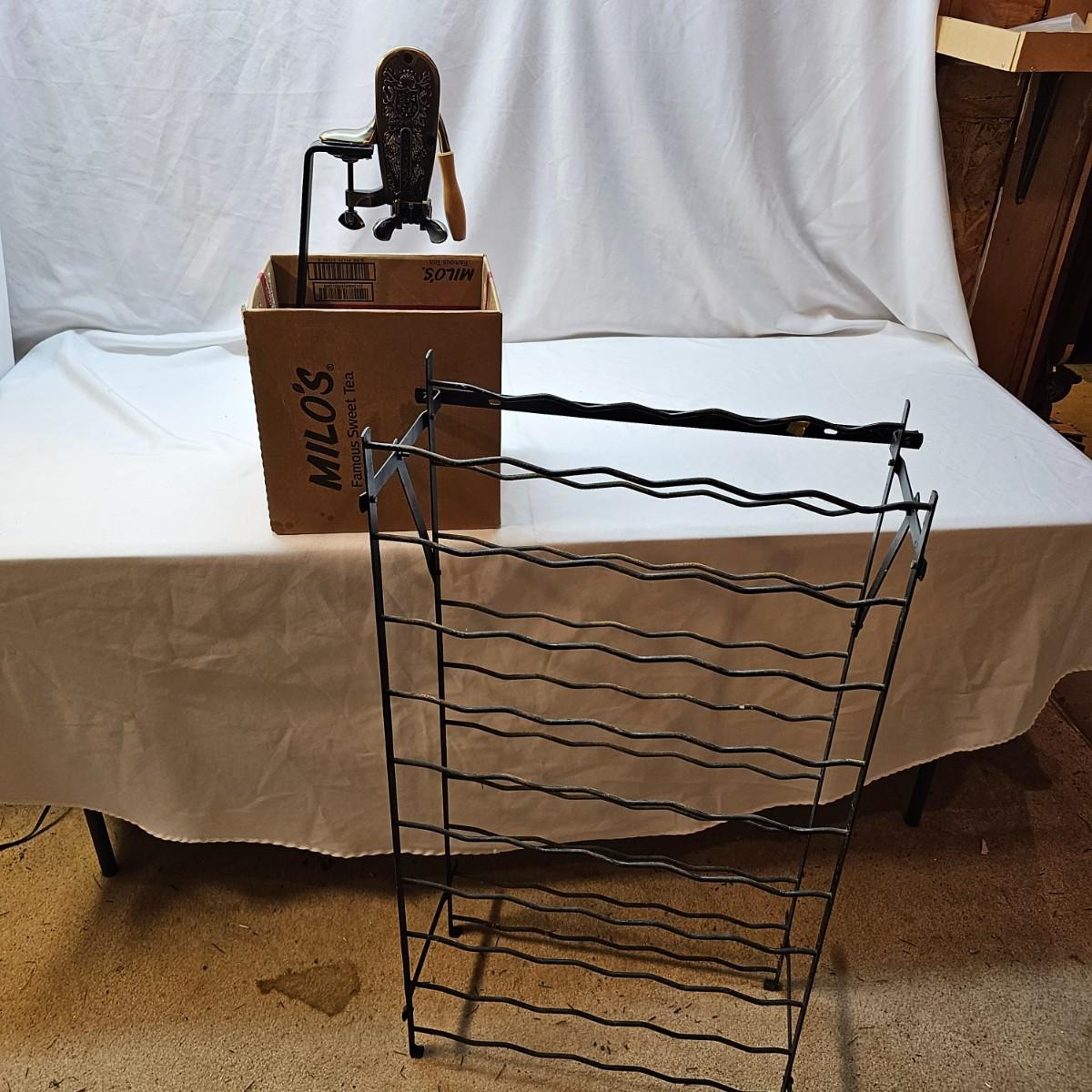An iron wine rack designed to sit on the floor and mount against the wall. Rack will hold 50 bottles, measures 24" x 12" x 40"H. Some rust and wear on sides and shelf. Also includes several bottle openers from the traditional style to a stand mounted hand crank Le Grape model. One battery operated opener, untested, and some fun cocktail napkins and plaques. See photos for details. Local pickup only.