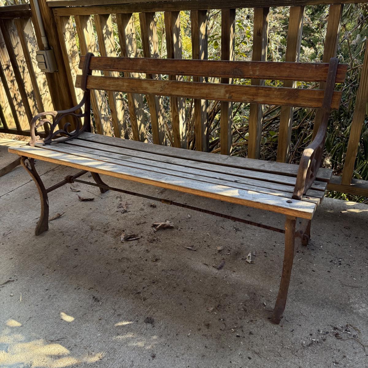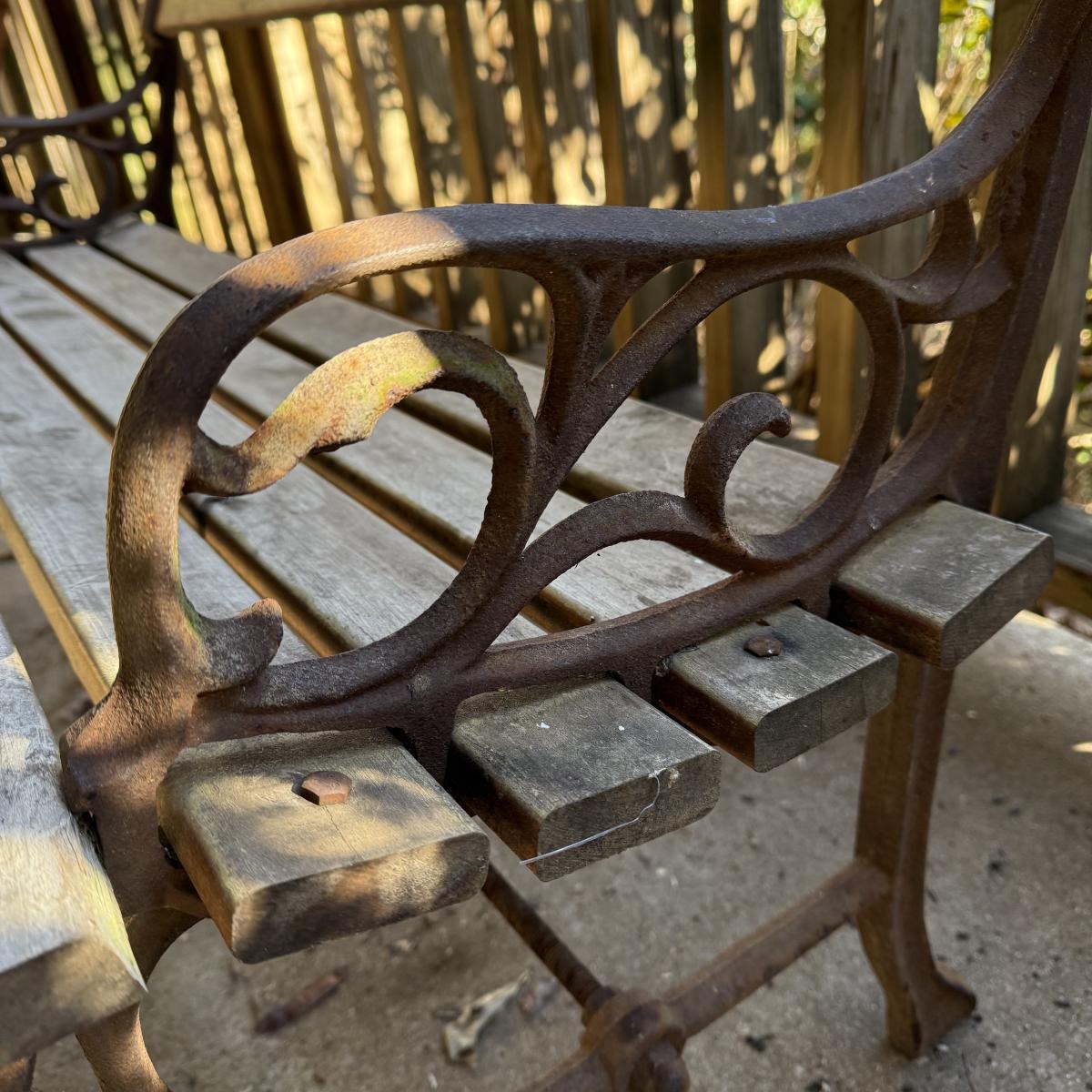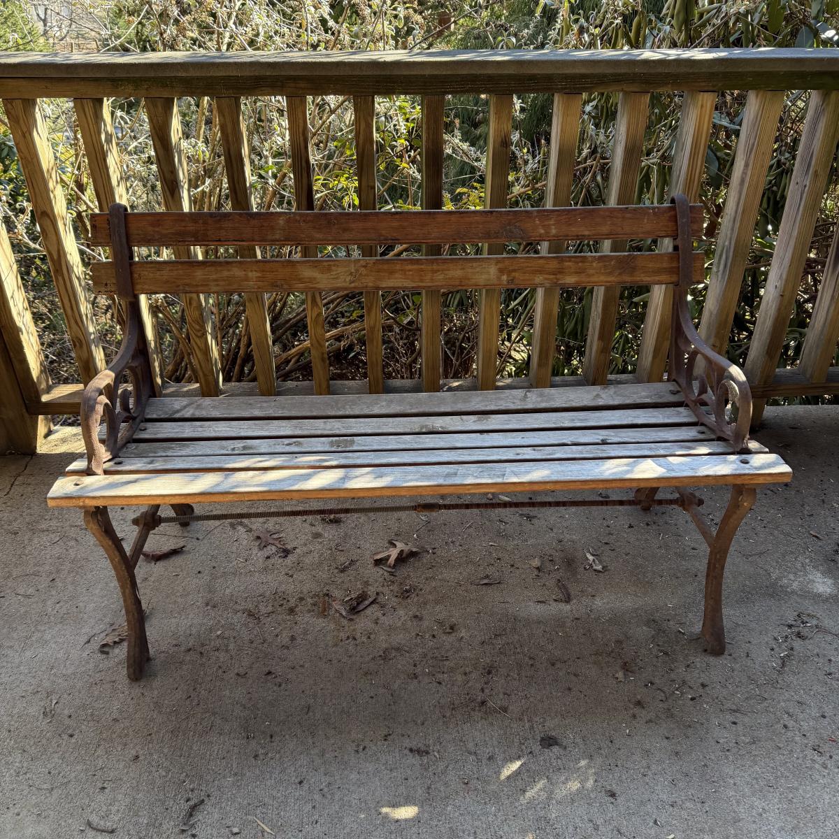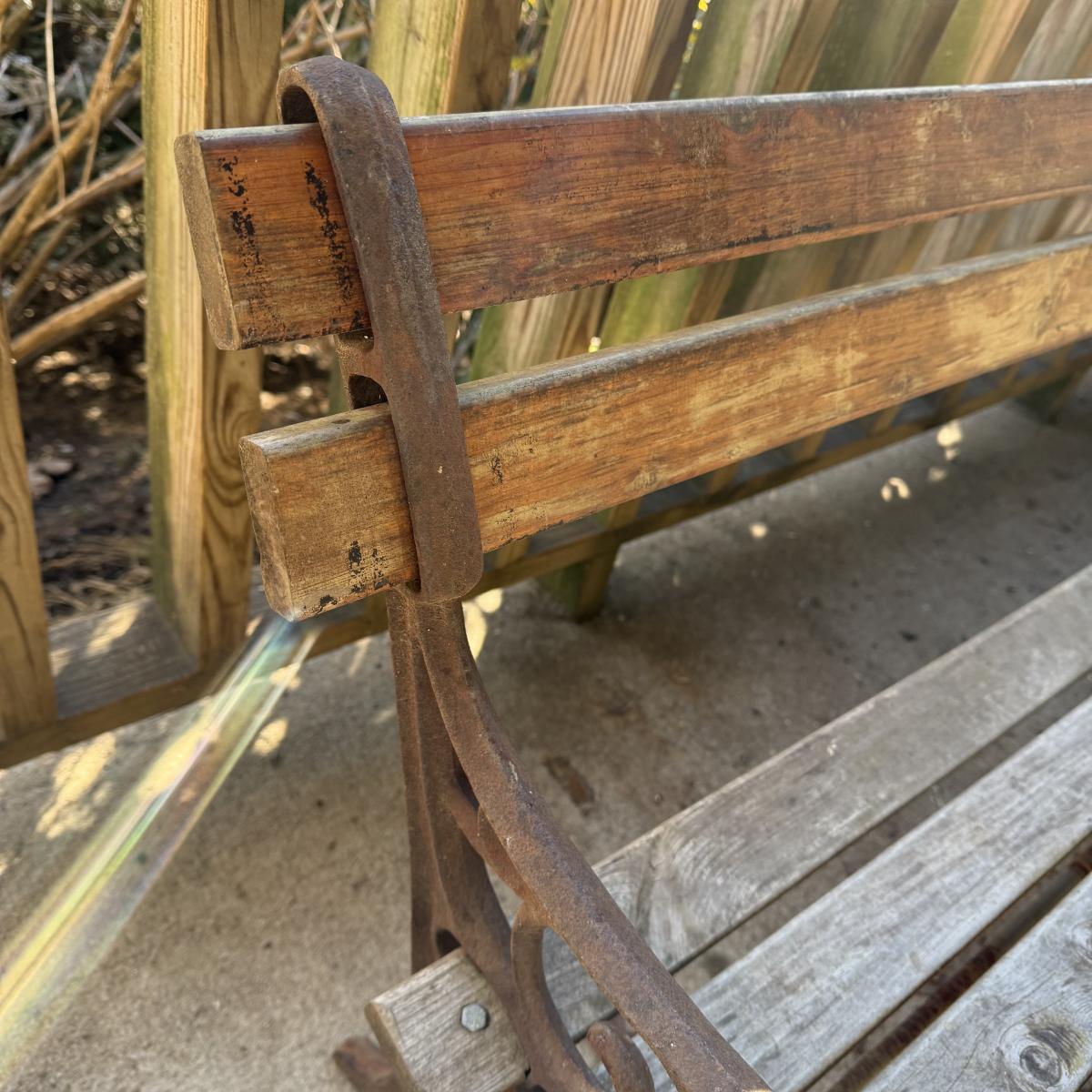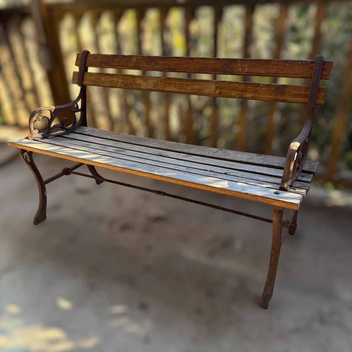 Sweet bench with an iron base and wood slat seat and back. Though the finish is worn and the iron is rusted, it is sturdy and intact. The bench measures 47” x 19” x 26”H with a 15.5” seat height. It is a bit heavy.