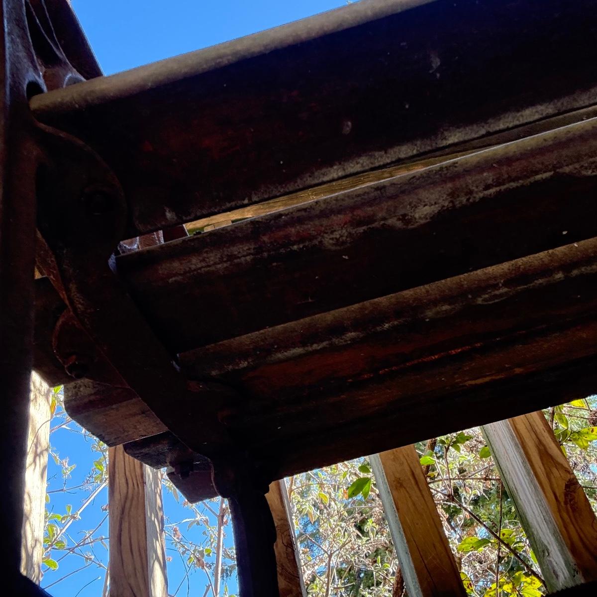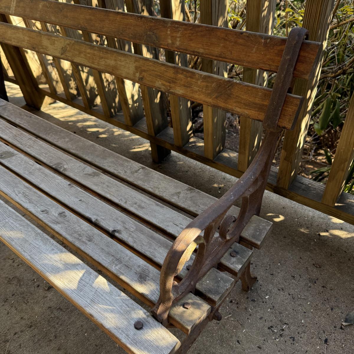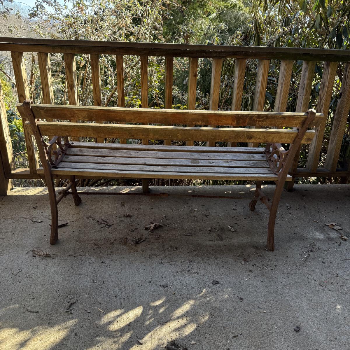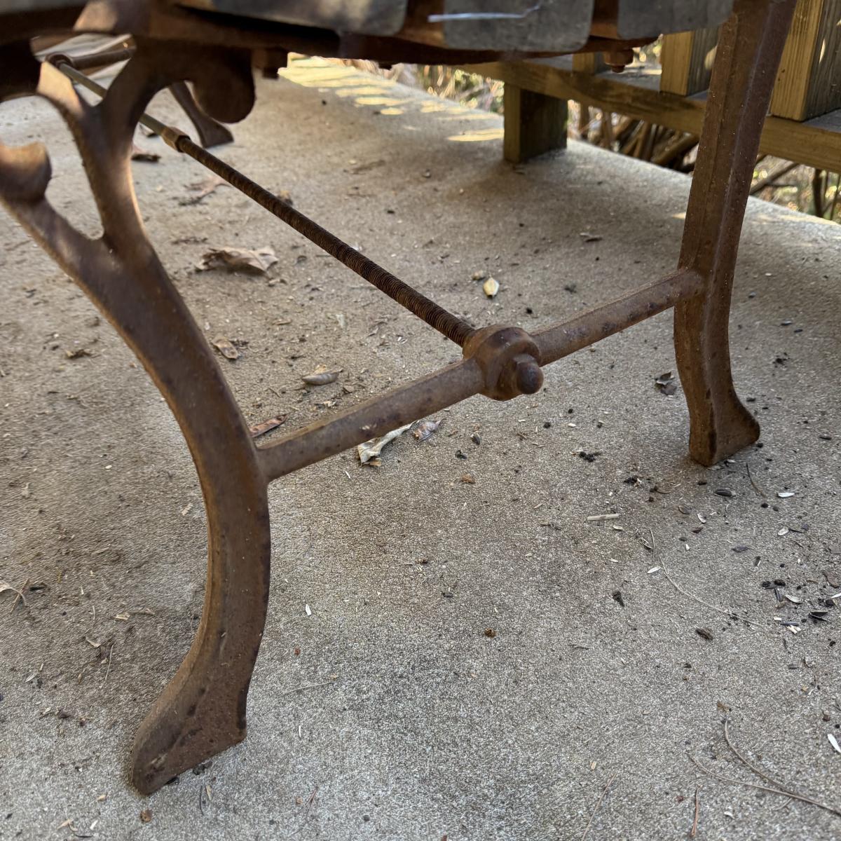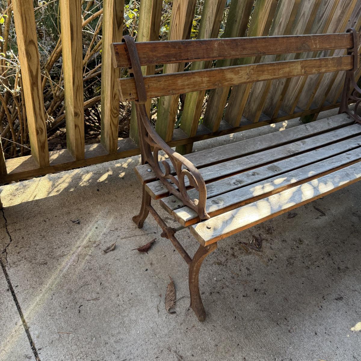 Sweet bench with an iron base and wood slat seat and back. Though the finish is worn and the iron is rusted, it is sturdy and intact. The bench measures 47” x 19” x 26”H with a 15.5” seat height. It is a bit heavy.