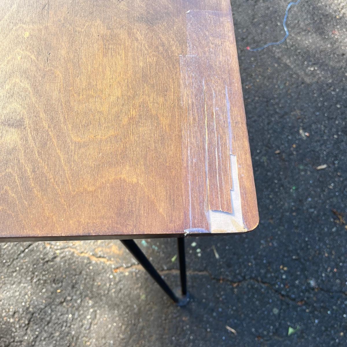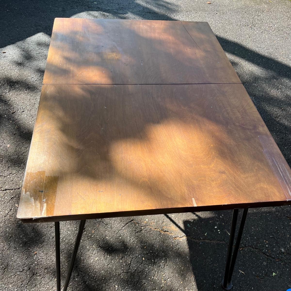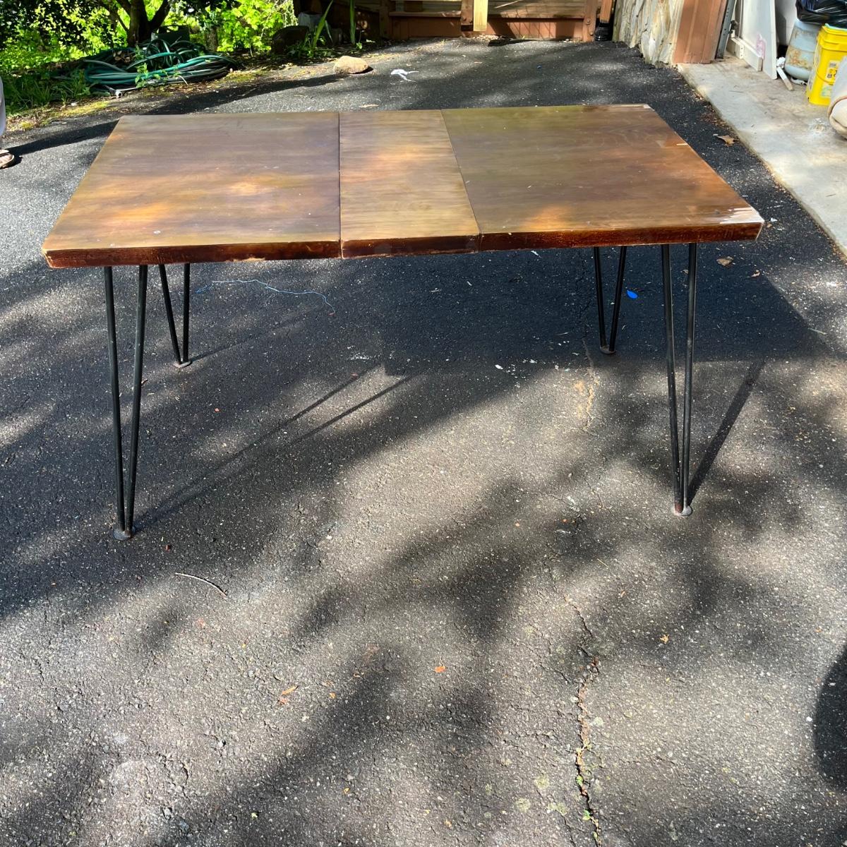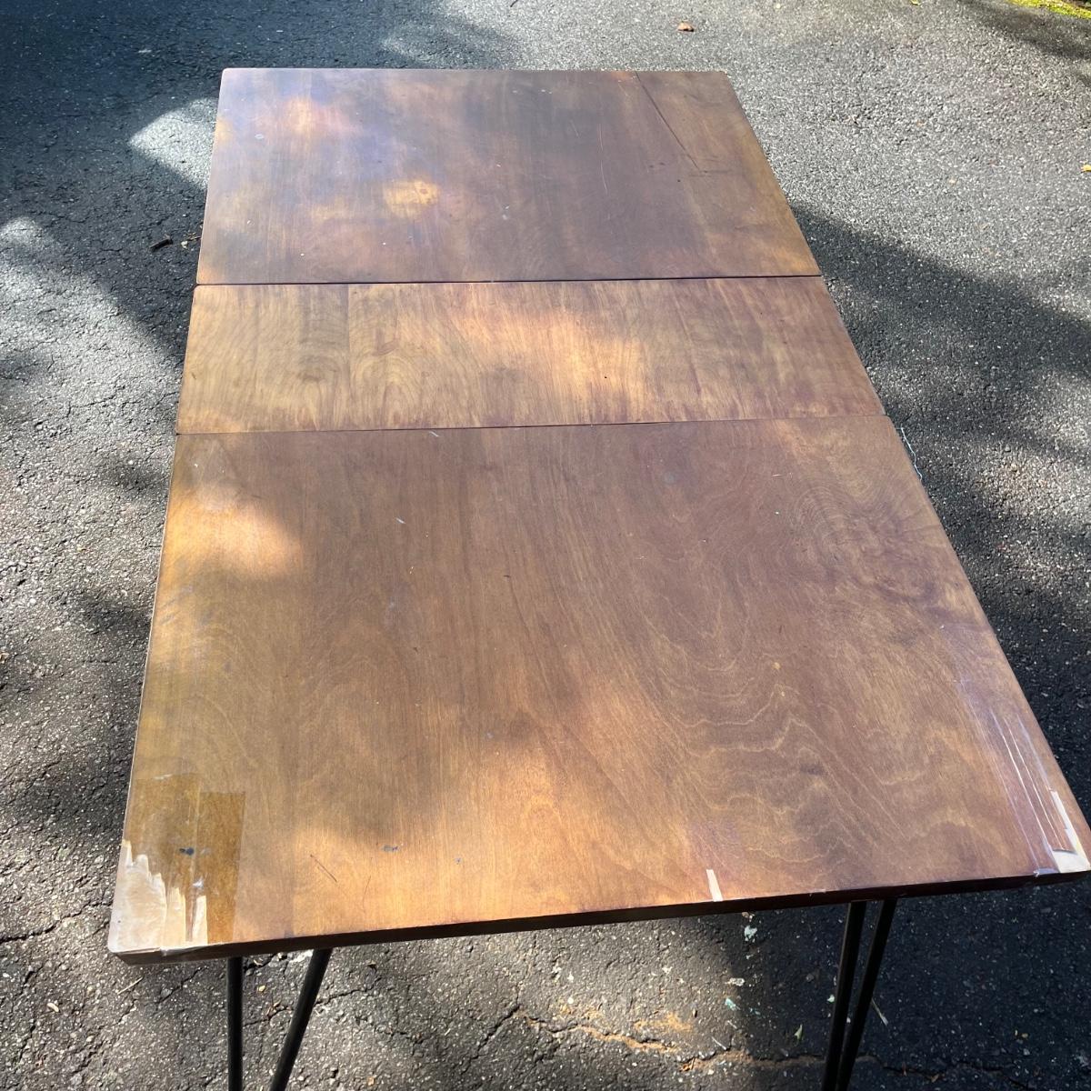 Lot includes a wooden and iron legged table. Table has one leaf and measures 52” x 30” x 28.5” with leaf in. Veneer is missing on top of table, see pictures. Leaf measures 10” wide.
