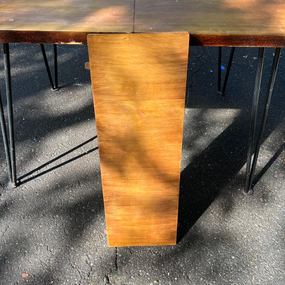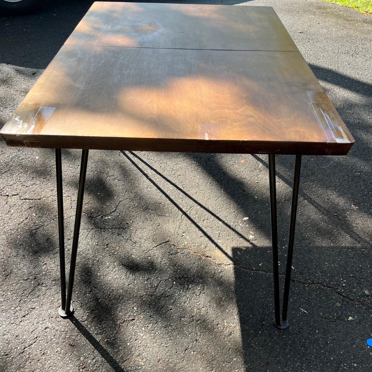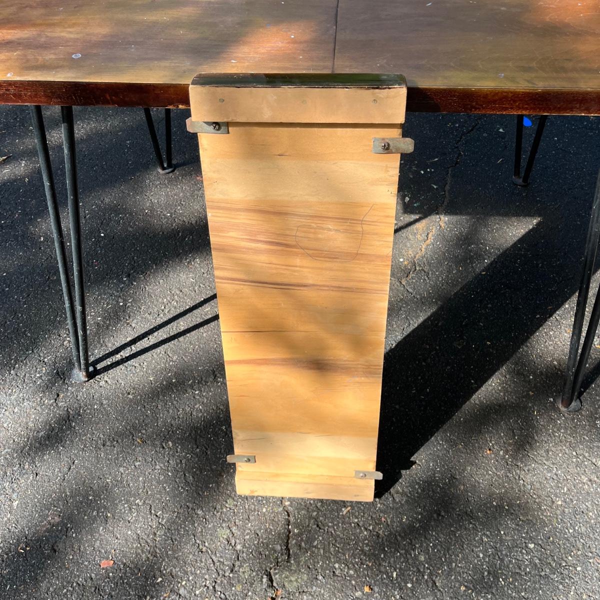 Lot includes a wooden and iron legged table. Table has one leaf and measures 52” x 30” x 28.5” with leaf in. Veneer is missing on top of table, see pictures. Leaf measures 10” wide.
