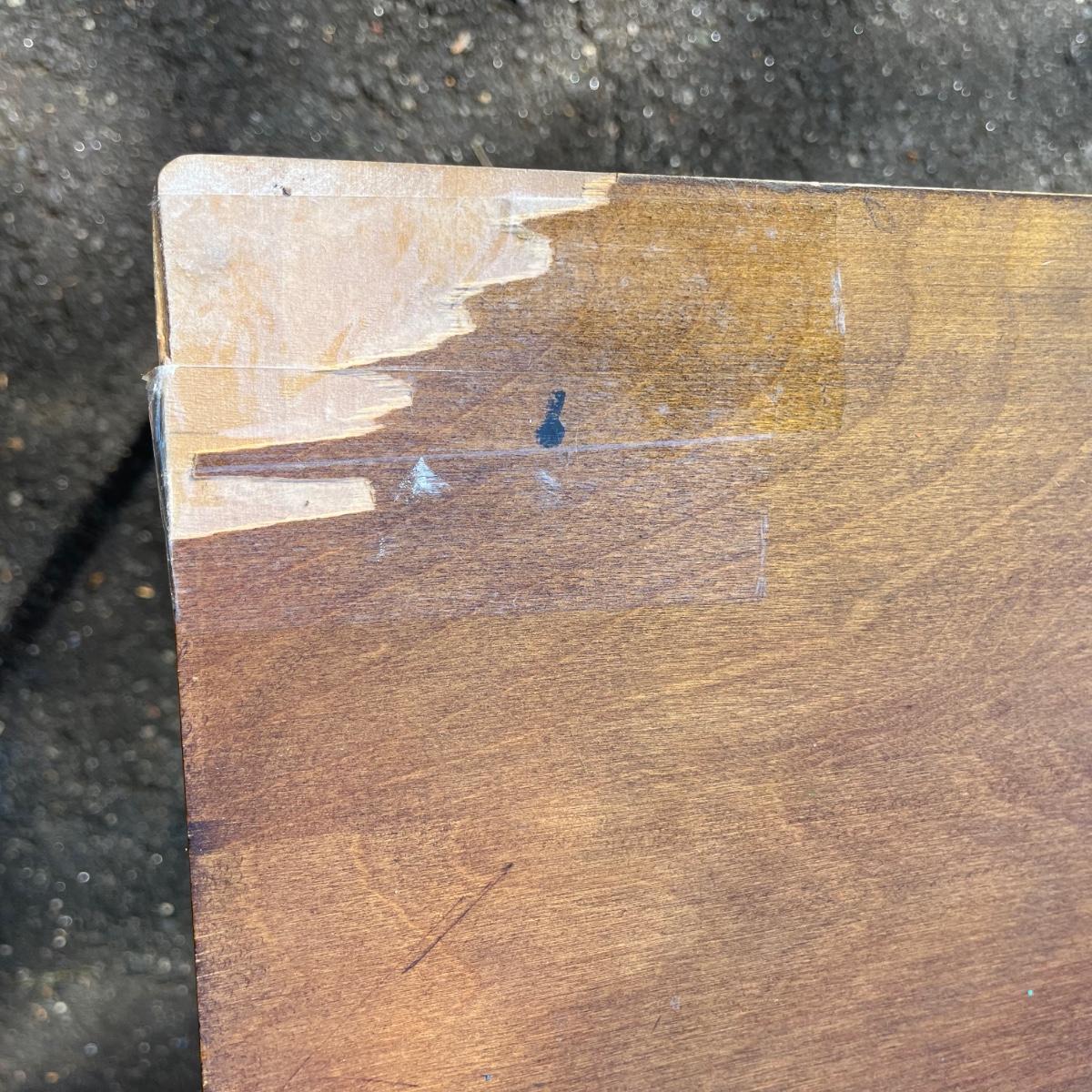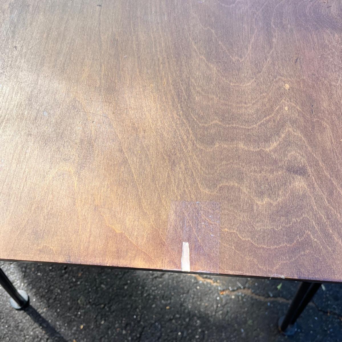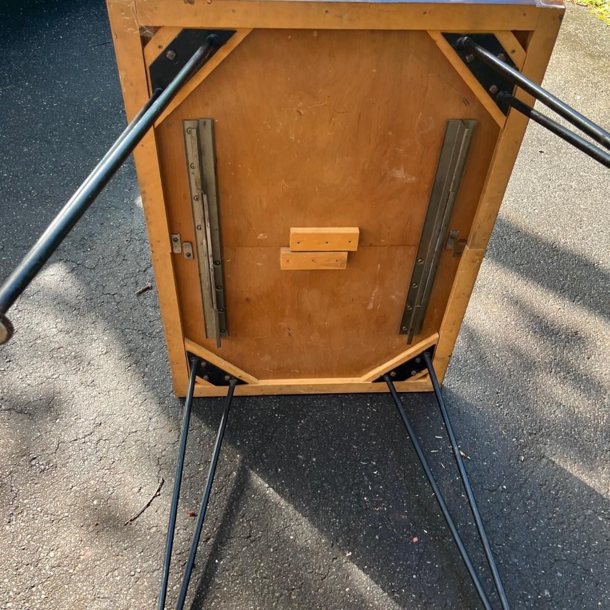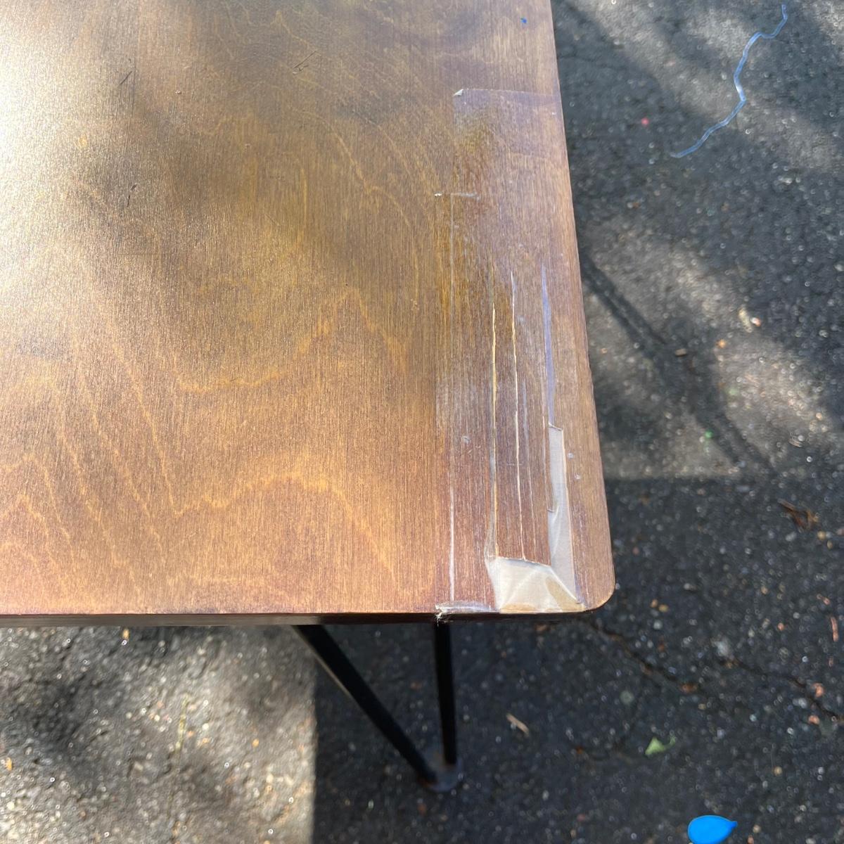 Lot includes a wooden and iron legged table. Table has one leaf and measures 52” x 30” x 28.5” with leaf in. Veneer is missing on top of table, see pictures. Leaf measures 10” wide.