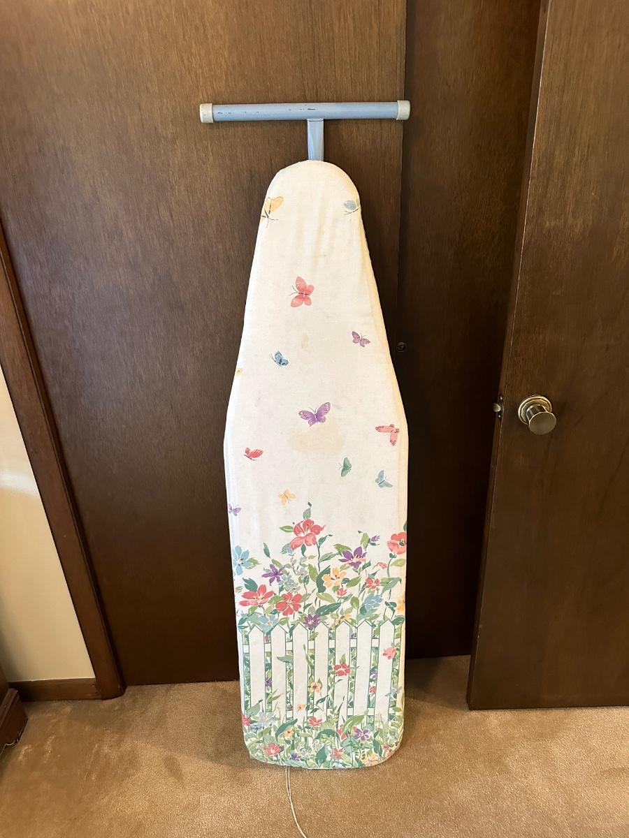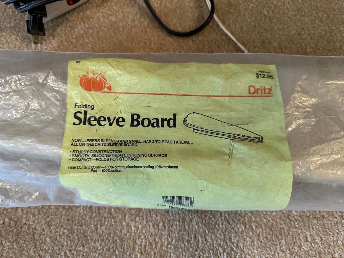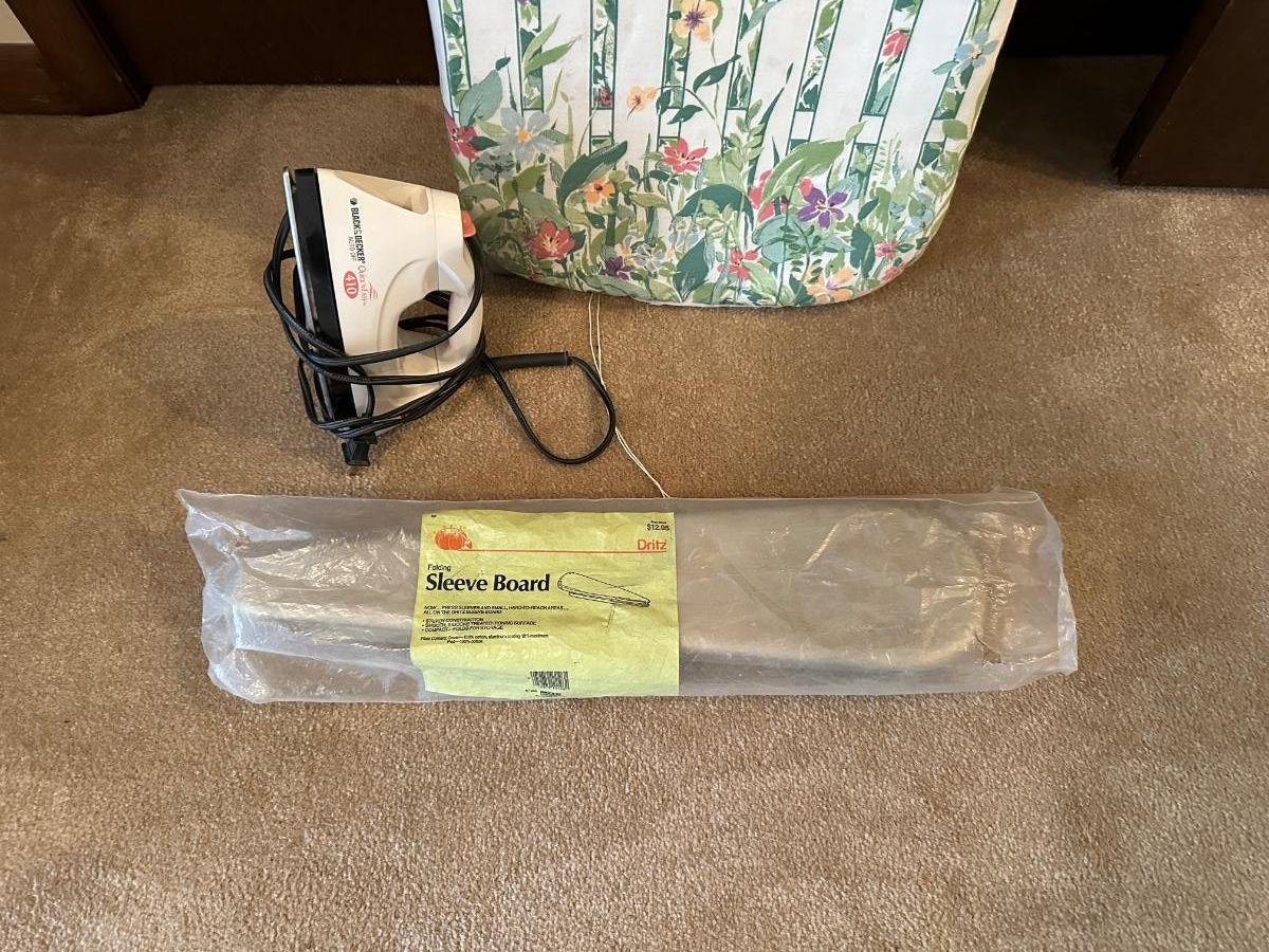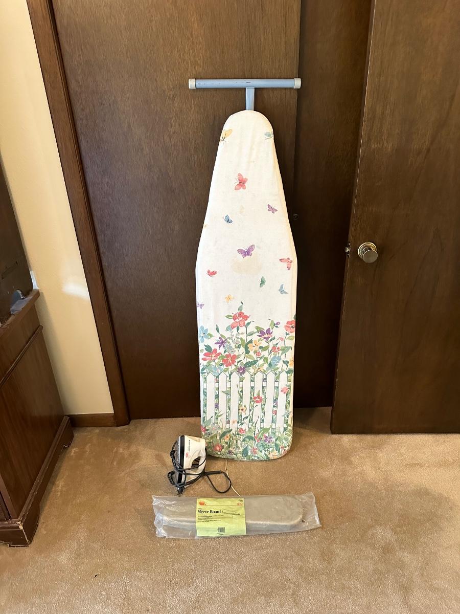 IRONING AND SLEEVE BOARD PLUS A CLOTHES IRON