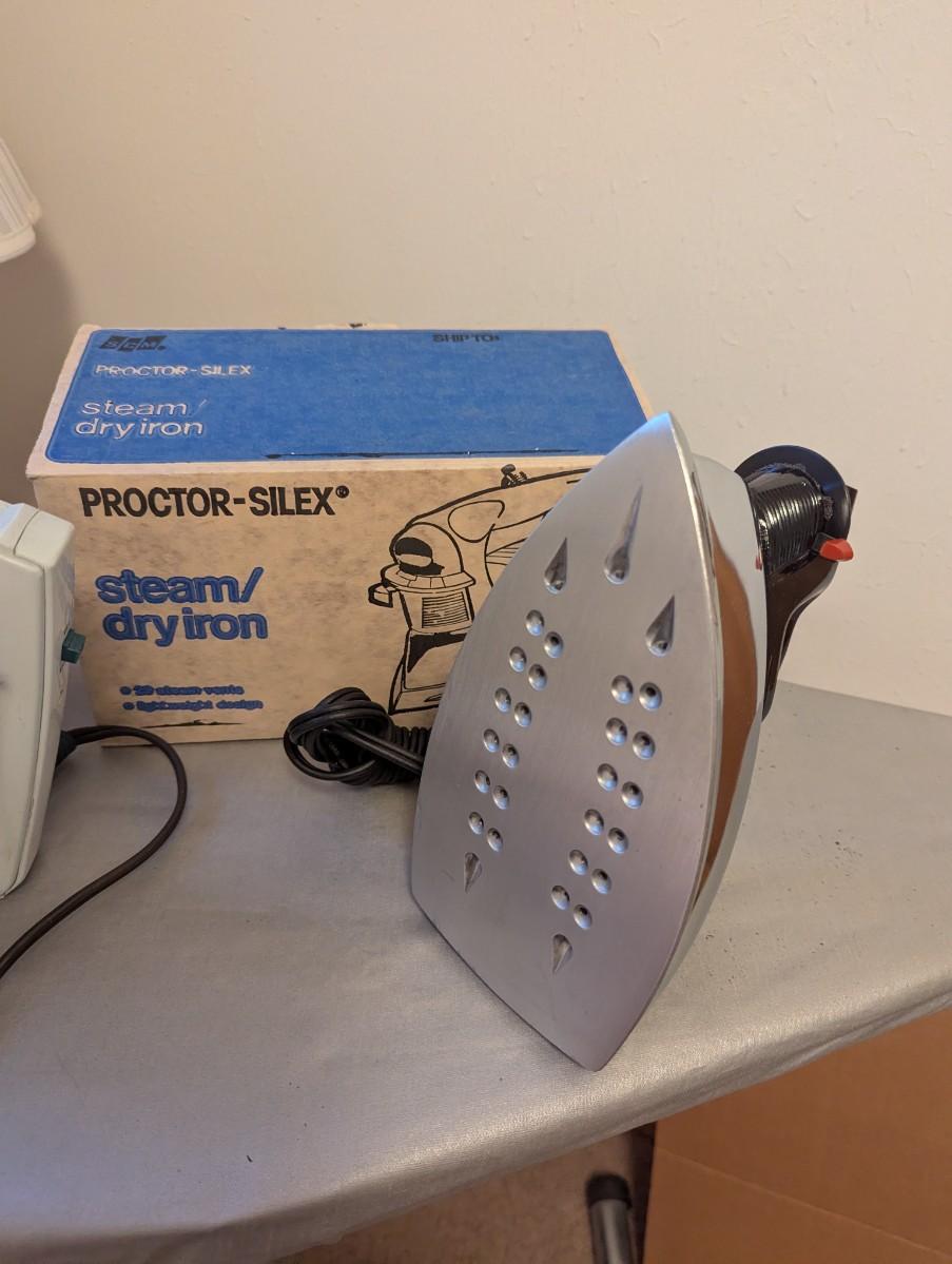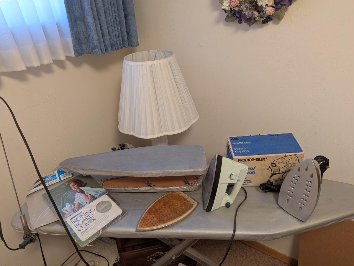 This lot contains a vintage Ironing board, sleeve ironing board, ironing board cover, 2 Irons, metal cord holder, and a accessory that makes ironing smoother. See all the pictures.