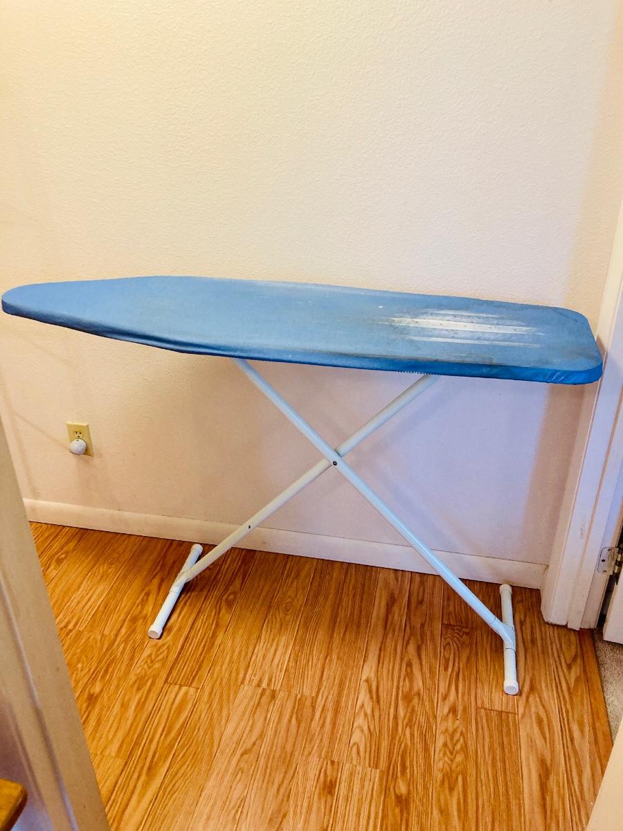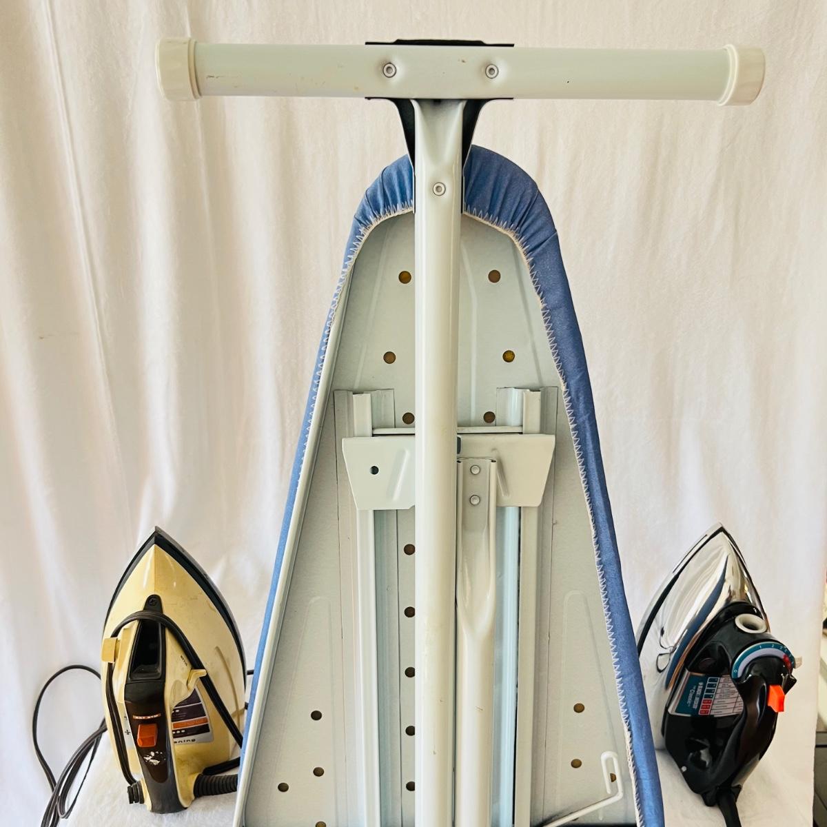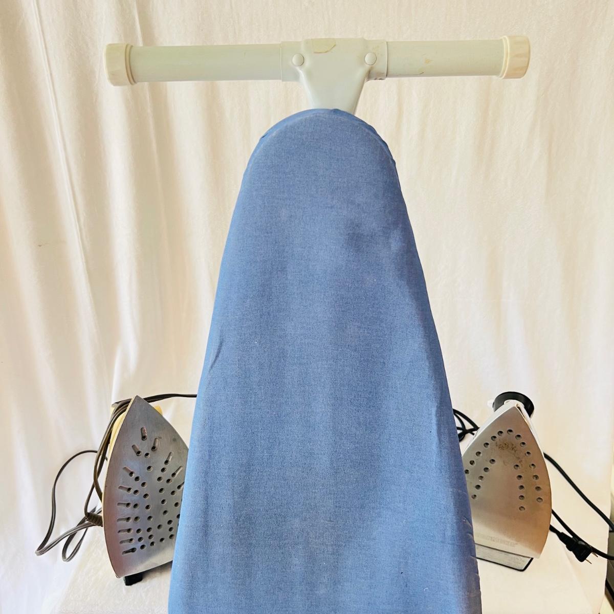 Ironing Board with two irons. Irons power on when plugged in. Ironing Board in good condition but could use a pad replacement.