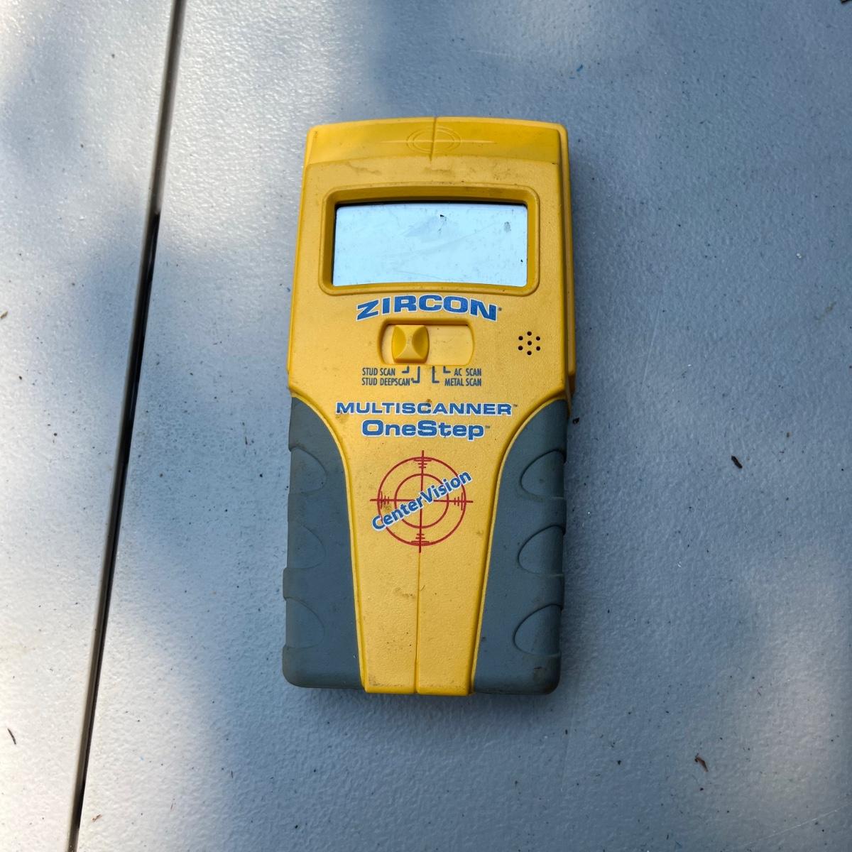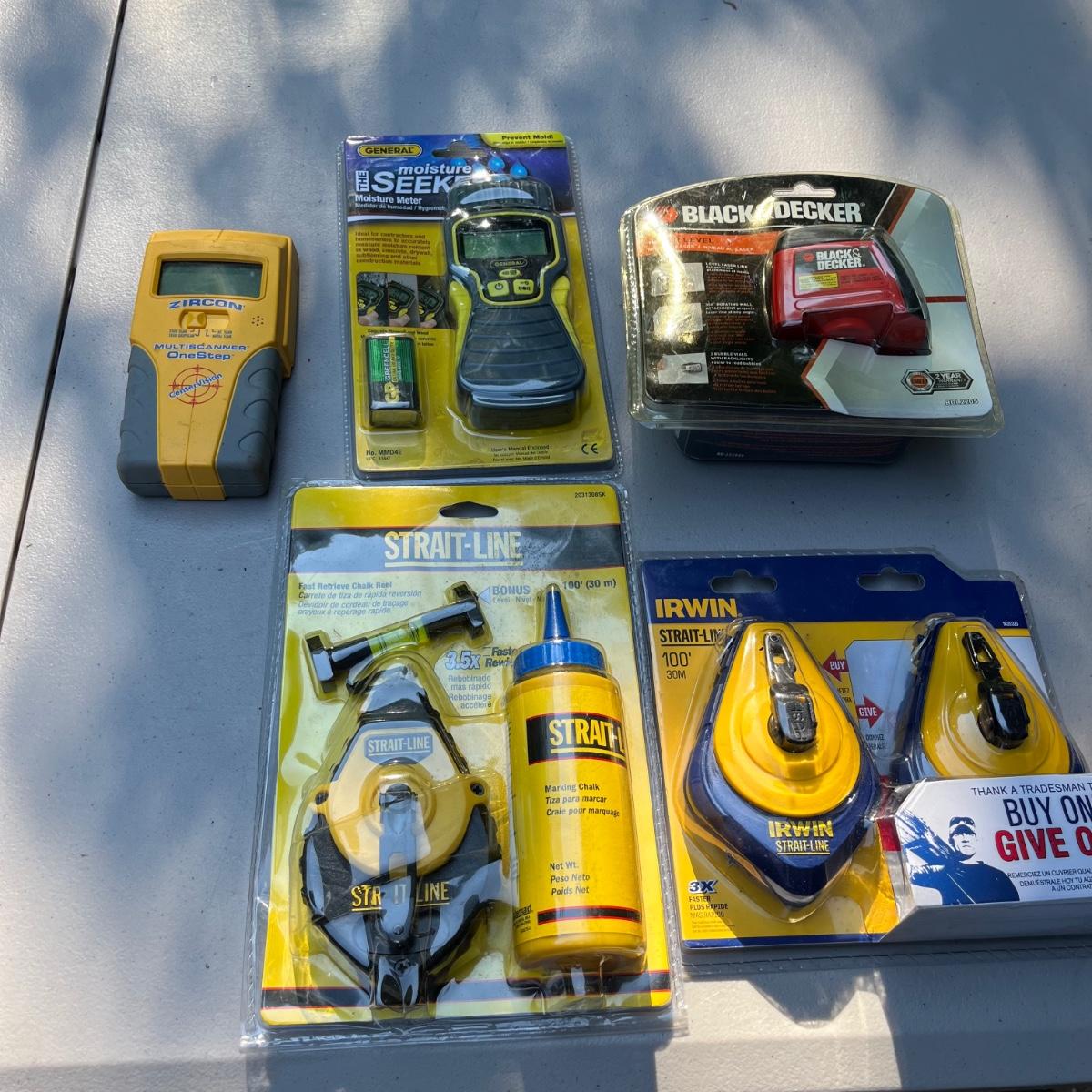 Lot includes a single and two pack of Strait Line chalk reels, Black & Decker laser level, General moisture seeker and a Zircon stud finder.