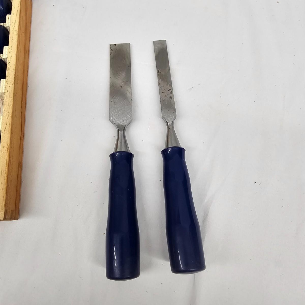 Set of six Irwin Marples chisels in fitted wood case. Sizes run from 1/4" to 1" wide blades. Each chisel has a fitted protective cap over the blade end. Box measures 12.5" x 11" x 2"H. See photos for details. Shipping available.