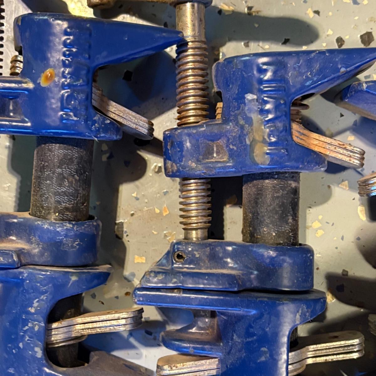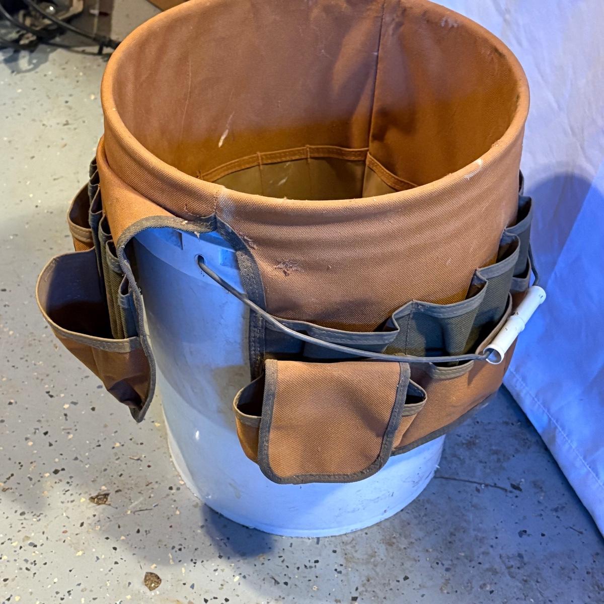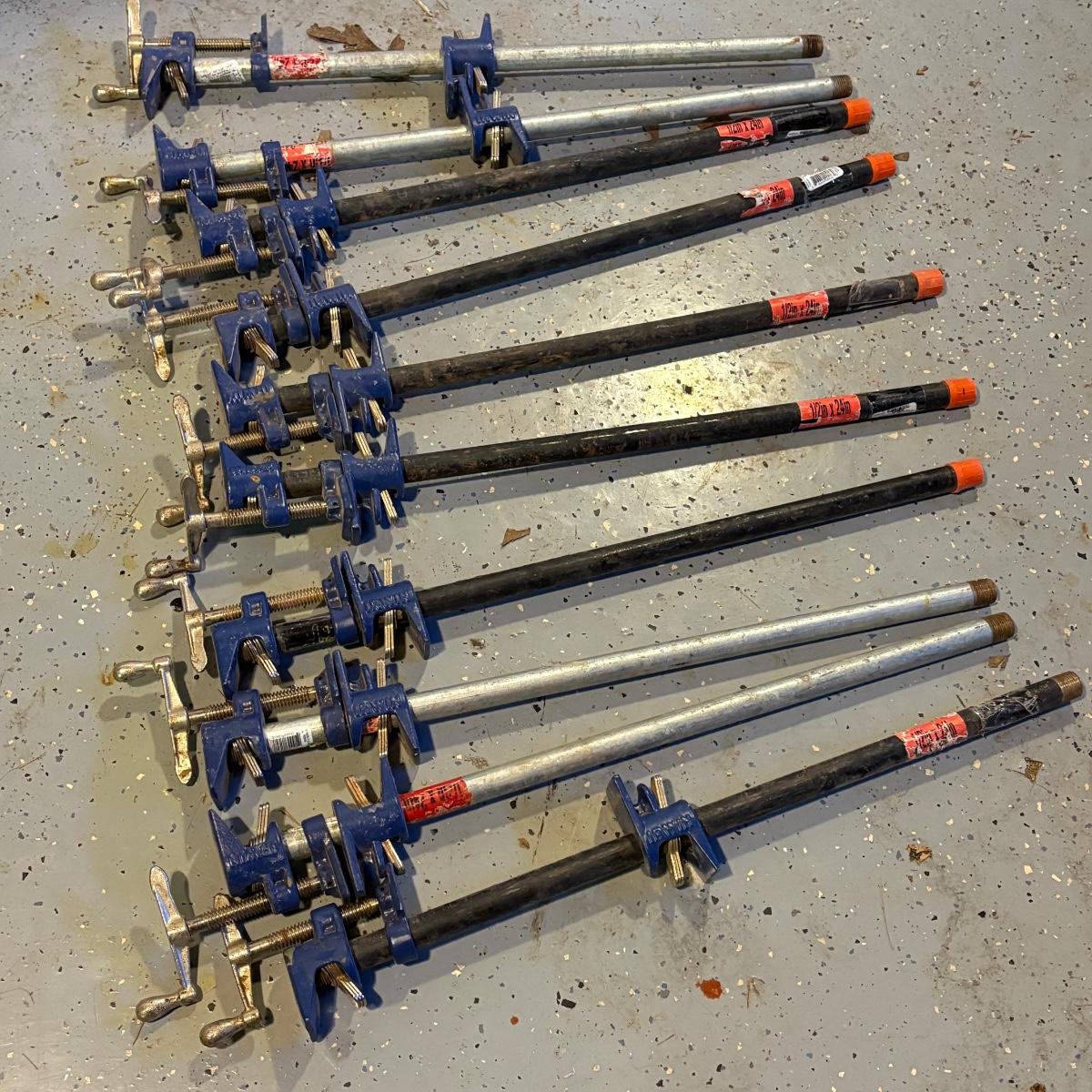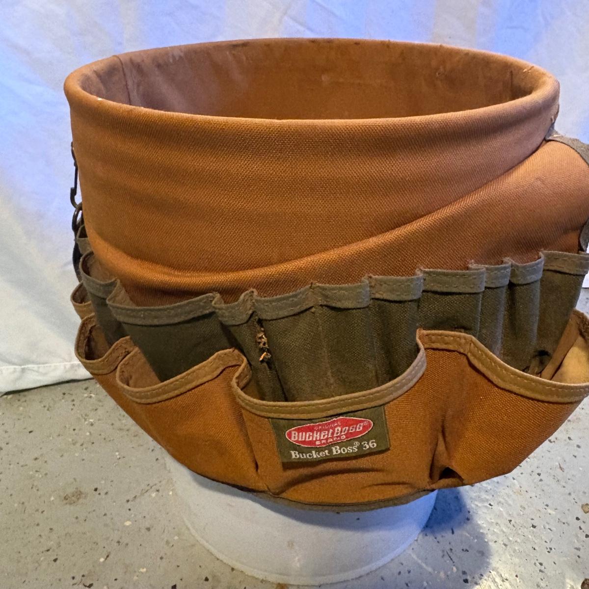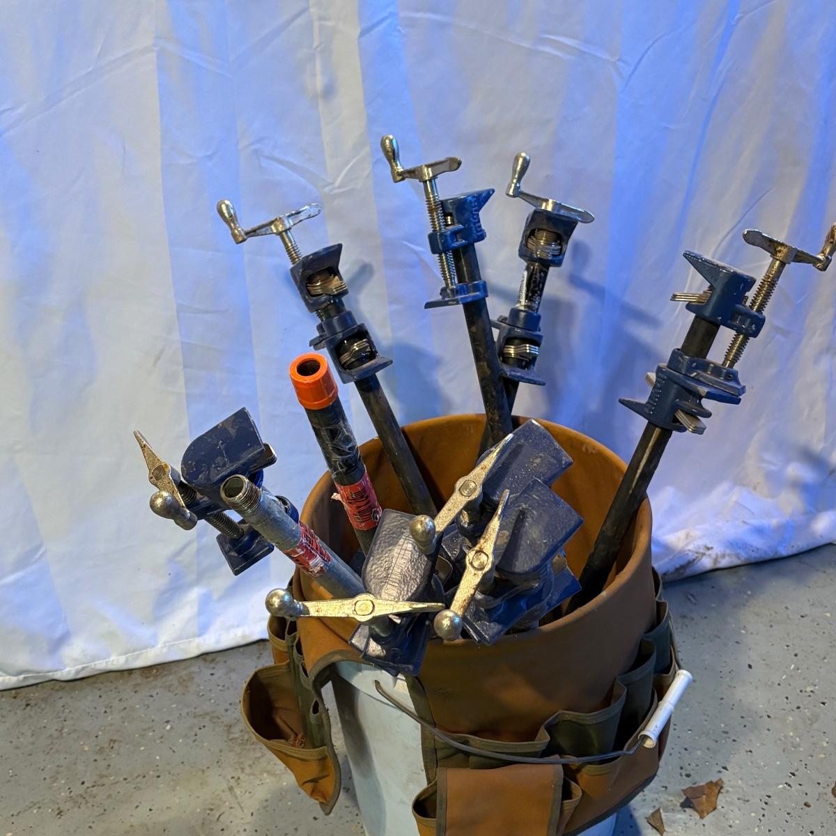 Ten Irwin pipe clamps and ten 1/2” x 24” pipes. Five gallon bucket with a canvas Bucket Boss 36 tool organizer is included.