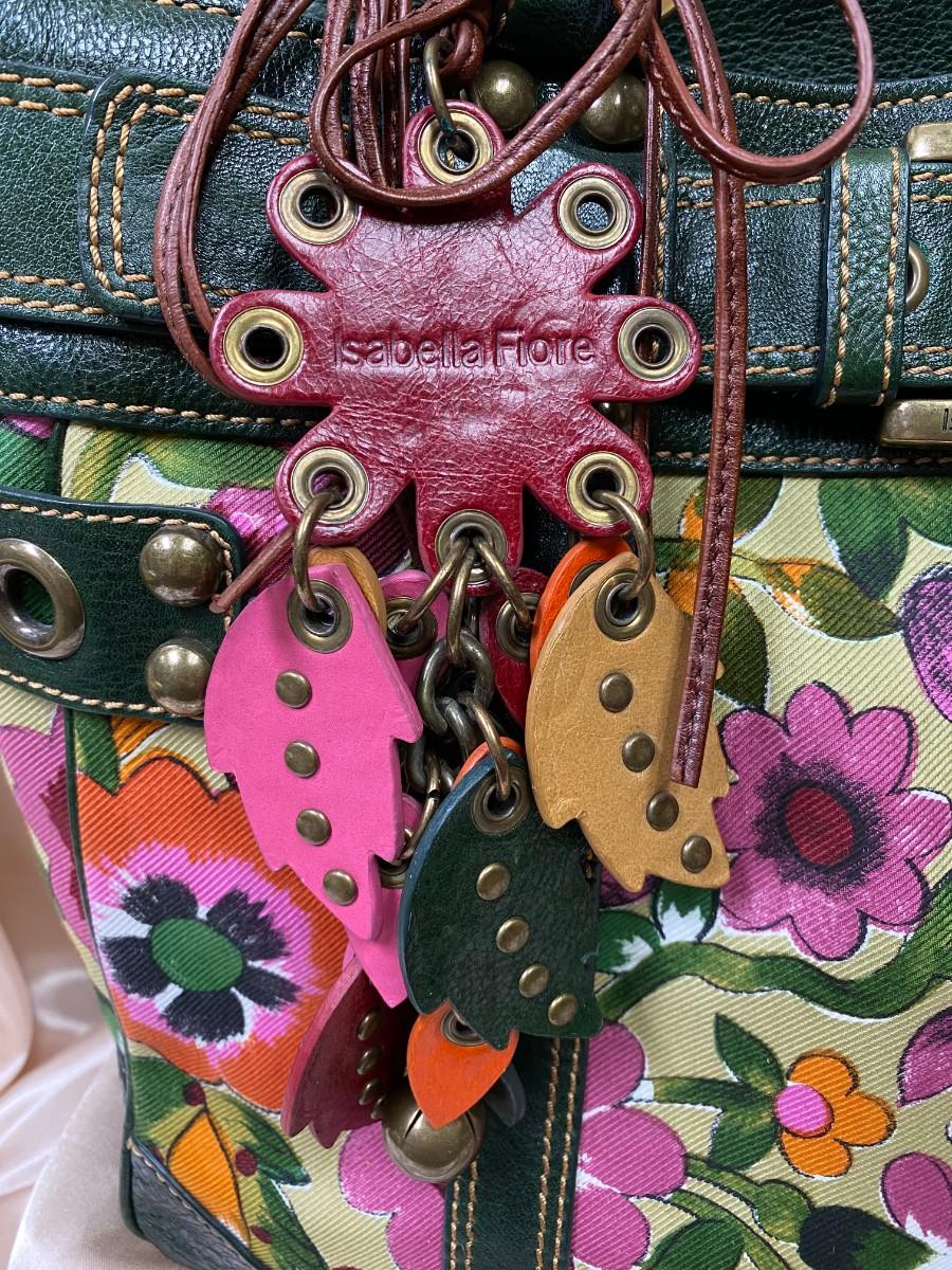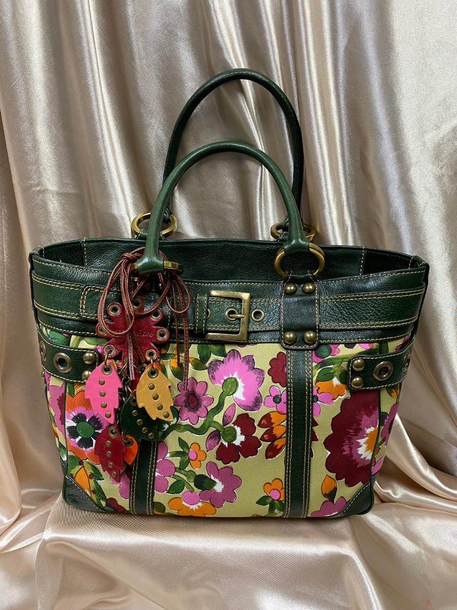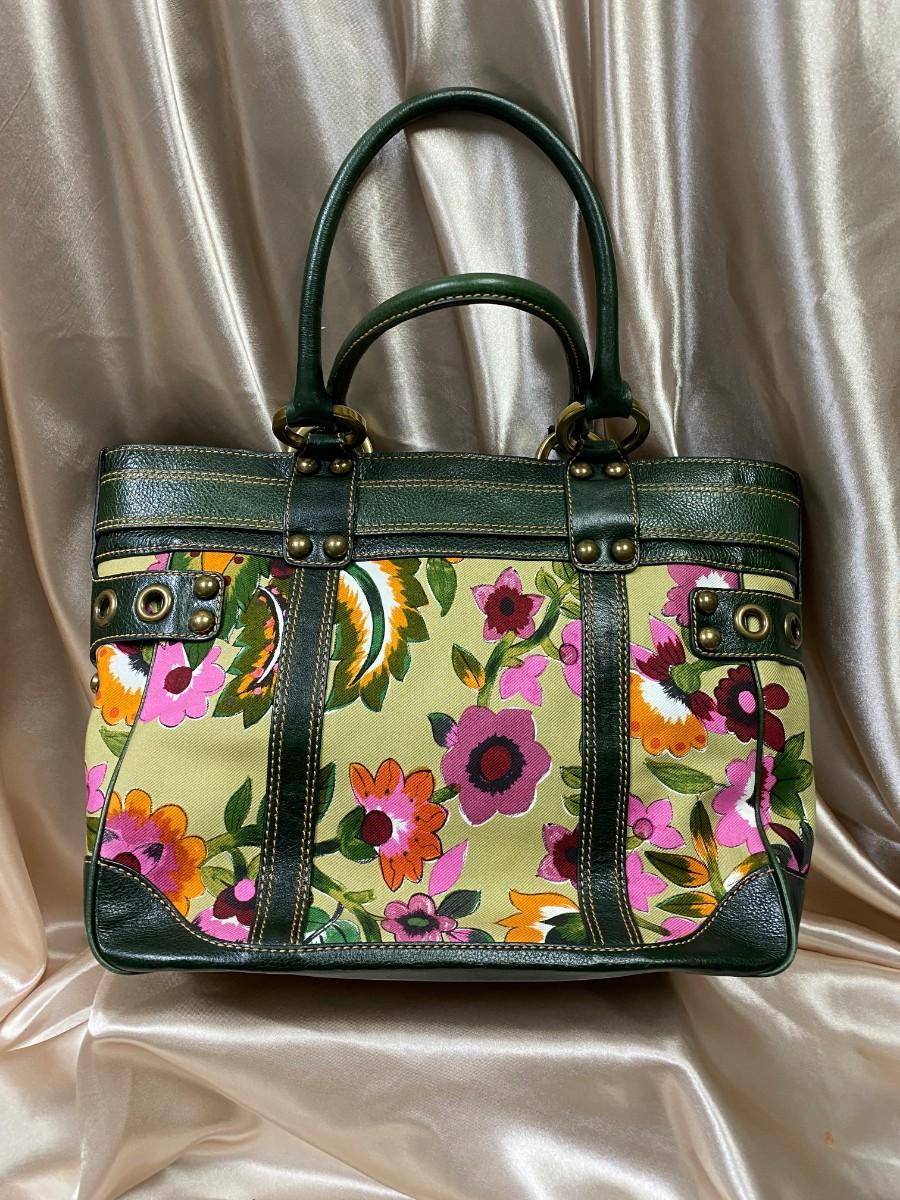 Green leather and canvas, interior zipper pocket, vintage, comes with designer leather tags and leaves. Very good condition, like new. 16 inches by 11 inches by 5 inches. Retailing at $200 to $250
