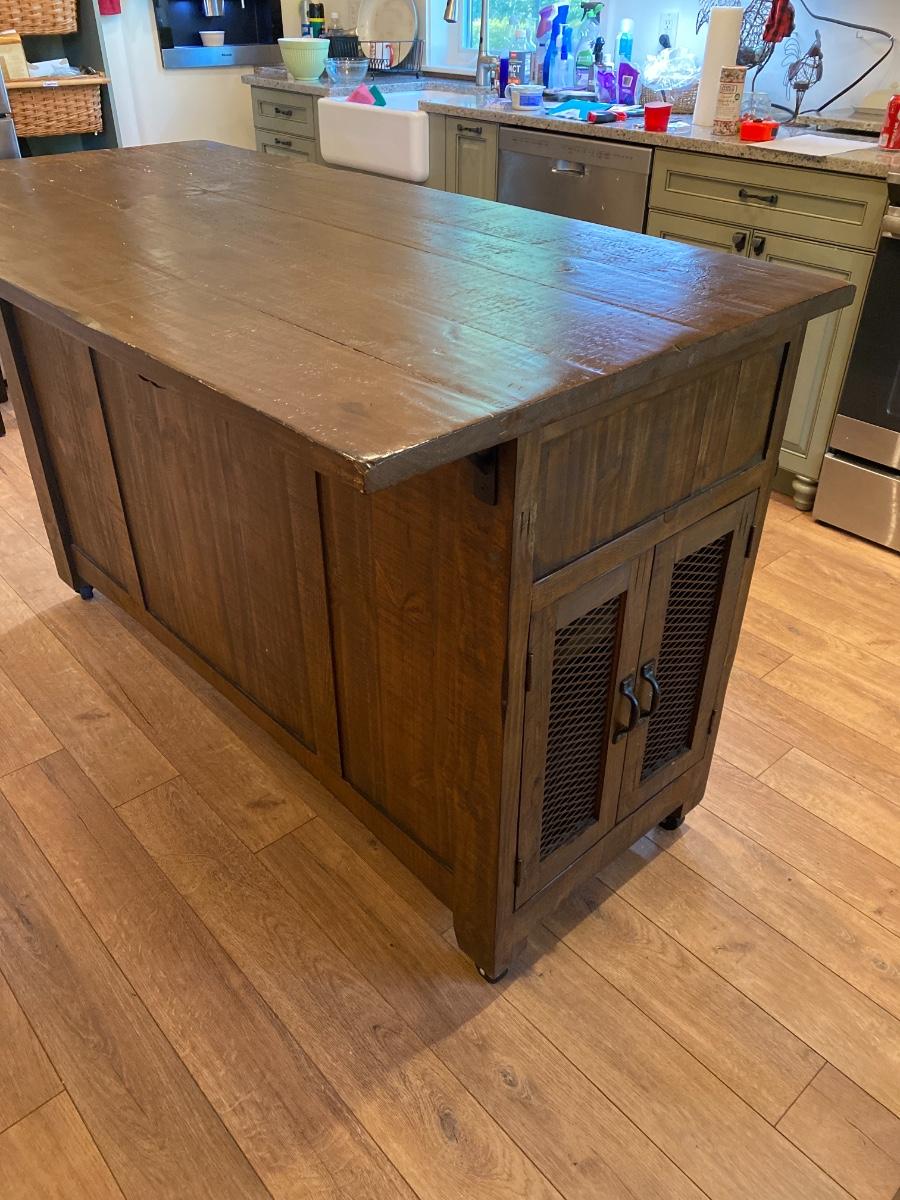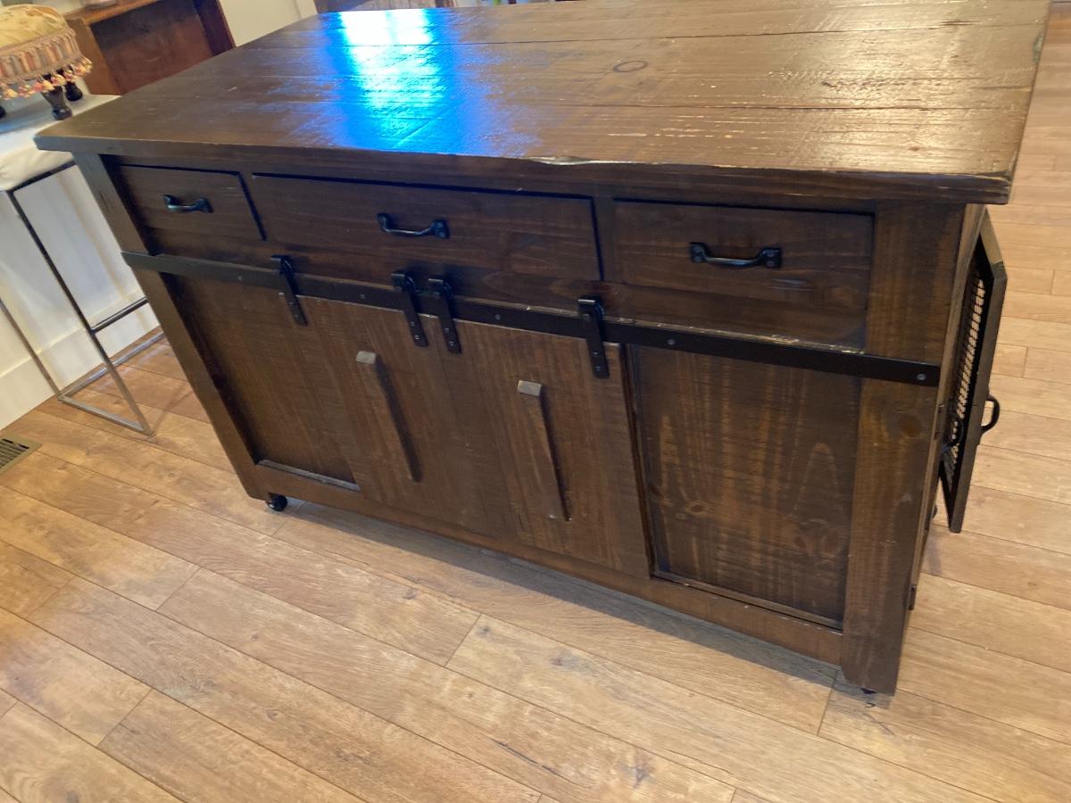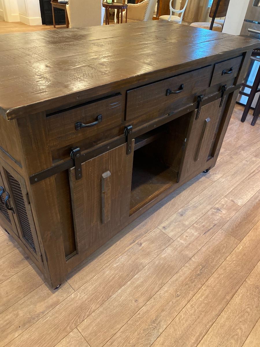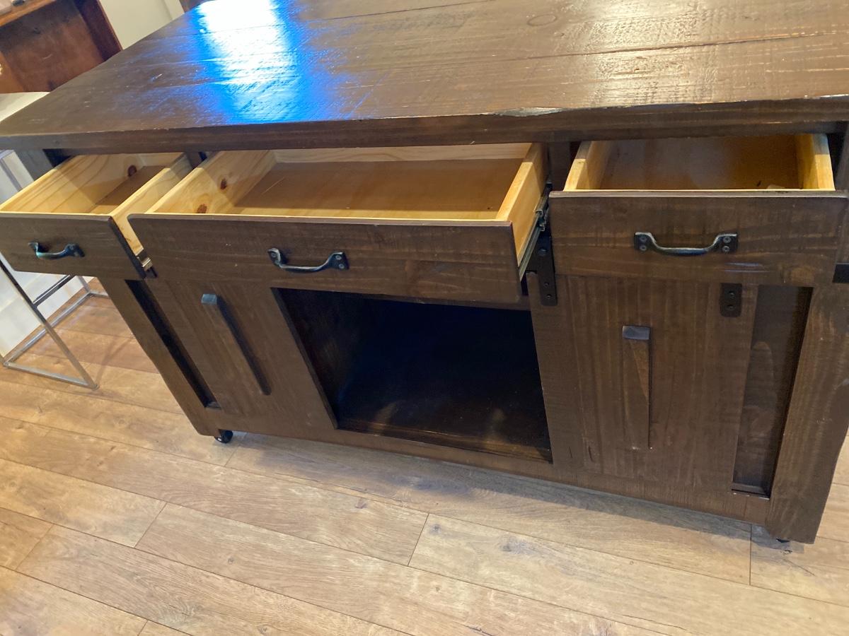 5ft x 30” x 38”h. Three drawers and cabinets on both sides.