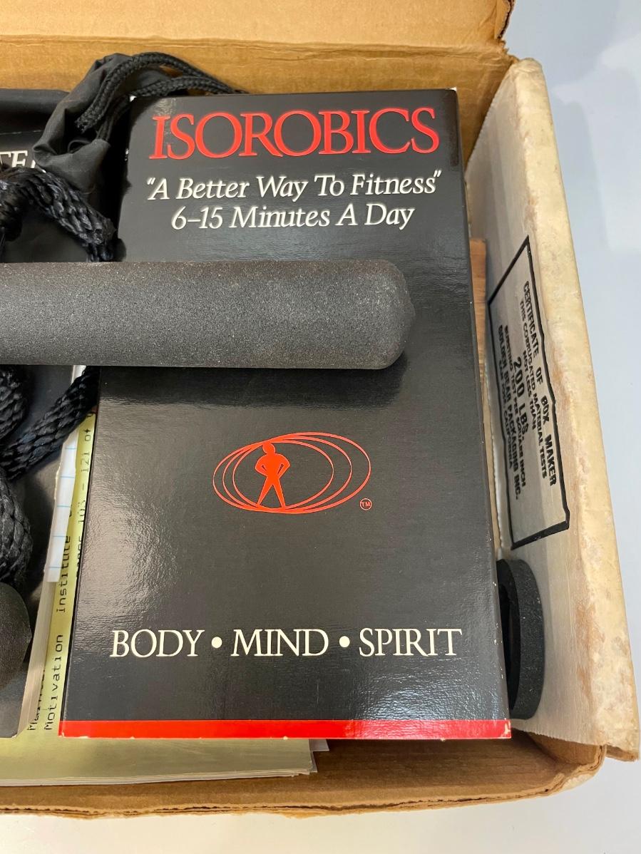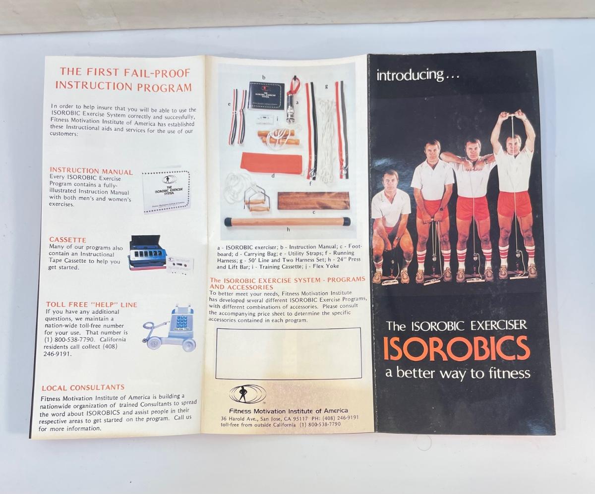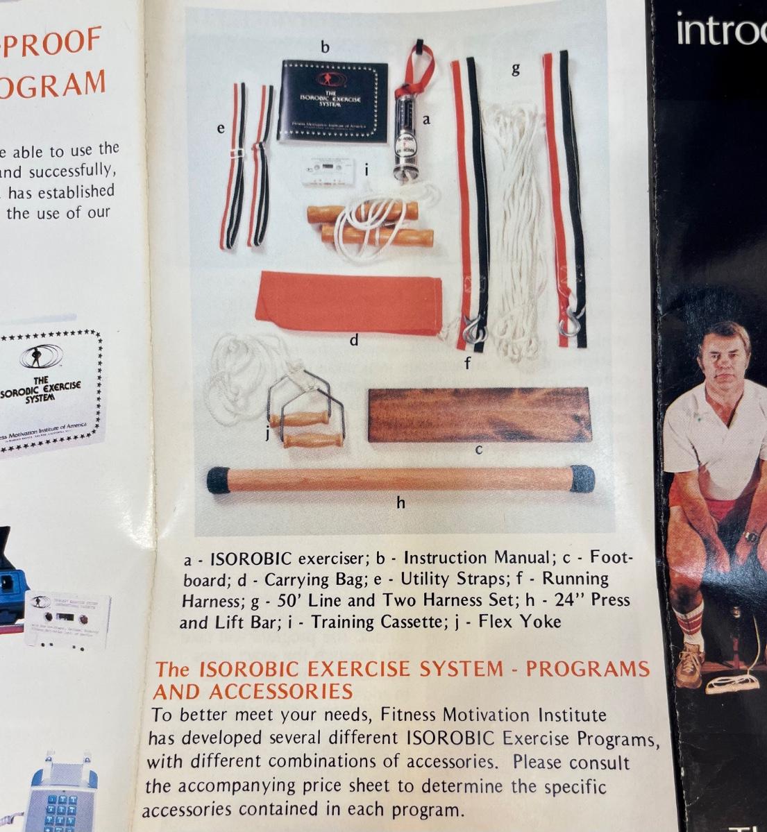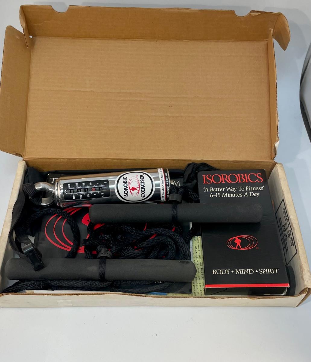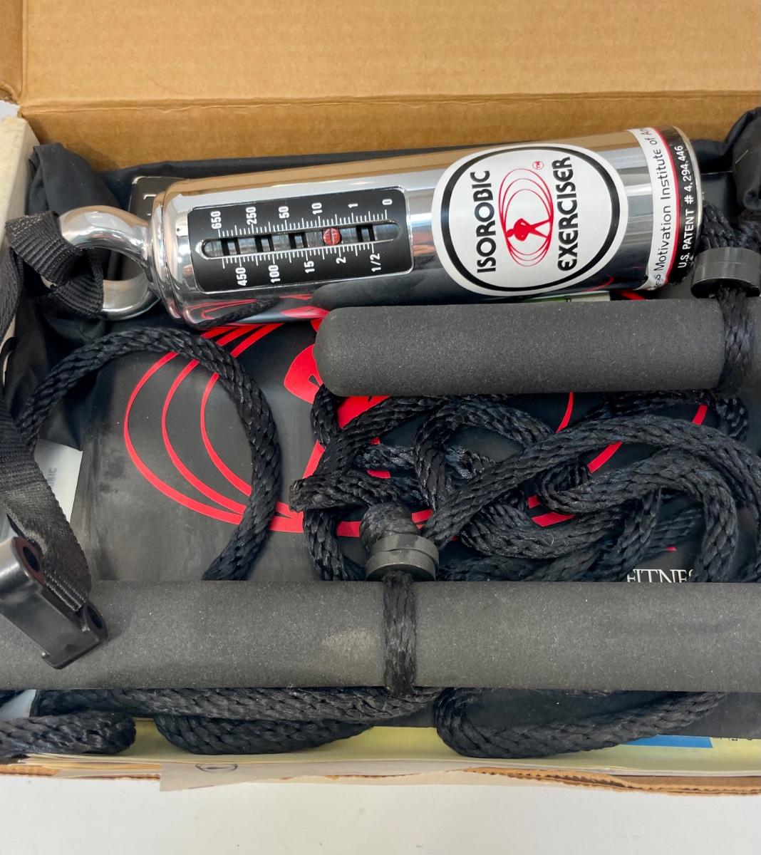 Wall-mounted exercise equipment. Bands, Cords with handles, and tension devices to set different resistance levels. Also instruction booklet, audio tape and VHS follow-along guide. New in box.