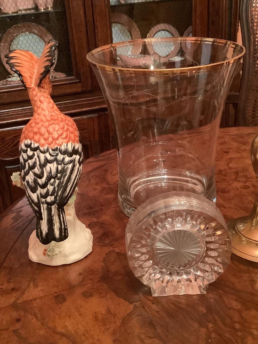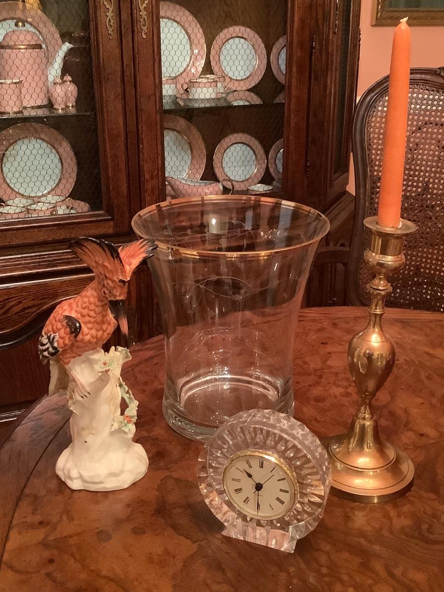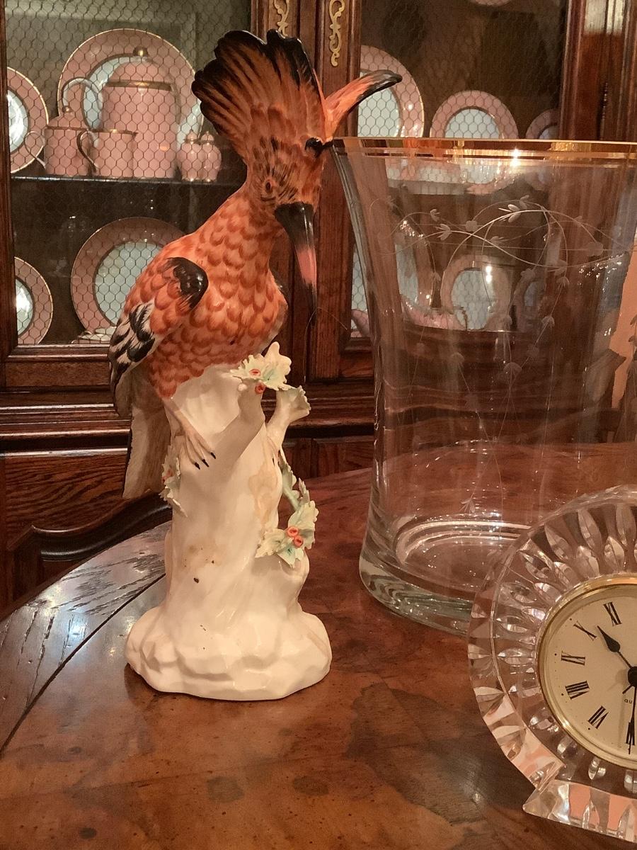 Upupu/Italian figurine of this colorful bird, clock, brass candlesticks, large glass decor