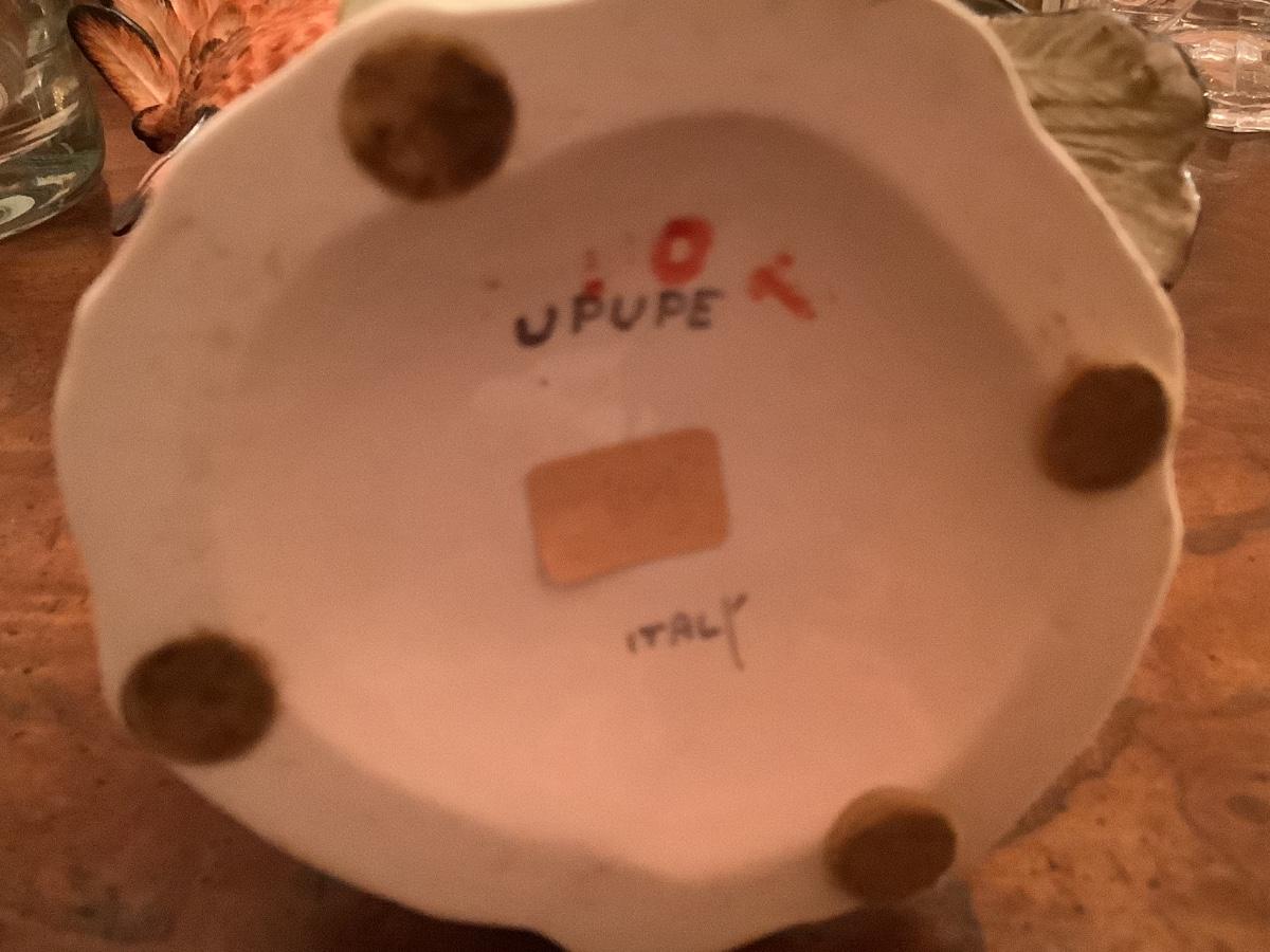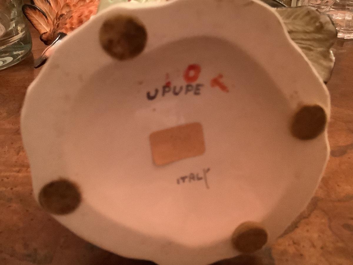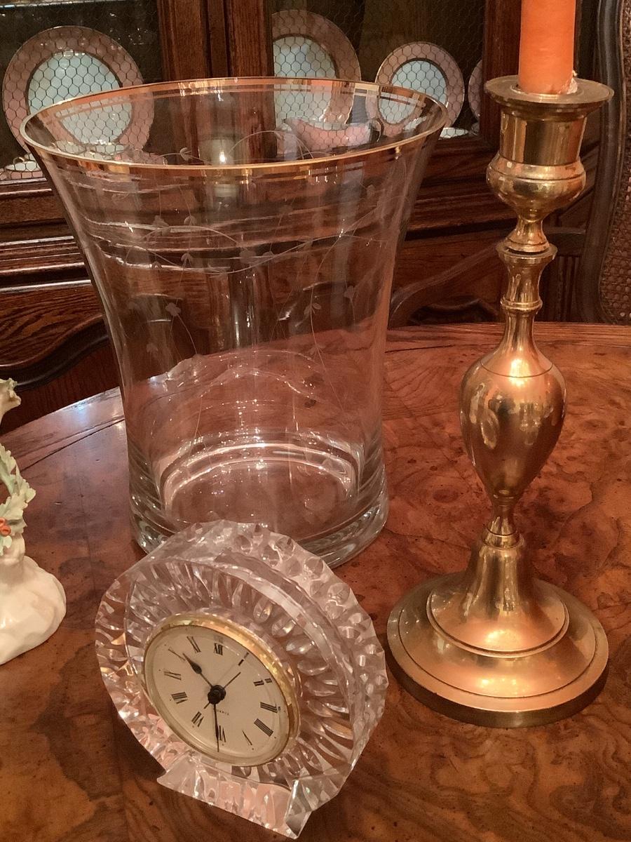Upupu/Italian figurine of this colorful bird, clock, brass candlesticks, large glass decor