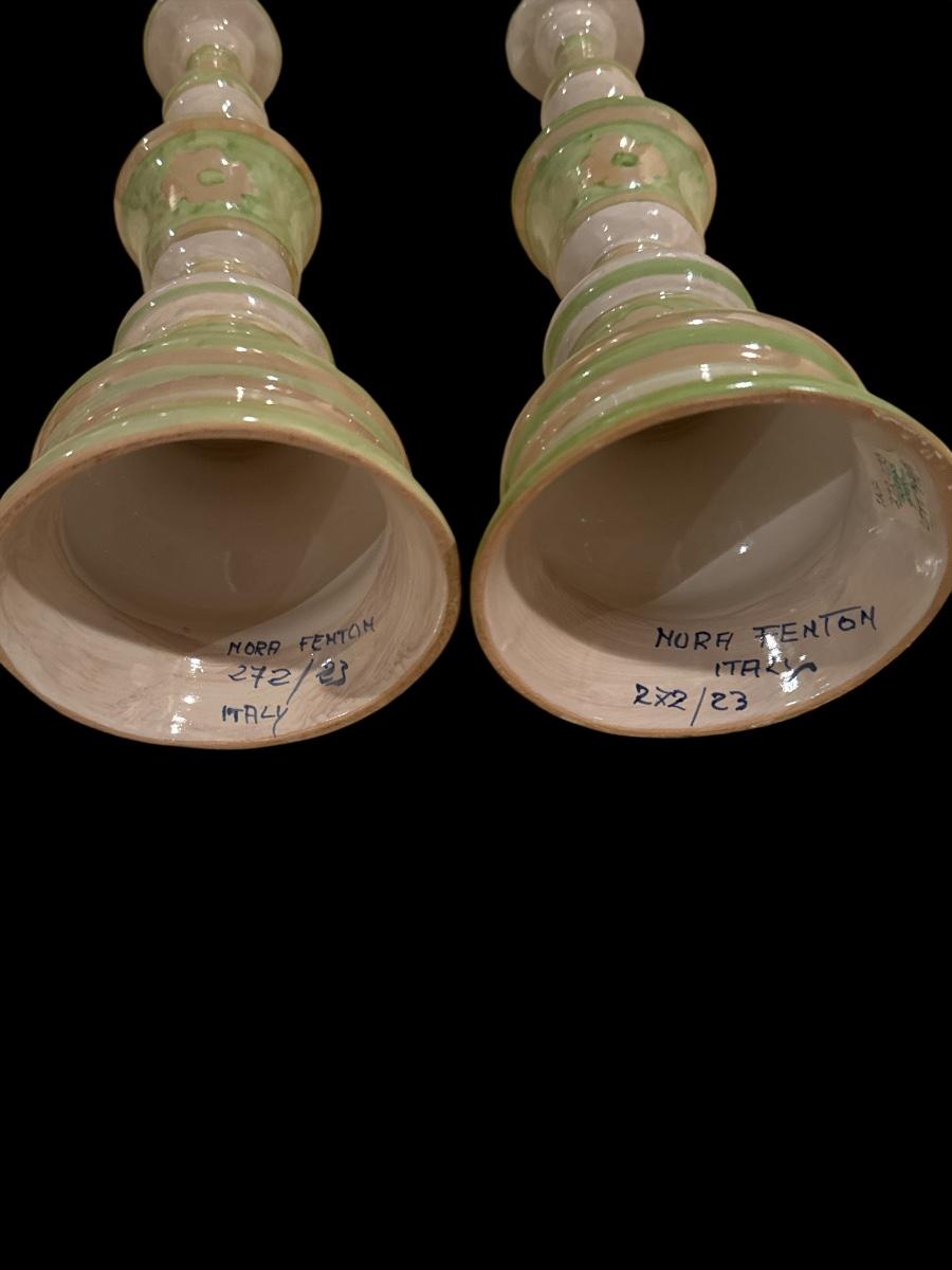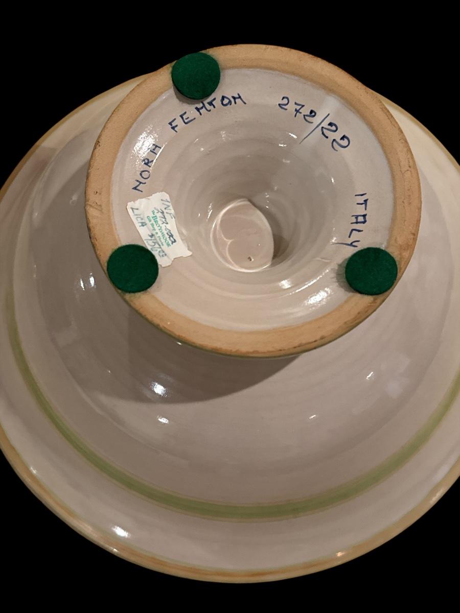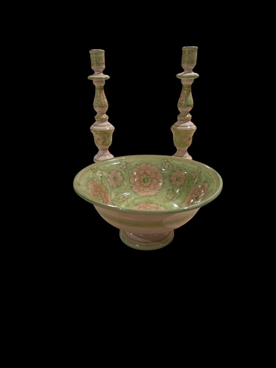 Hand-painted Italian pottery set by Nora Fenton, including a decorative floral bowl and a matching pair of tall candlesticks. Features a soft pink and green glaze with floral motifs. Marked “Italy” and numbered. Elegant, artisan-crafted décor.