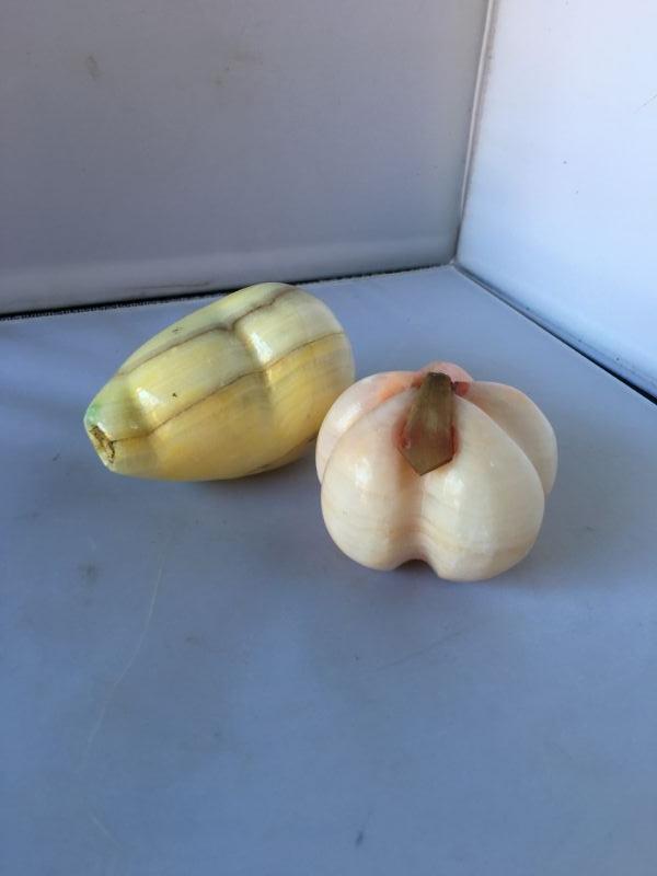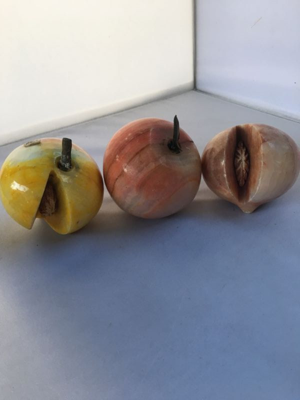 2 peaches with pits showing, 1 with stem, 1 without,both 2.5'', spherical; 1 apple with stem, approximately 3'', spherical; all with slight wear on bottom. a pear and an apple.