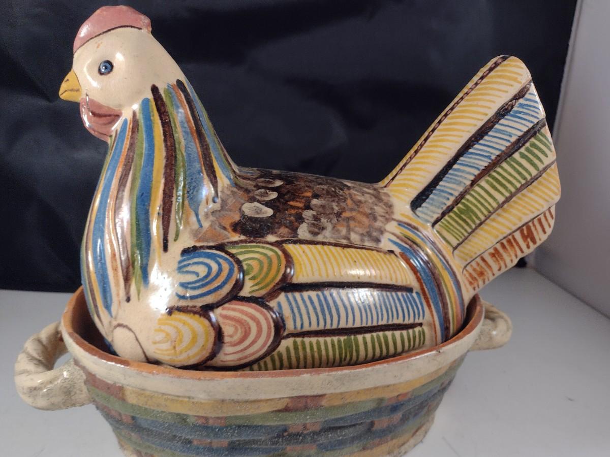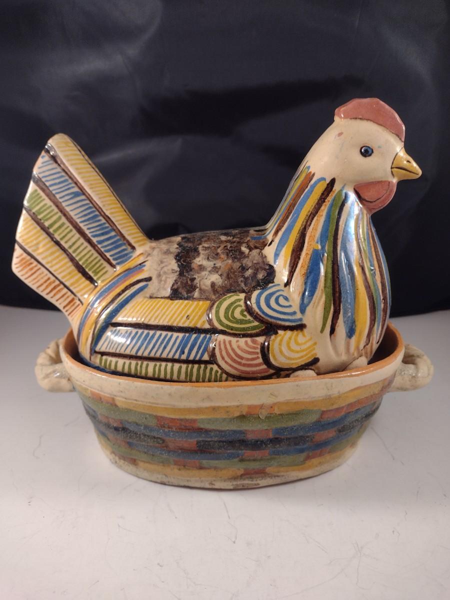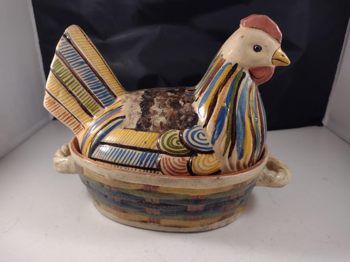 Italian Clay Pottery Hand Painted Hen on a Next Large Bowl