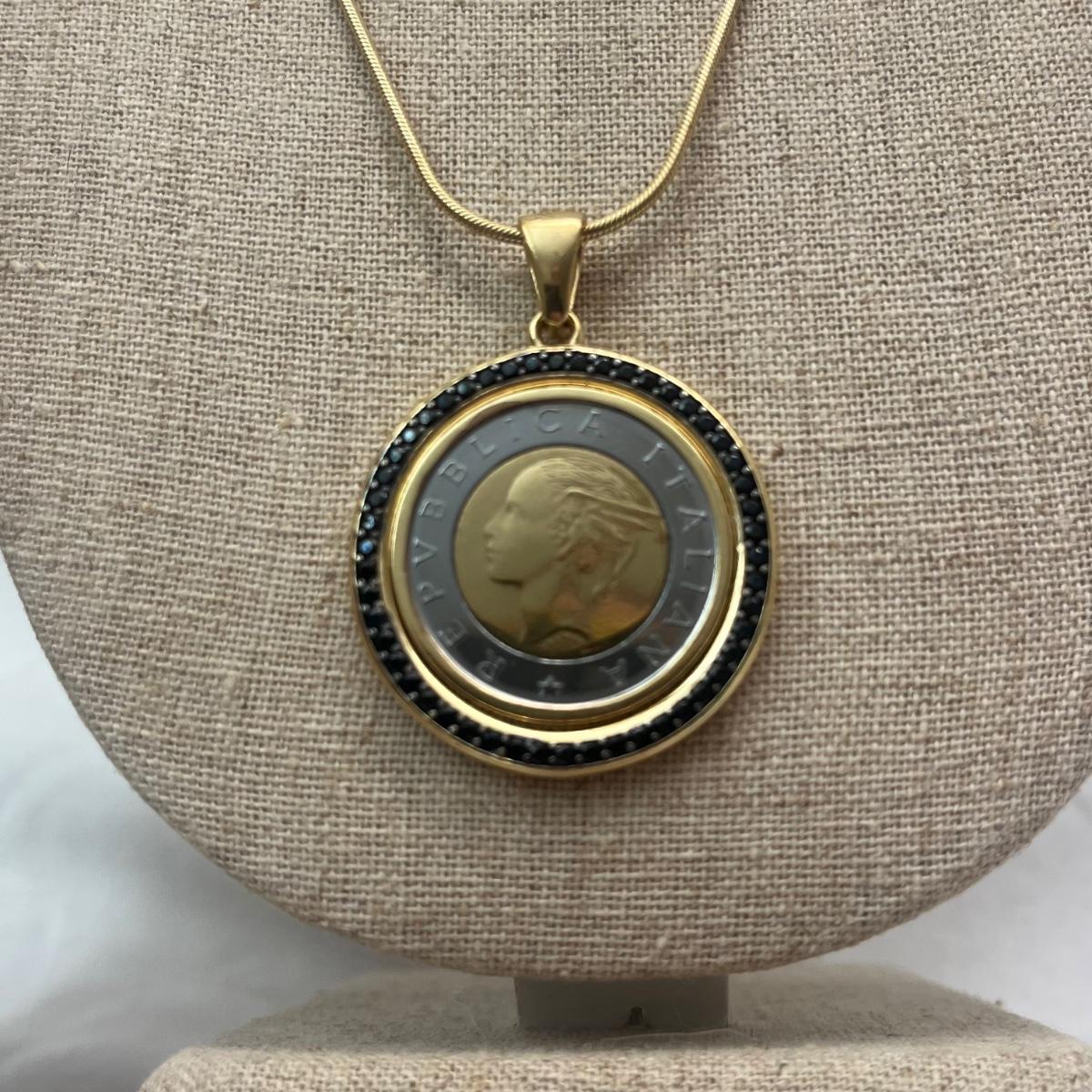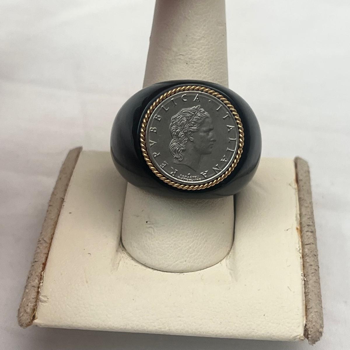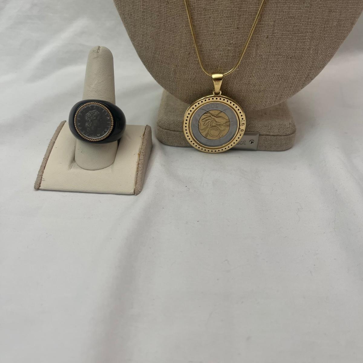 Lot includes a size 11 black resin like ring with Italian coin that is marked 14k and an Italian gold colored coin necklace that is marked Belleezza, Italy that measures 24” long. Coin rotates In pendant, see pictures
